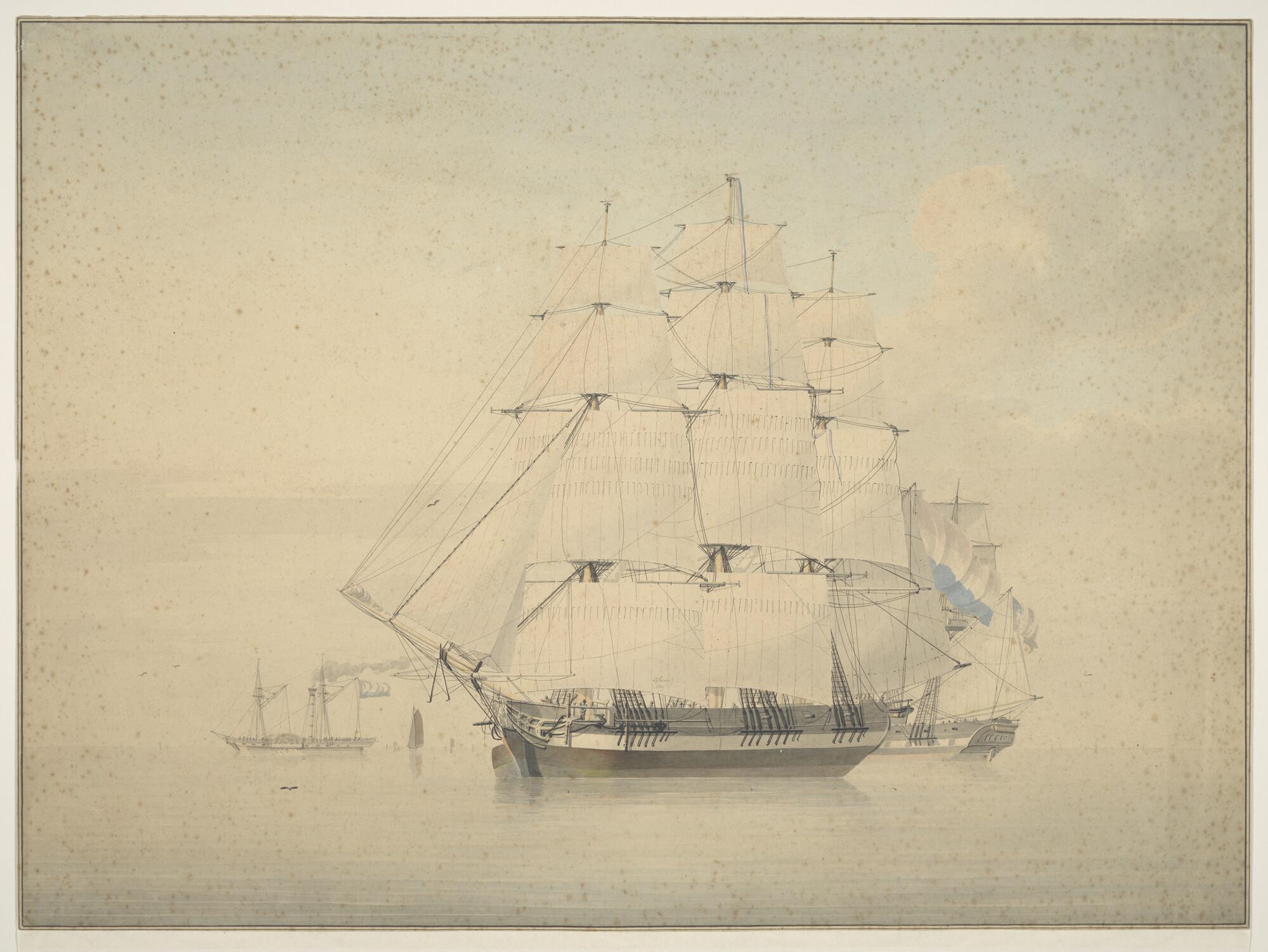 Een Nederlands koopvaardijfregat met op de achtergrond een Amerikaans zeilschip en links een raderstoomschip.