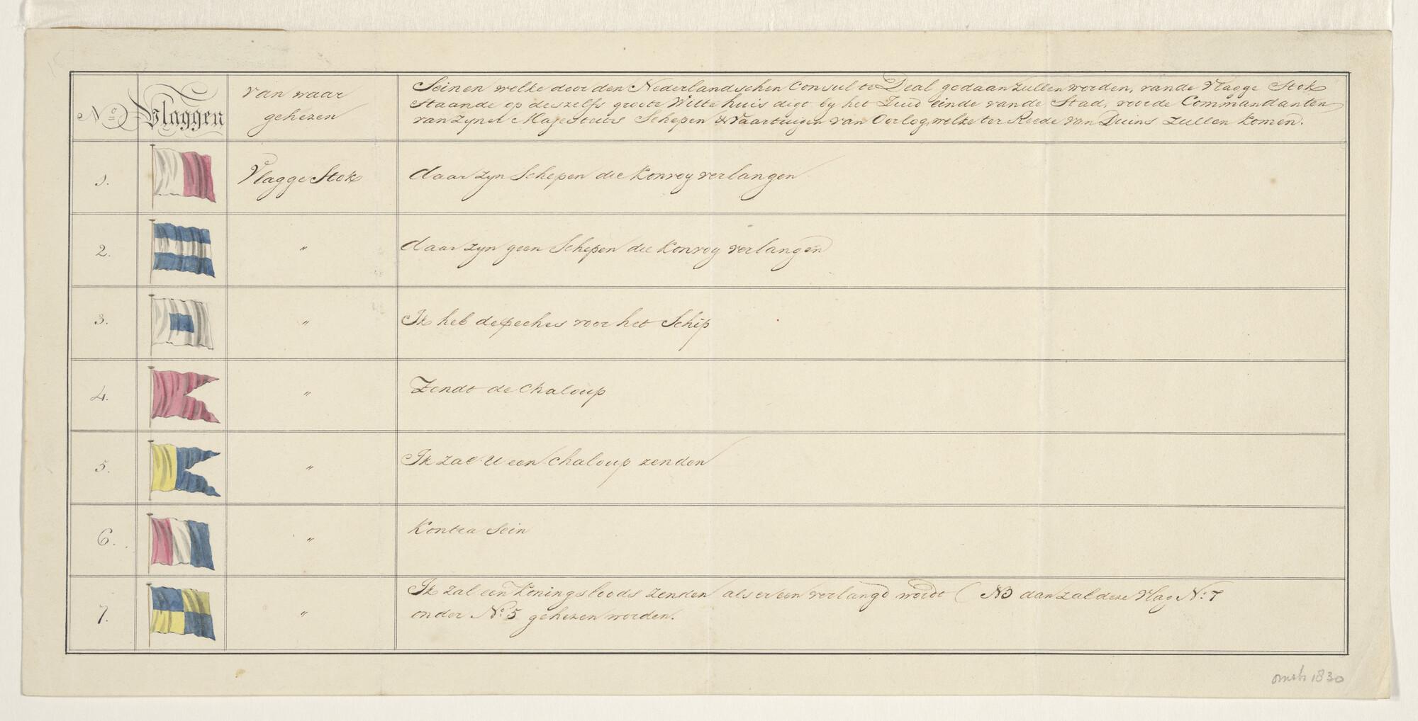 Vlaggenkaart met seinen door den Nederlandschen consul te Deal gadaan zullen worden, van de vlaggestok op dezelfde Witte Huis digt bij het Zuideinde van de stad. [enz.].