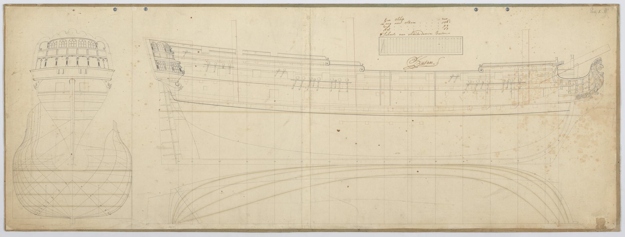 Zijaanzicht, achteraanzicht, spantenraam en waterlijnen van een oorlogsschip van 42 stukken. Afmetingen 136 x 39 x 17 Amsterdamse voet.