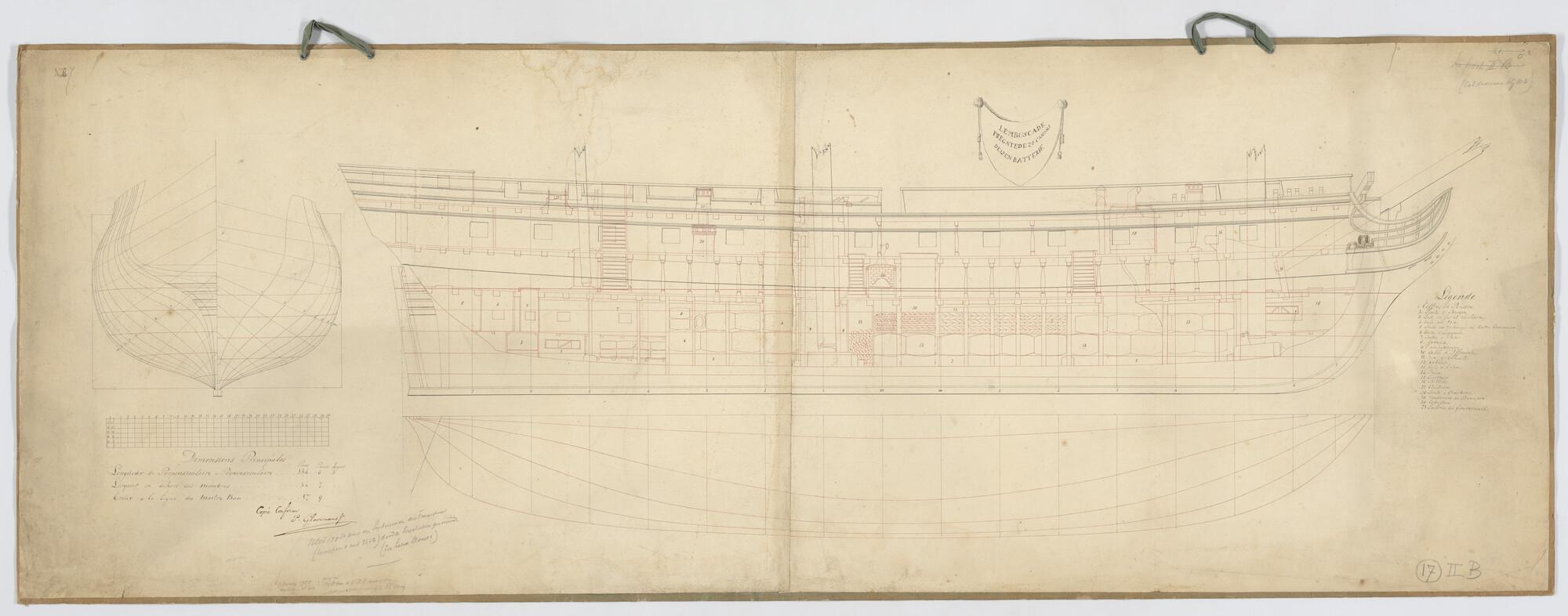 Lijnenplan met verticale langsdoorsnede en spantenraam van het Franse fregat 'L'Embuscade' van 36 stukken. Afmetingen van het schip 134.8 x 34.7 x 17.9 voet.