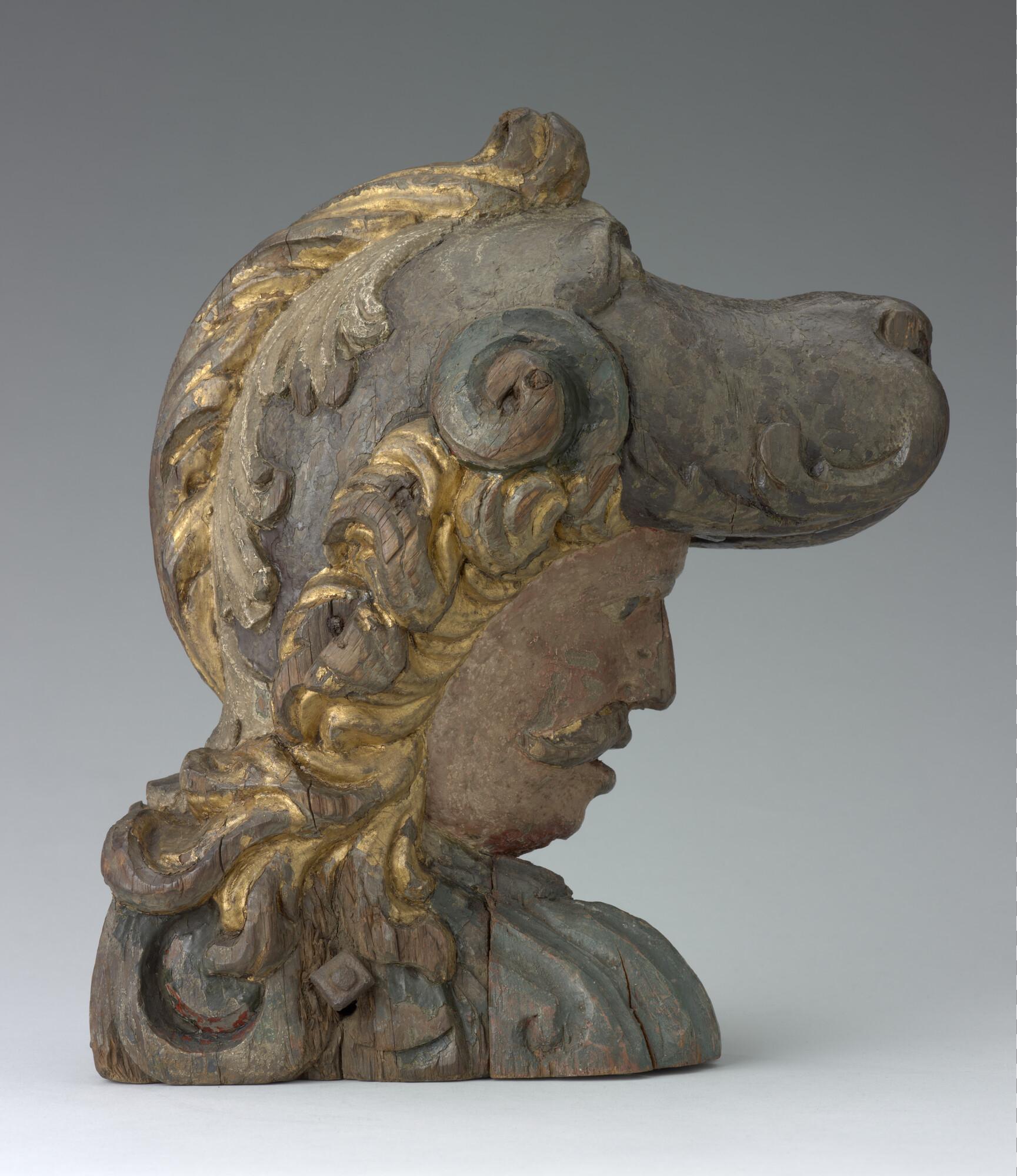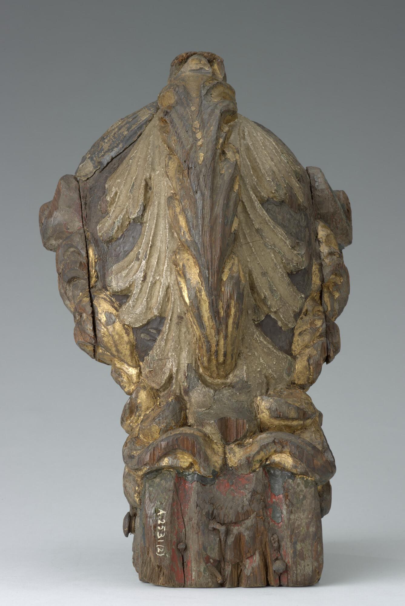 Roerkop in de vorm een mannenhoofd met een gepluimde helm die de bovenkaak van een hond voorstelt. De voorkant van de helm een en de voet zijn aan weerskanten versierd met C-voluten.
