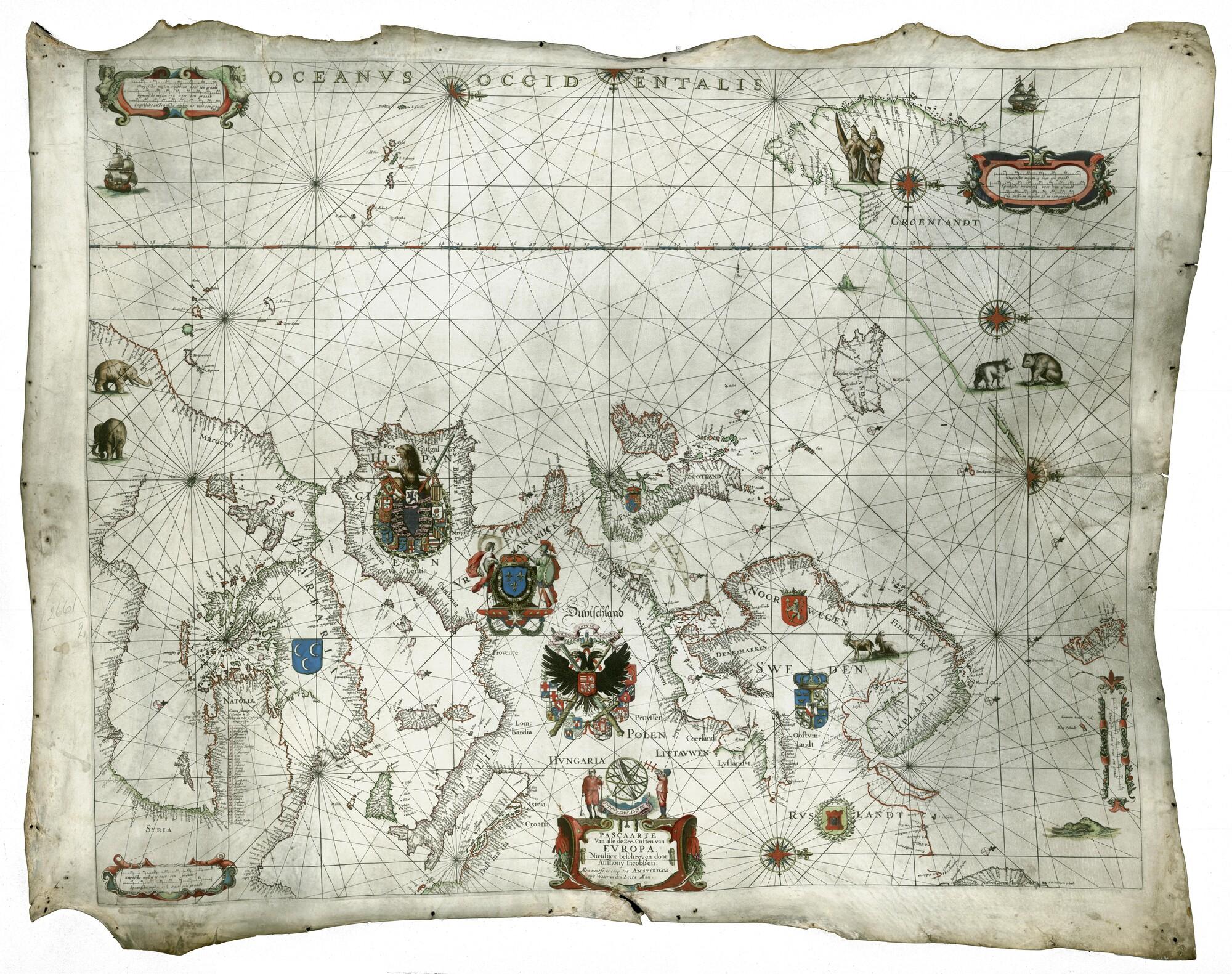 Met de hand gekleurde gekleurde Europese paskaart op perkament door Anthonie Jacobsz te Amsterdam. 1655 (schaal 1 op 7.000.000).