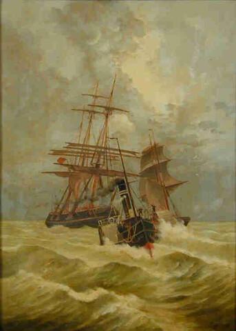 Een Engelse koopvaardijbark gesleept door een radersleepboot.