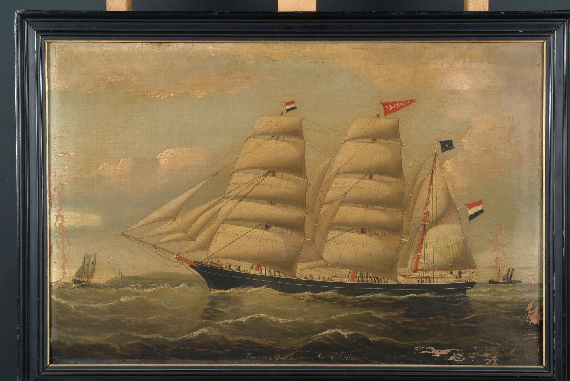 Het clipperbarkschip Thorbecke VII onder kapitein J.F. Höper. Gebouwd 1885, verkocht naar Napels 1894.