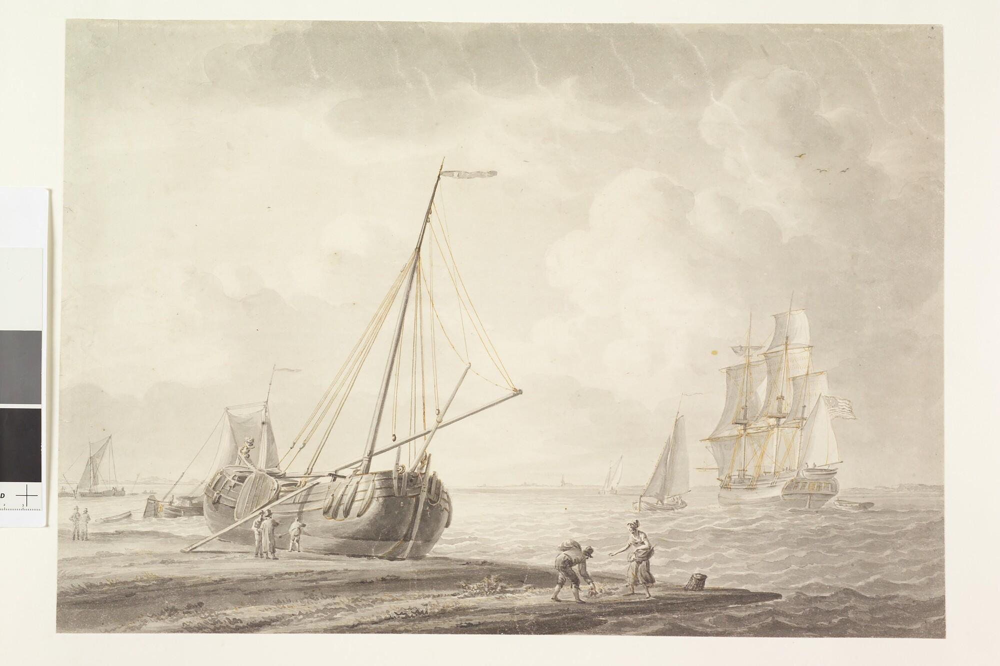 Een paviljoenpoon op het droge, rechts een Amerikaans fregatschip uitzeilend.