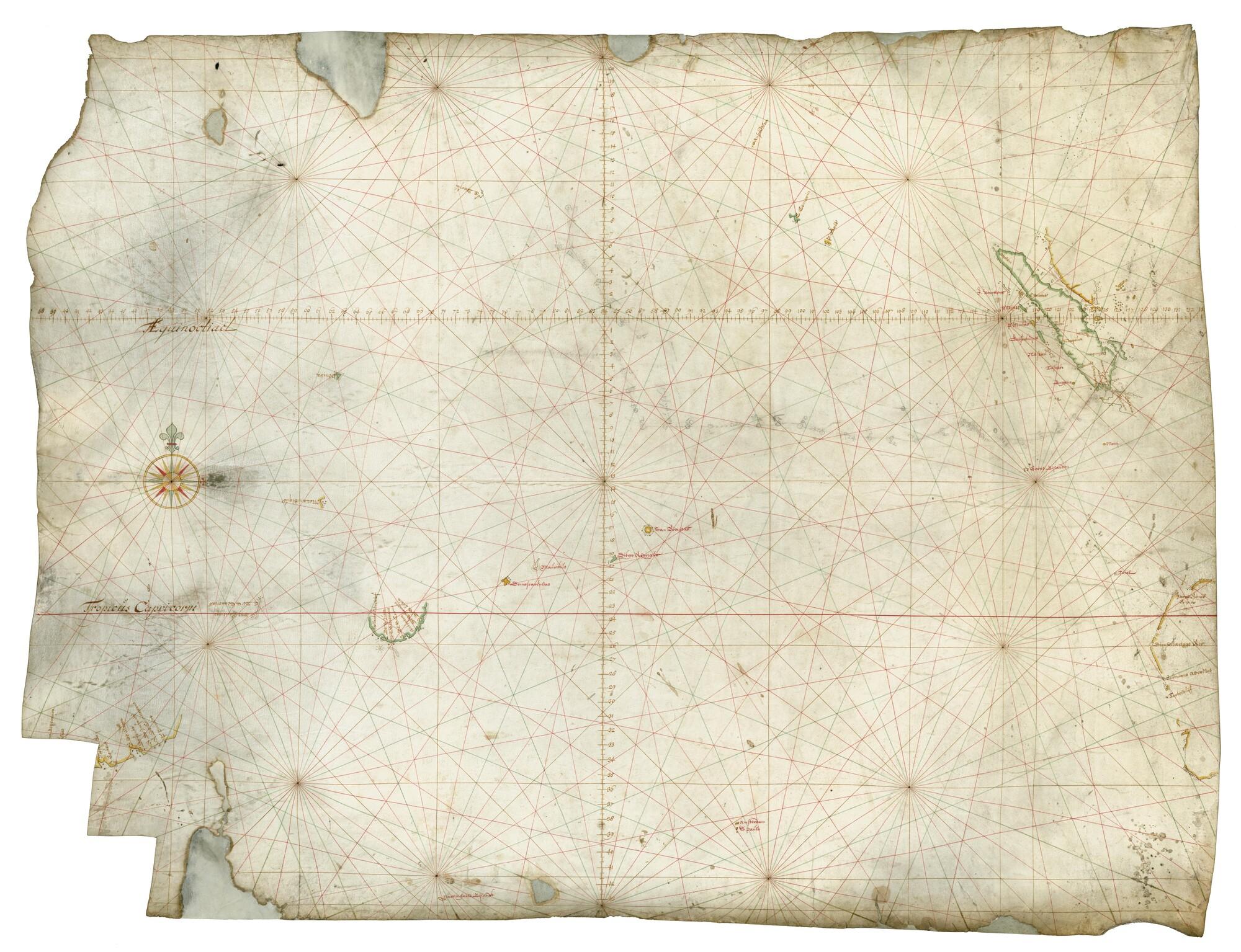 Zeekaart, 1650 - 1700 van de Indische Oceaan door onbekende Nederlandse maker. Op de achterzijde in ms de naam Bonté. Geizen deze naam kan de kaart gebruikt zijn aan boord van een Frans schip. De kaart bevat de middagposities en een koerslijn van een reis van Straat Soenda in de richting van Ceylon of de ...