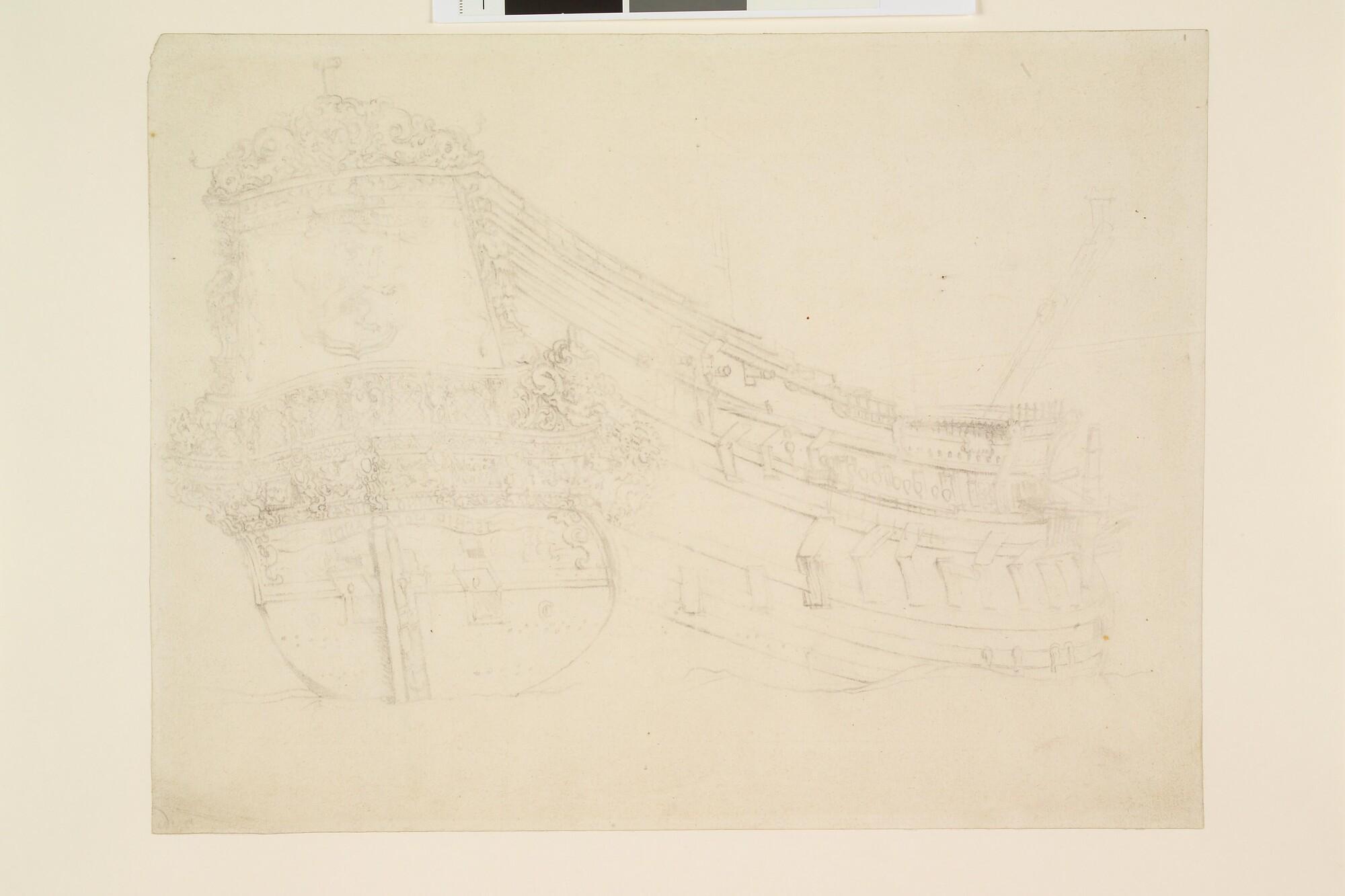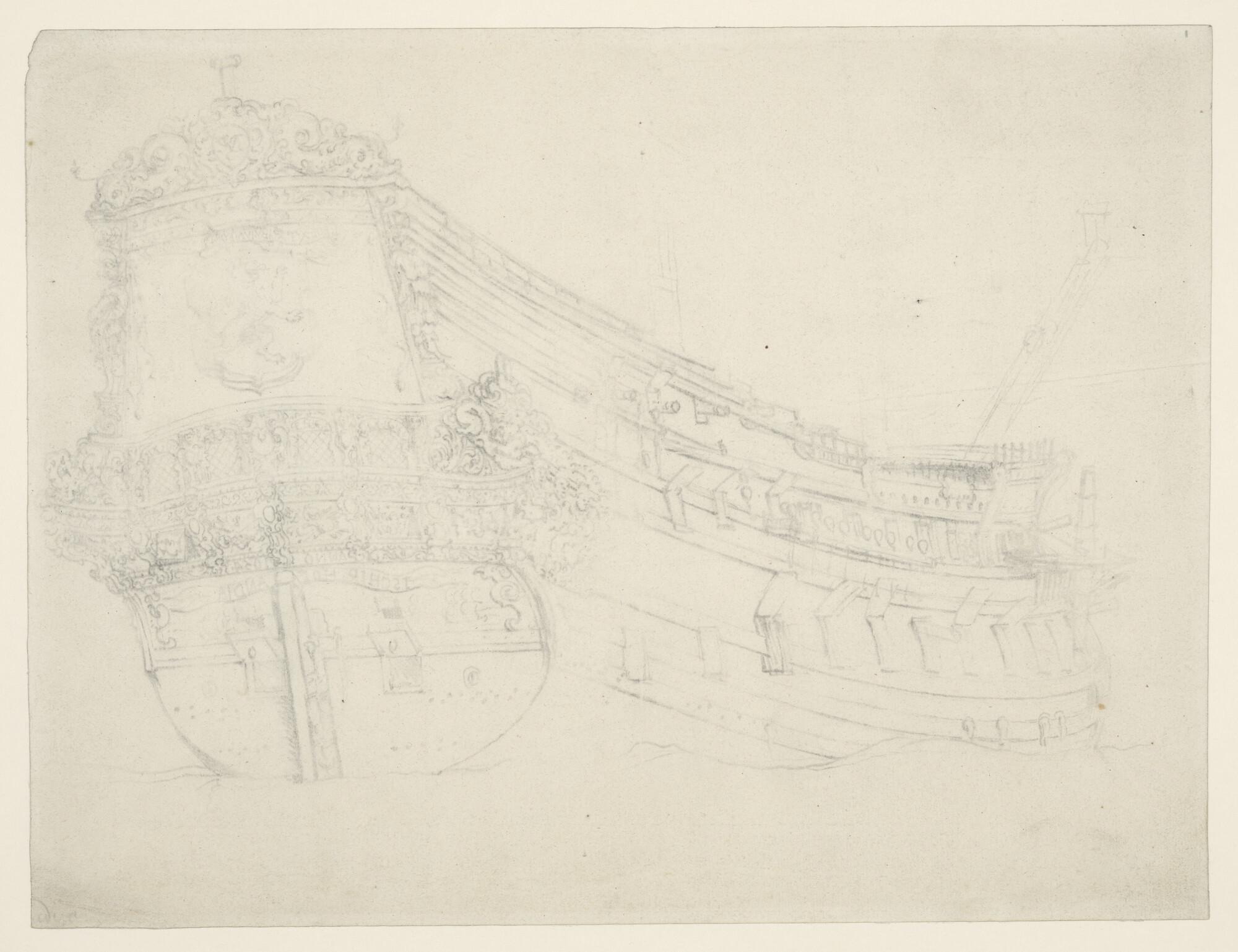 Het schip Hollandia bewapend met 54 stukken, gezien van bakboord achter.