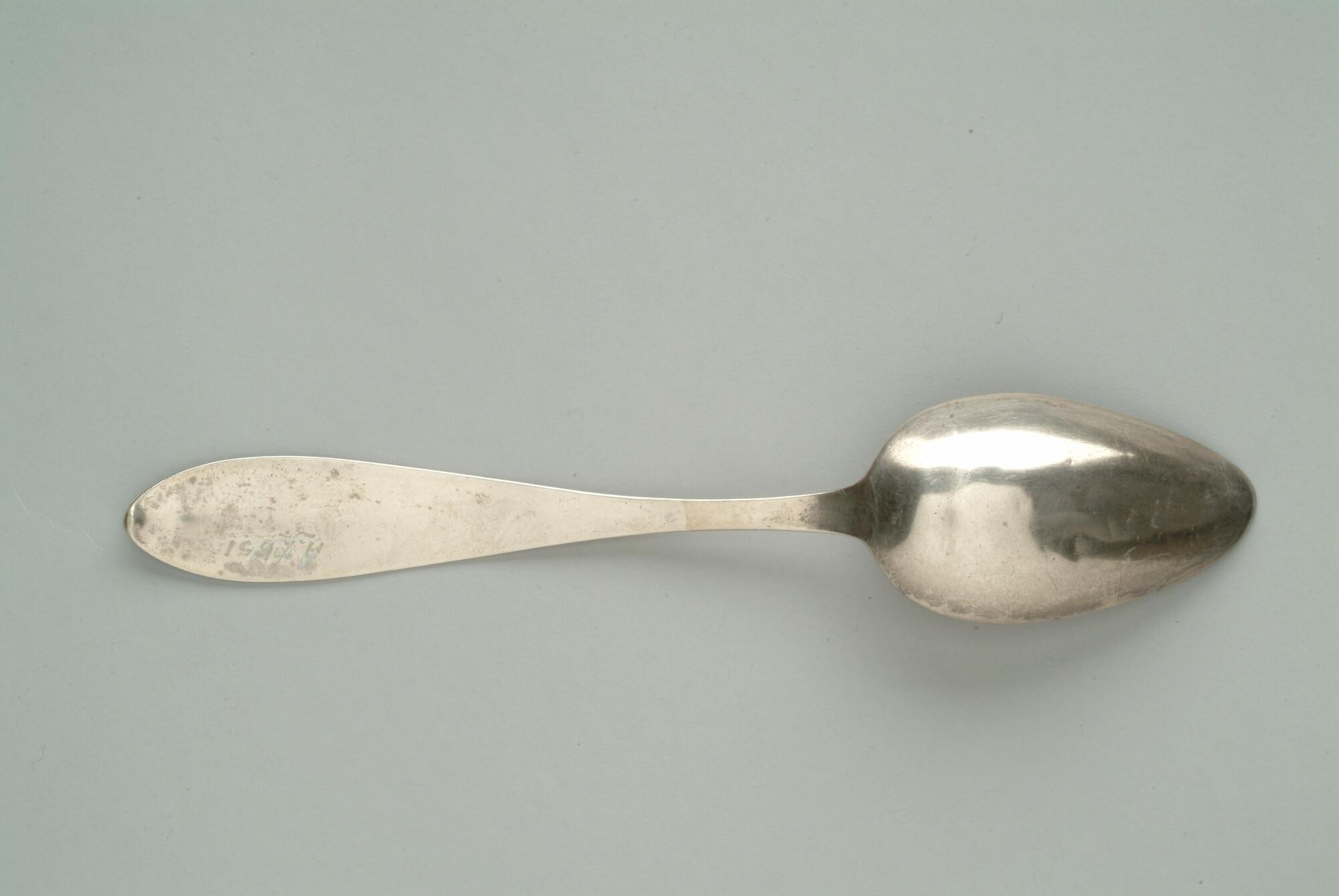Lepel, zilver, ovale bak en platte steel. Vz. in sierlijk handschrift op steel: "F. v. Dadelsen Schiffs Makler Stettin.". Dit type lepel werd ten geschenke gegeven aan gezagvoerders van koopvaardijschepen.