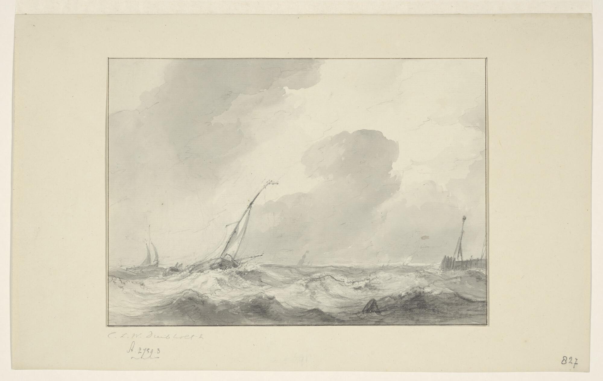 Binnenschip nabij een havenhoofd. [Verso: schepen in een storm.]