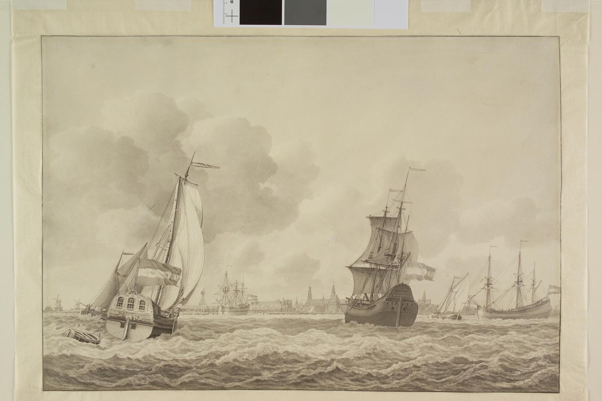 Een spiegeljacht van de VOC, twee katschepen en een damloper daartussen op de rede van Hoorn. Op achtergrond de Hoornse haven met twee vuurbakens.
