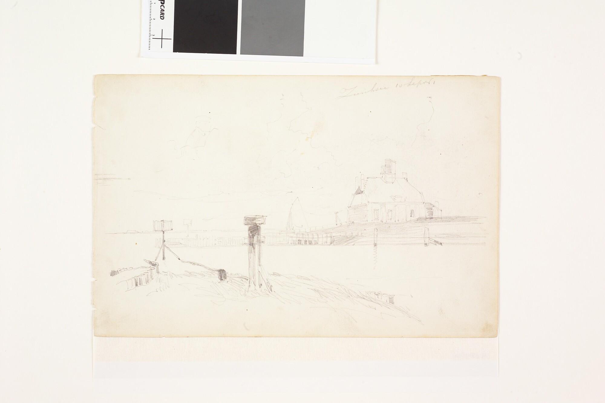 Tekening van de haveningang van Zierikzee en verso twee stadsgezichten van Amsterdam(?).