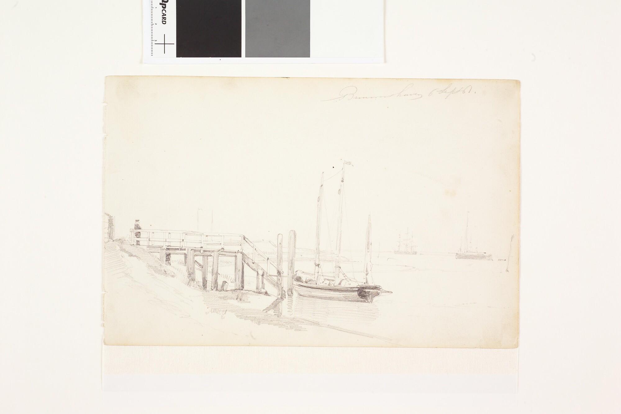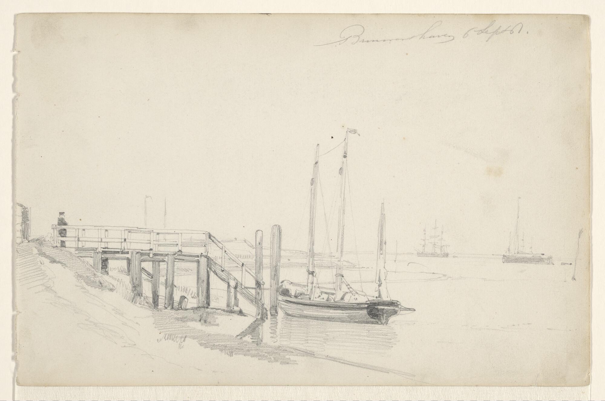 De rede van Brouwershaven. [Verso: twee schetsen, het achterdeel van een raderschip en de bovenzijde van een gevelrij (Vlissingen ?).].
