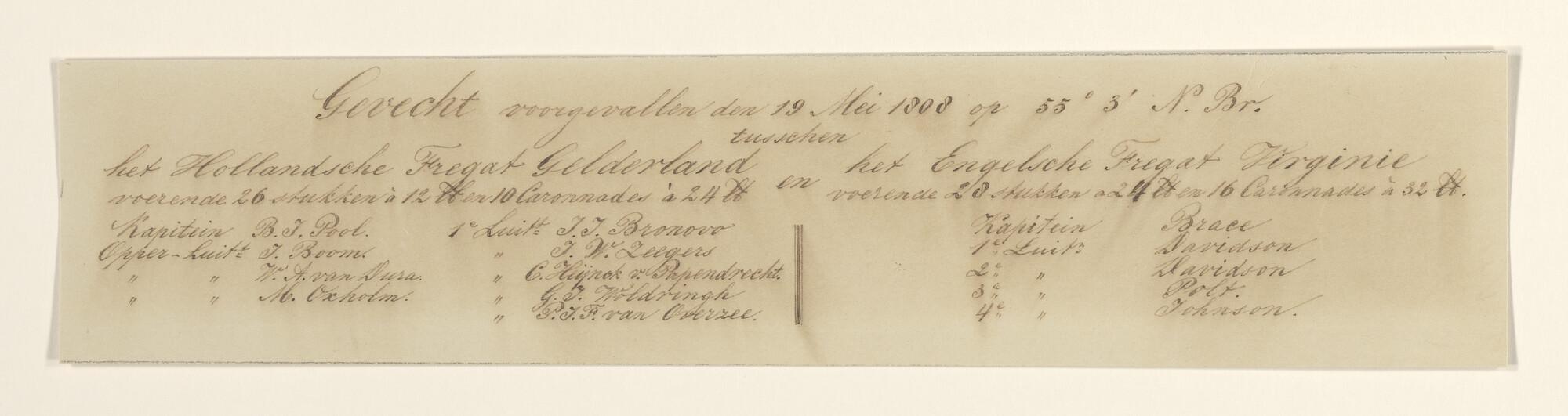 Einde van het gevecht tussen de "Gelderland" en het Engelse fregat "Virginie" op 19 mei 1808 ten zuidwesten van Ierland. links het brandend wrak van de 'Gelderland'. Met officierslijst.