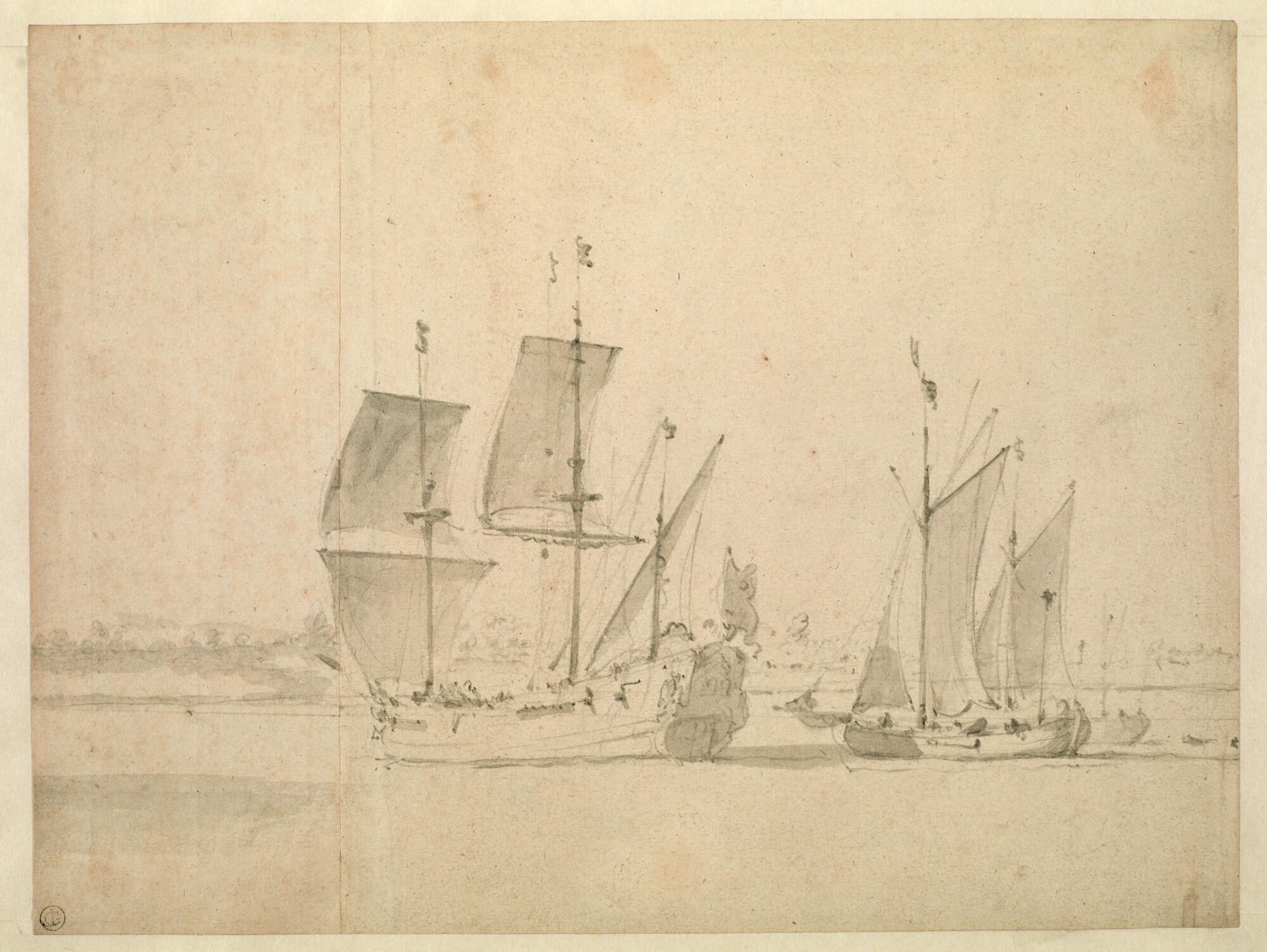 Een koopvaarder en twee galjootschepen op een rede.