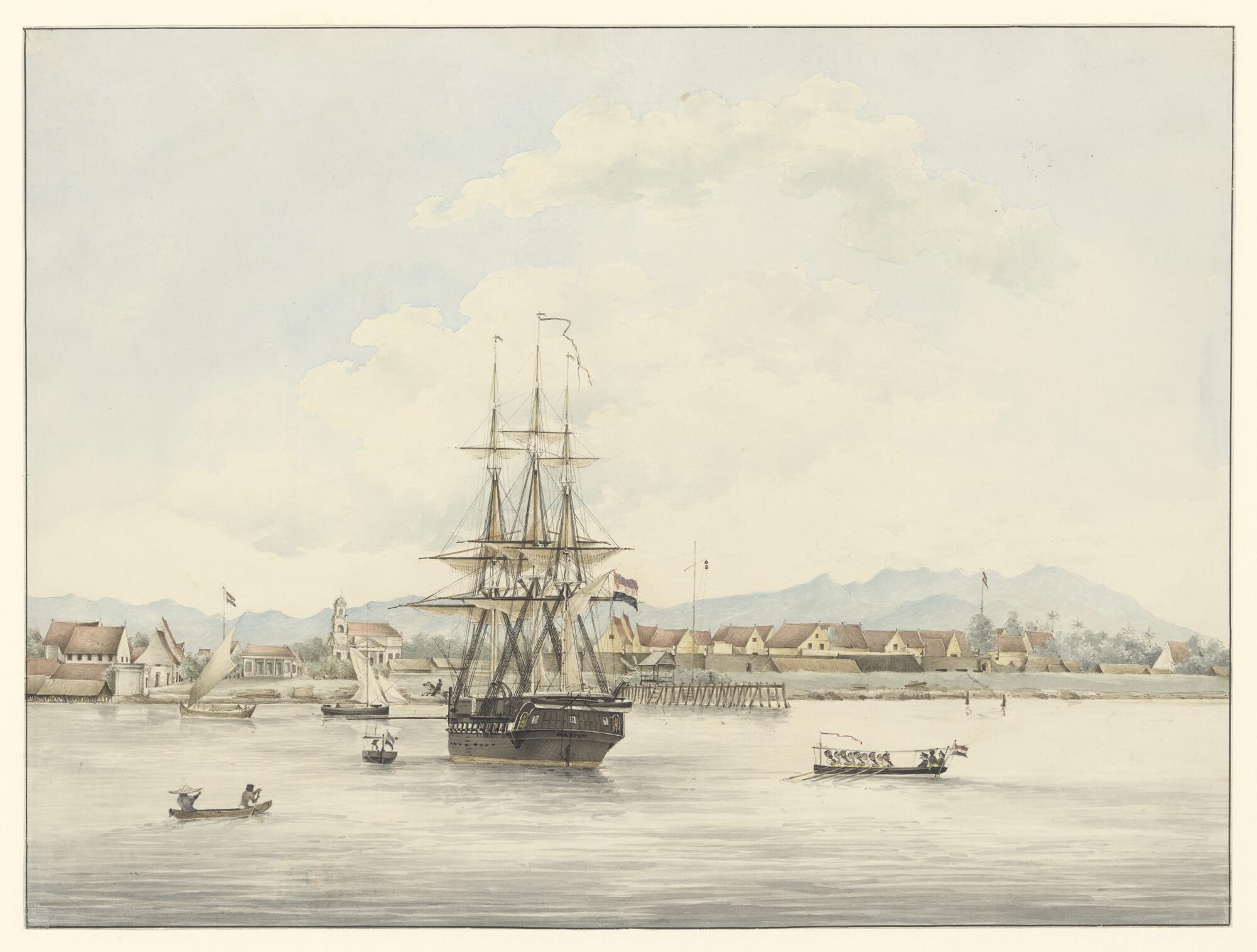 Kuilkorvet Zr.Ms. "Argo" ten anker op de rede van Makassar.