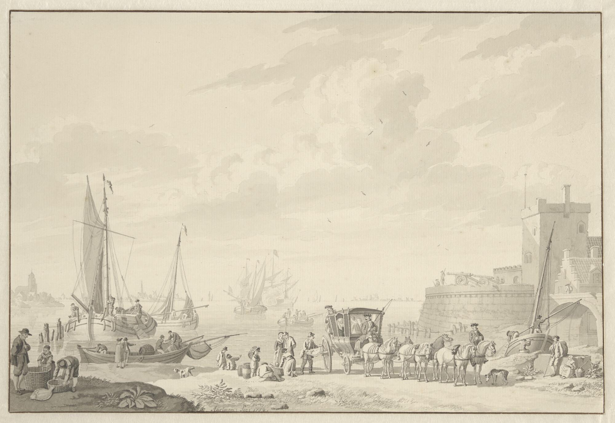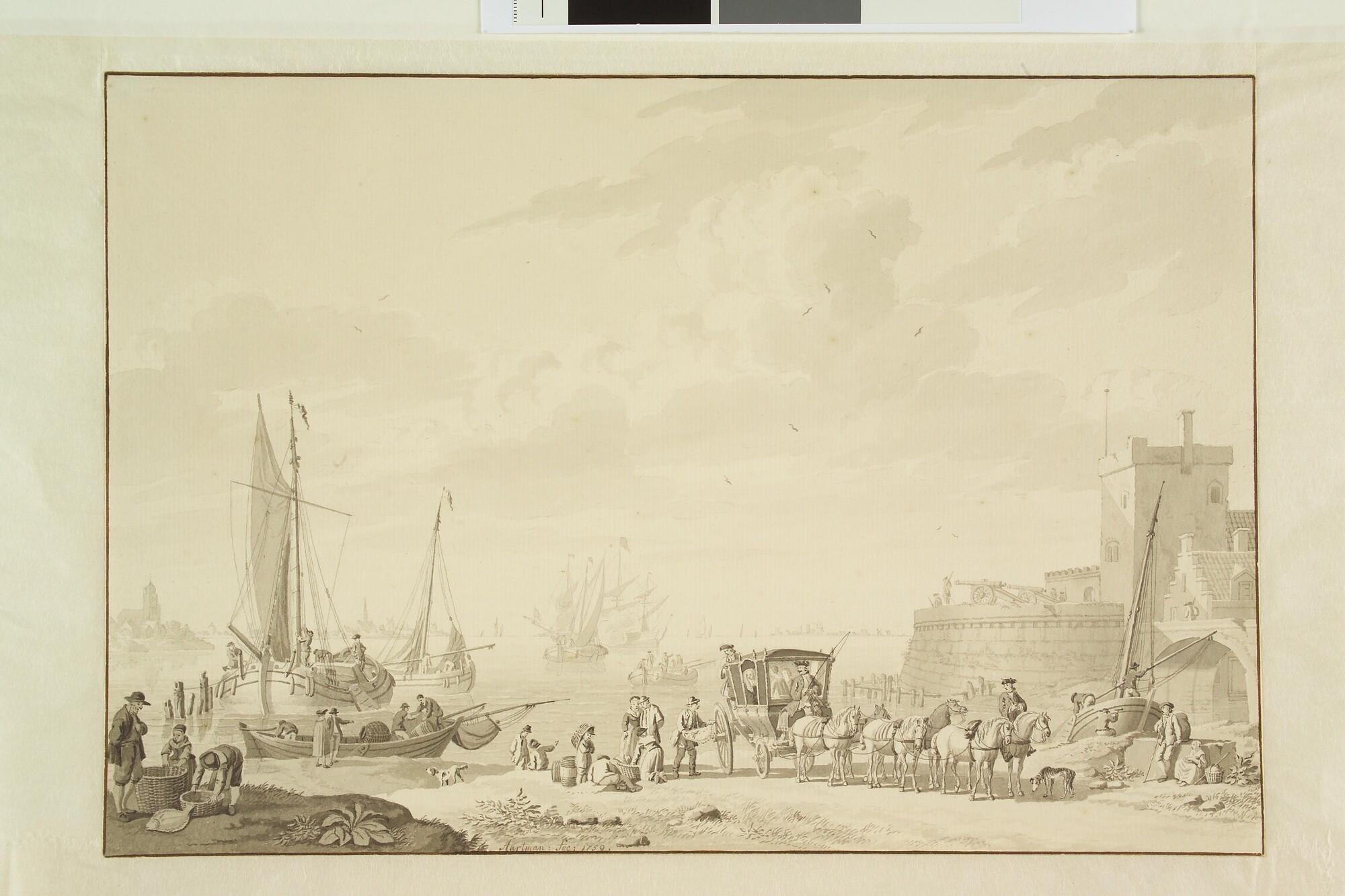 Een rede. Op de voorgrond een fort, op het strand een reiskoets bespannen met zes paarden. Links een binnenvaartuig met spriettuig.