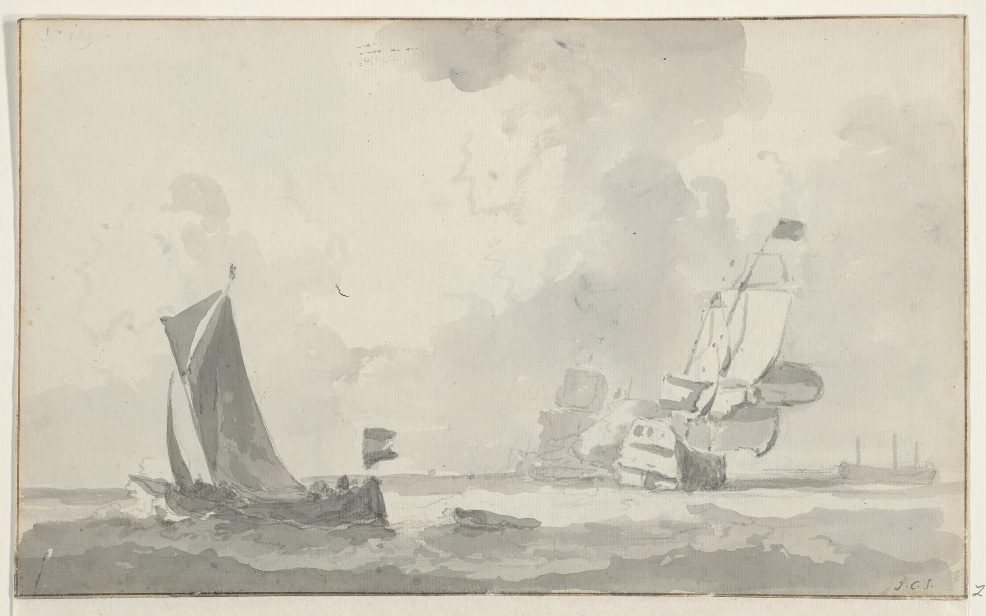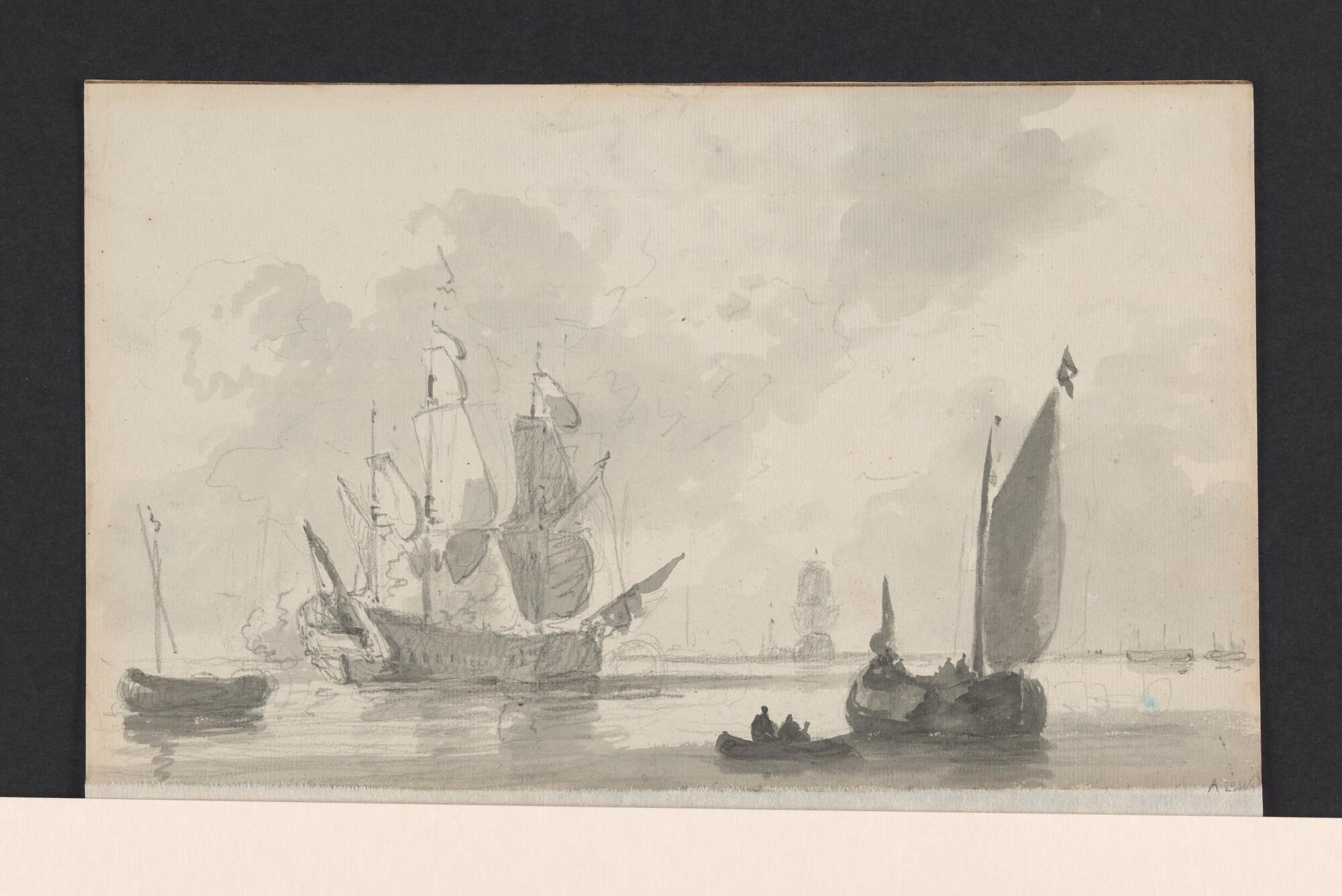 Een rede met rechts een oorlogsschip en links een vrachtscheepje. [Verso: Een rede met links een oorlogsschip en rechts een vrachtscheepje.].