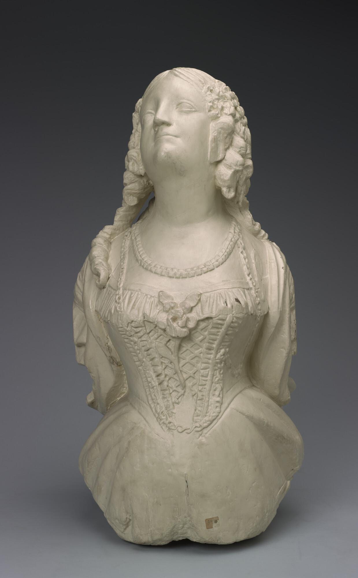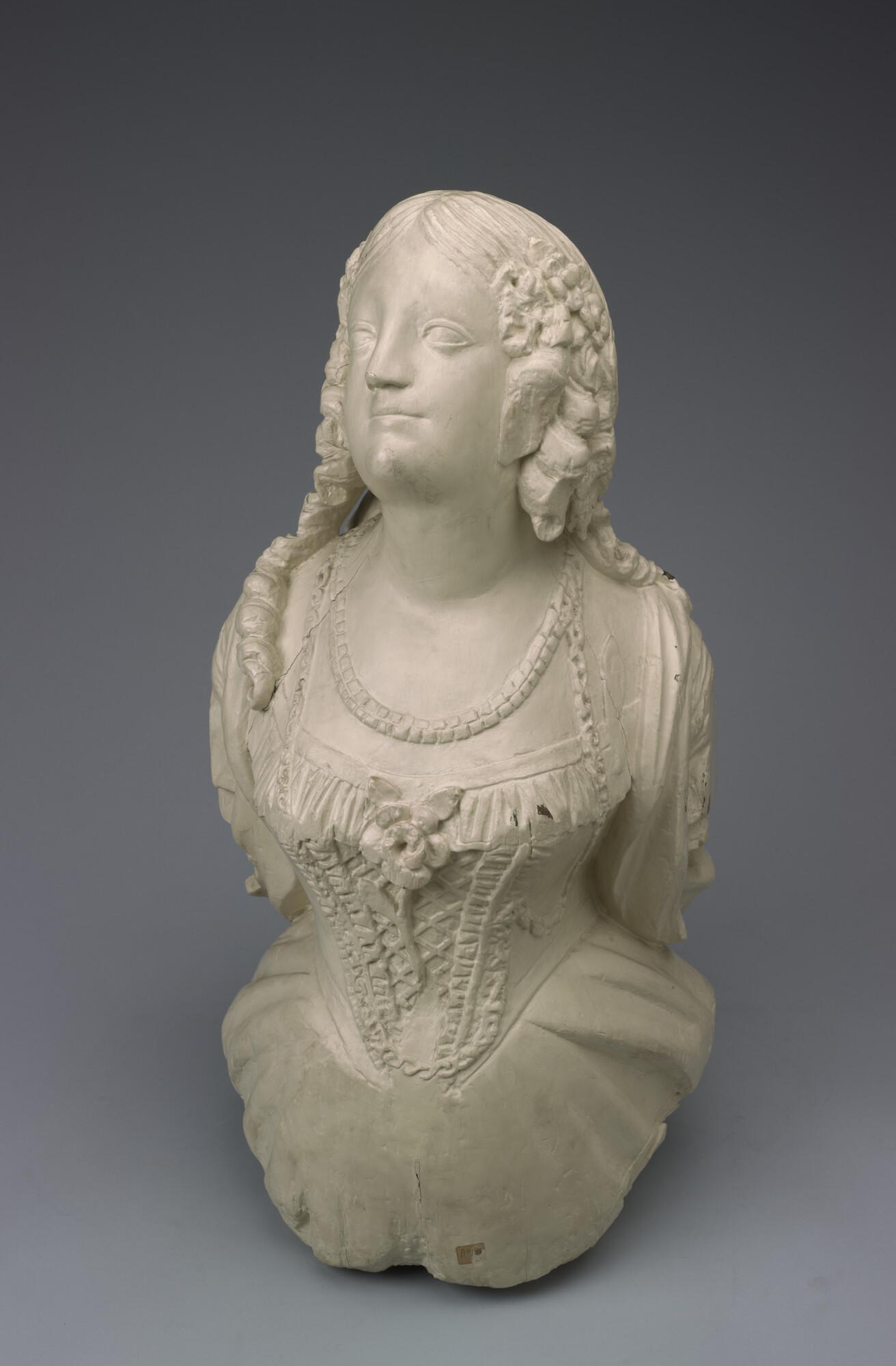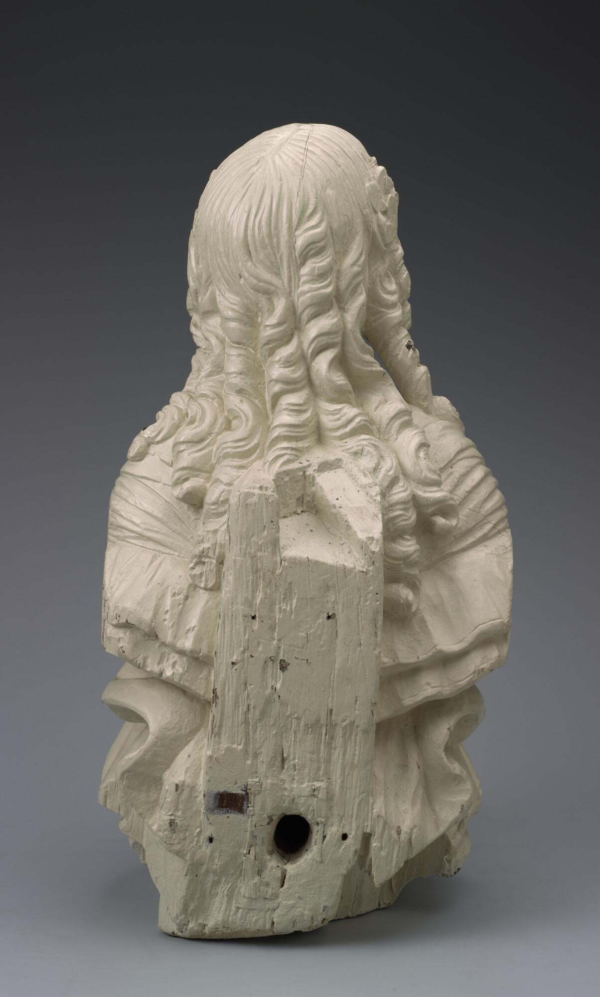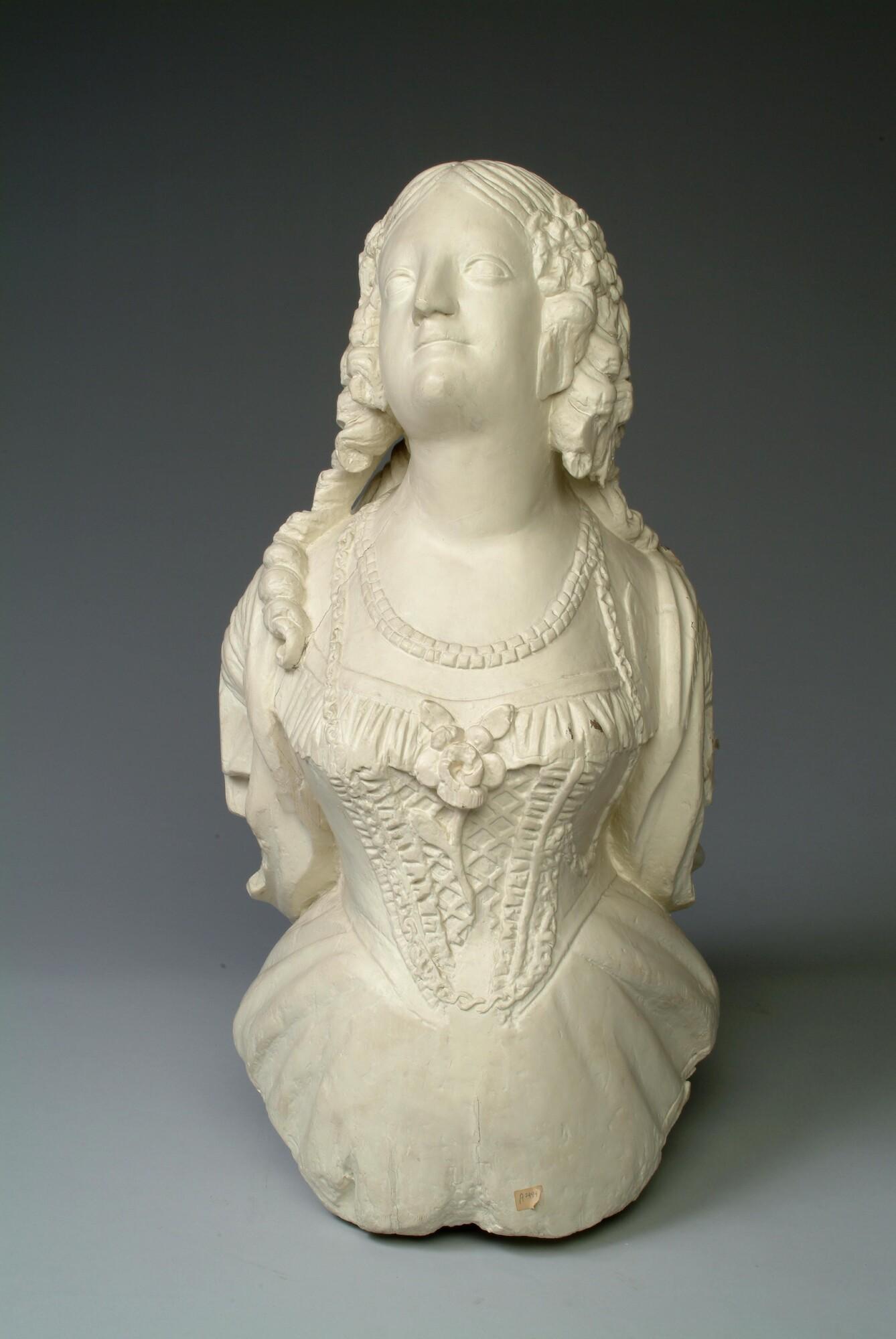Schegbeeld (heupstuk) in de vorm van een vrouwenfiguur met het gezicht omgeven door loshangend haar in pijpekrullen aan weerskanten bij de slapen bijeen gehouden door een strik.