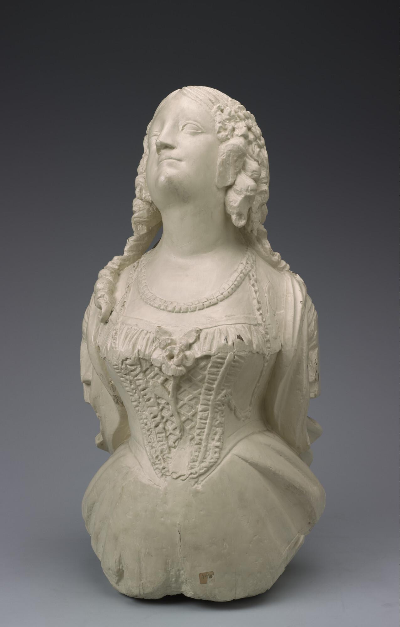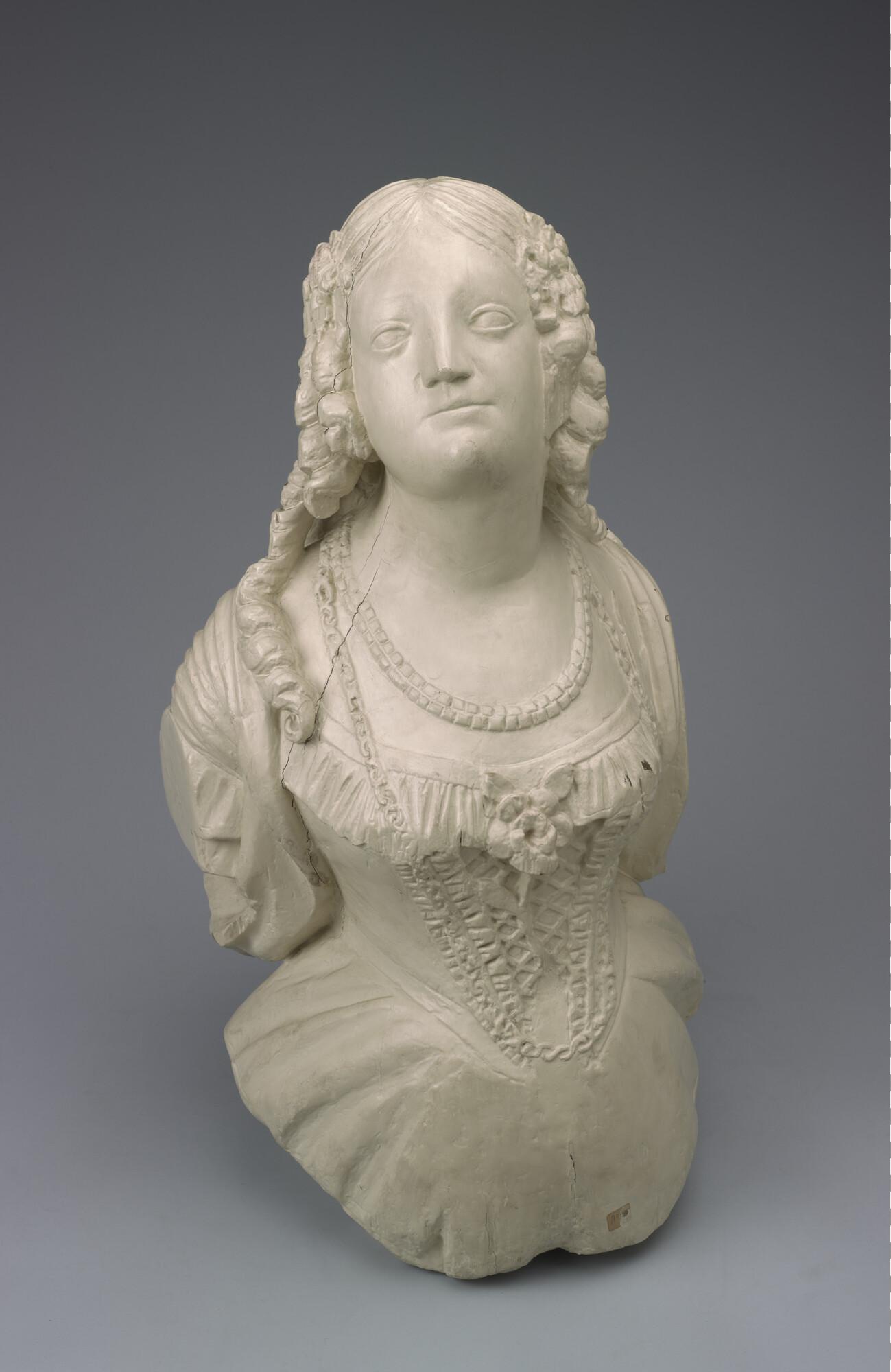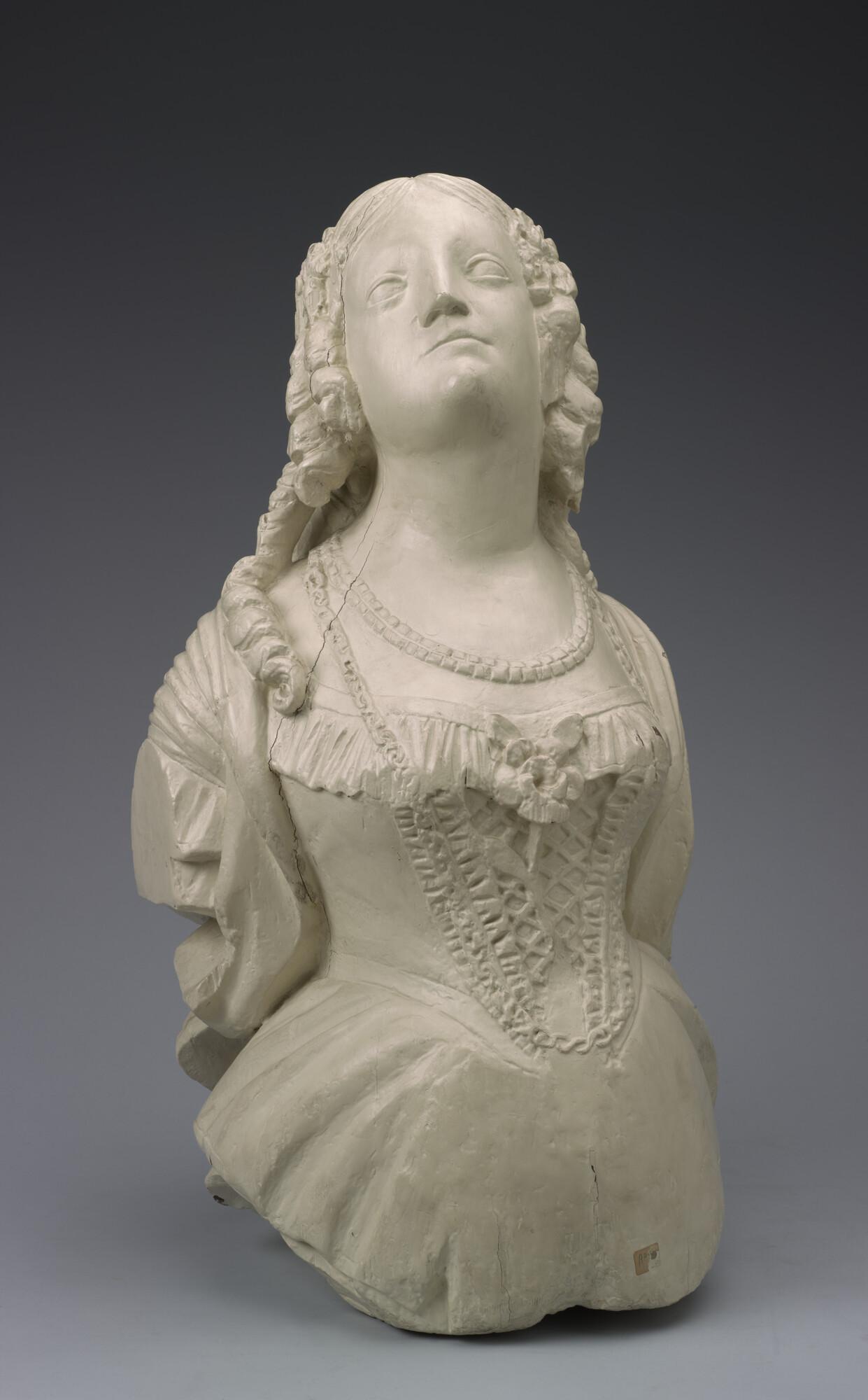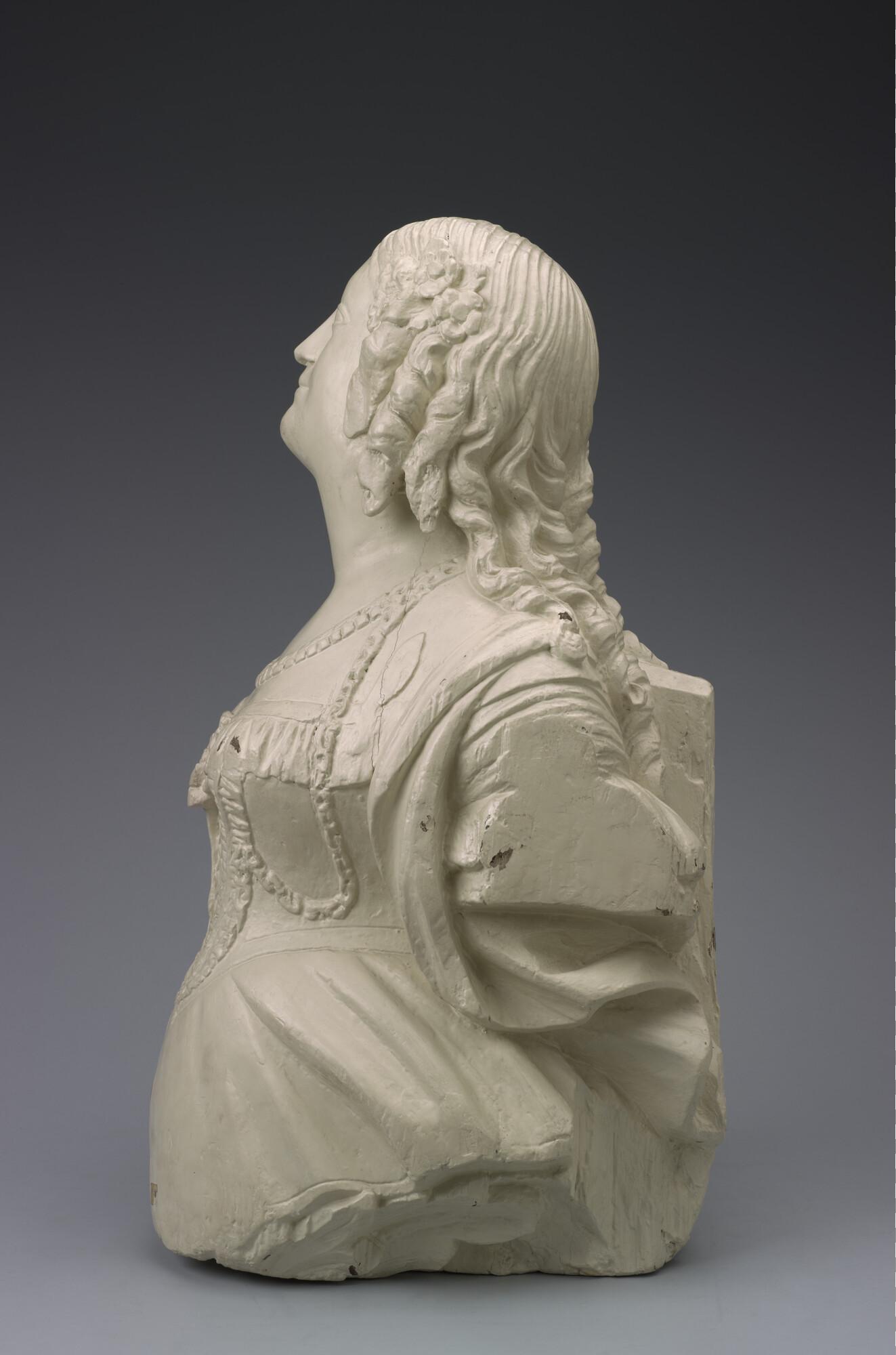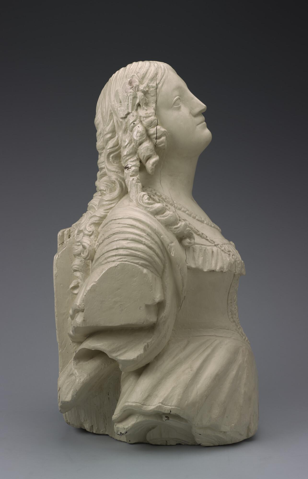 Schegbeeld (heupstuk) in de vorm van een vrouwenfiguur met het gezicht omgeven door loshangend haar in pijpekrullen aan weerskanten bij de slapen bijeen gehouden door een strik.
