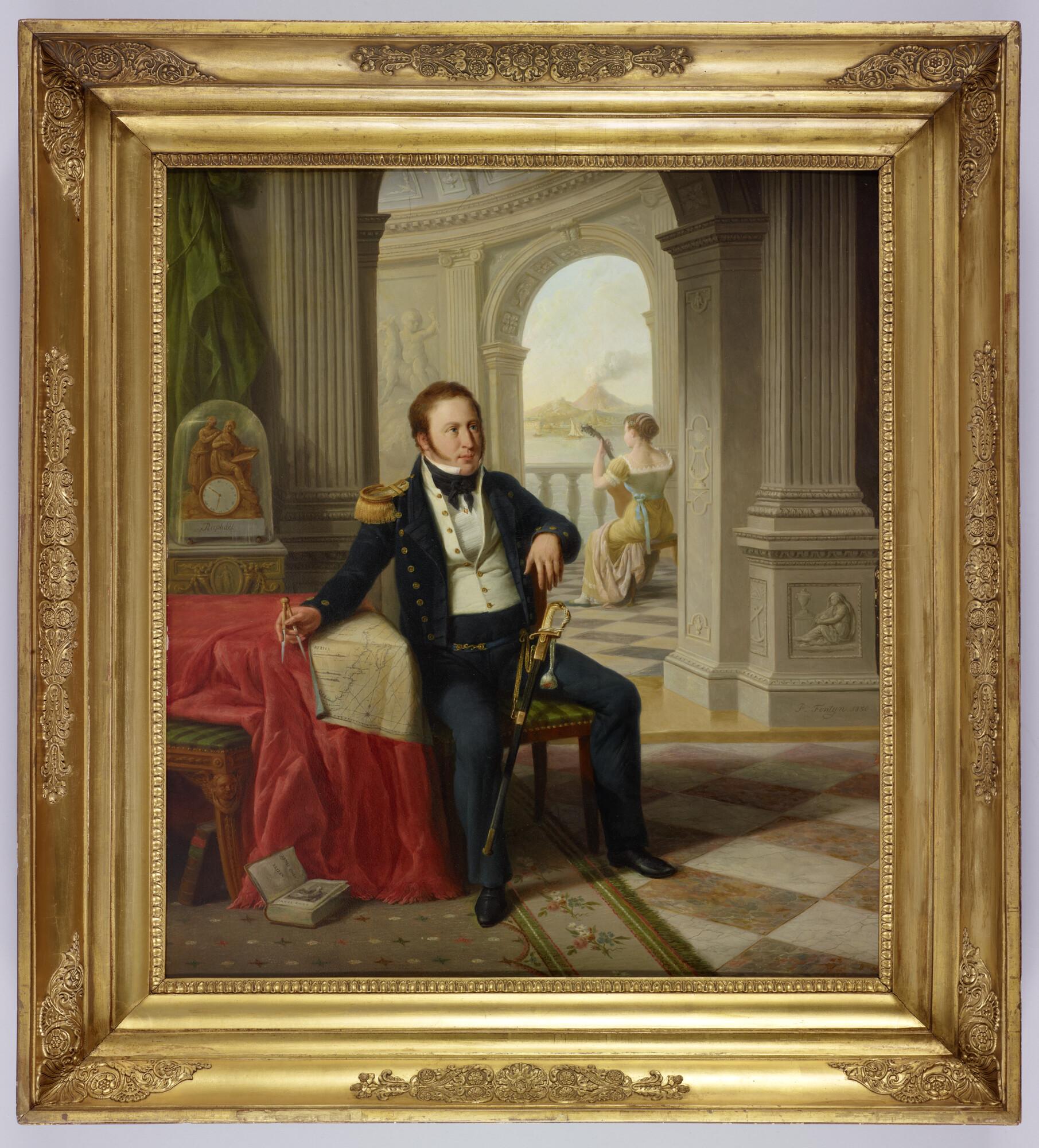 Portret van luitenant-ter-zee 2e klasse Francois Xavier Richard 't Hooft (1799-1860), in uniform, zittend in een interieur met een steekpasser in de rechterhand. Op de tafel een zeekaart met een deel van de oostkust van Afrika, op de vloer een opengeslagen deel van 'James Cook's Reizen'. Op de achtegrond een musicerende vrouw op een terras ...