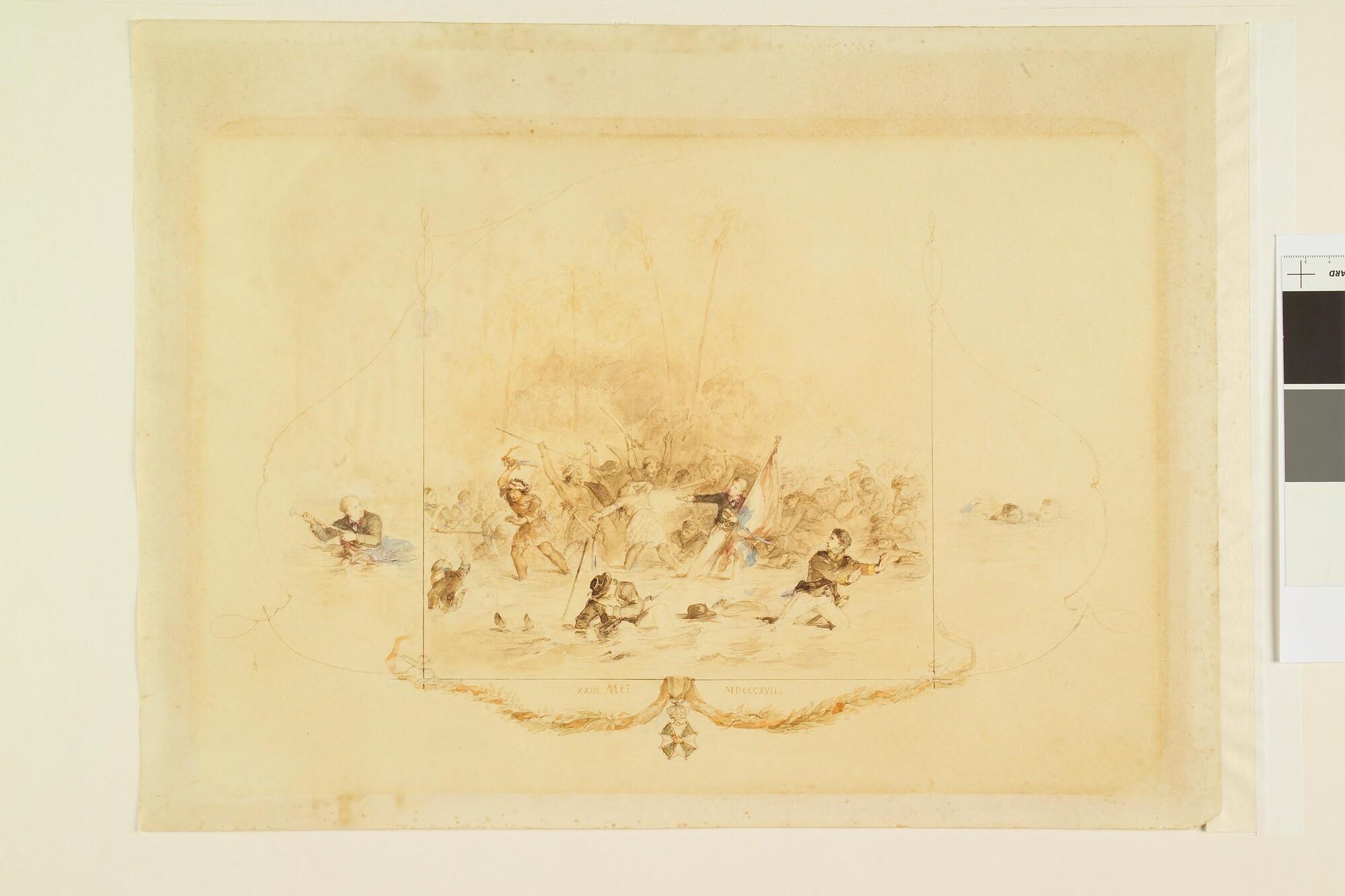 De mislukte landing in de baai van Saparoea, 23 mei 1817. In het midden adelborst 2e klasse F.X.R. 't Hooft van Zr.Ms. "Evertsen" met de Nederlandse vlag. Onder de afbeelding het ordeteken van de Militaire Willems-Orde.