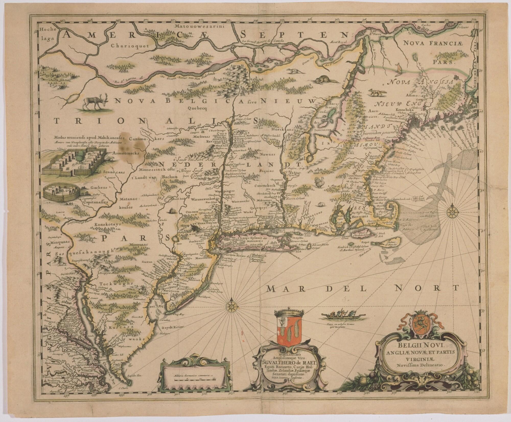Kaart van Nieuw Nederland, Nieuw Engeland en een deel van Virginia. Uitgave Johannes Janssonius (1588 - 1664), Amsterdam, 1650. Eerste staat van deze kaart. Schaal 1:2.500.000.