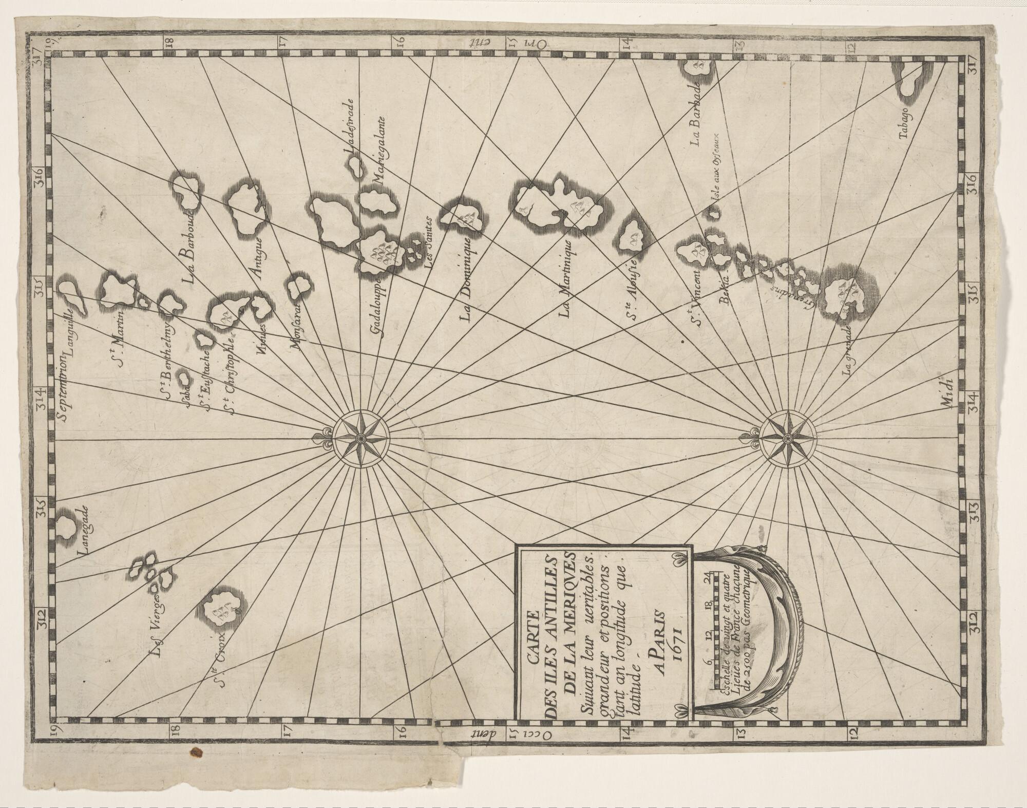 Kaart van de Antillen, uit het boek: Relation de ce qui s'est passe dans les Isles & Terre Ferme de L'Amerique, pendant la derniere Guerre avec I' Angleterre,... . avec un Journal du dernier Voyage du S' de la Barre en la Terre-Ferme, & Isle de Cayenne . Paris: Gervais Clouzier, 1671 (schaal 1 op ...