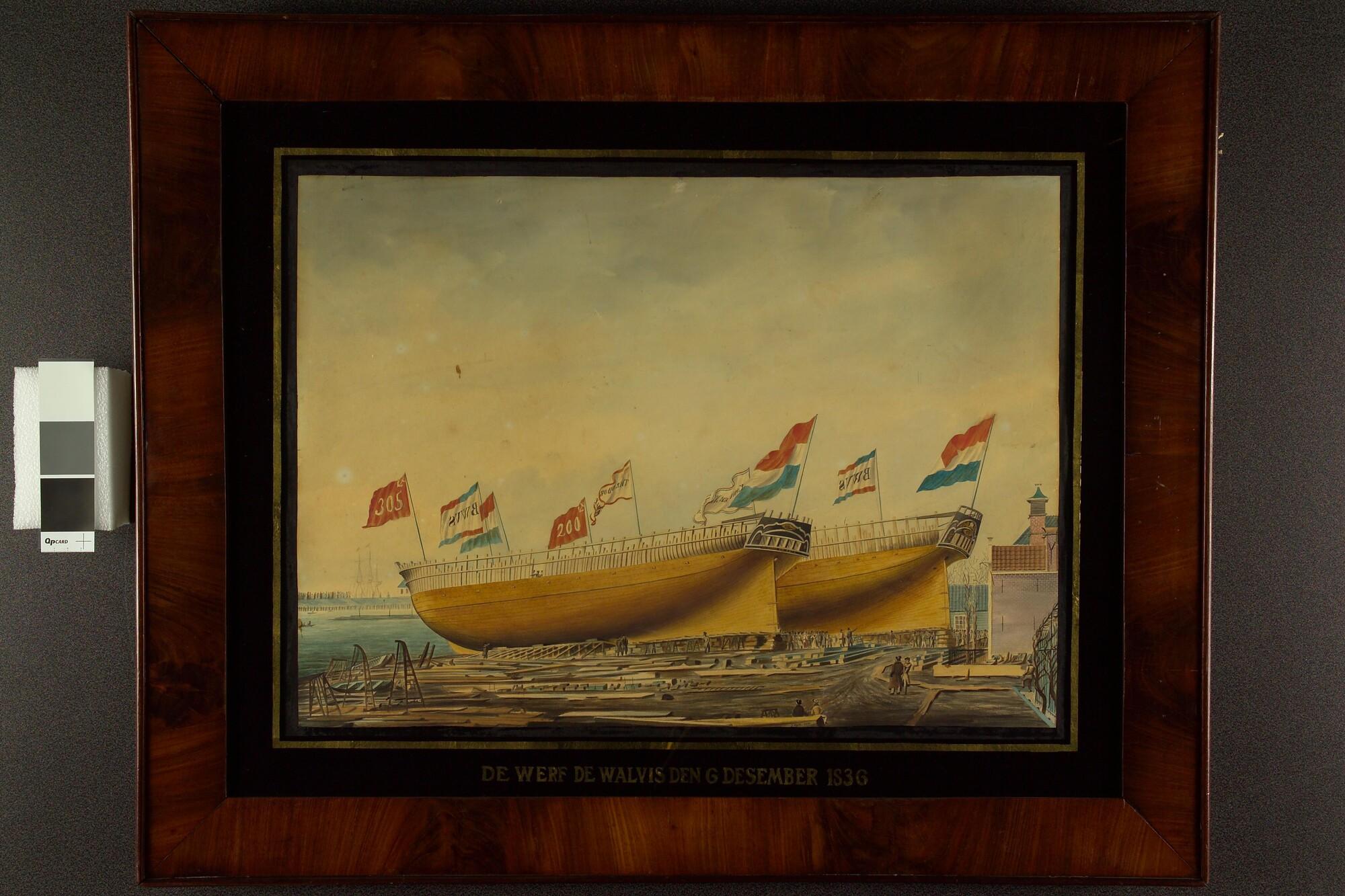 Het fregatschip Koning der Nederlanden en het barkschip Theodora en Sara op de werf De Walvis in Amsterdam