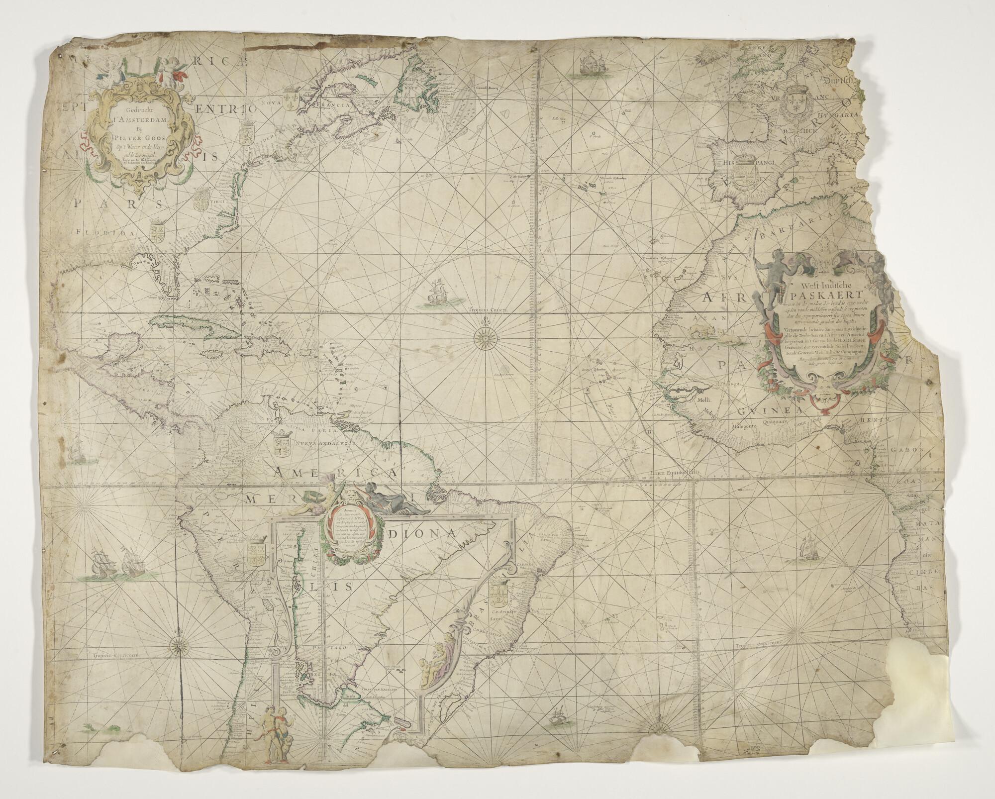 Met de hand gekleurde, gedrukte Westindische paskaart door Pieter Goos, circa 1726 uitgegeven door Johannes van Keulen te Amsterdam, derde staat. De eerste staat werd uitgebracht, ca. 1674. Lengte volgens de meridiaan van Teneriffe. Mercator projectie. Deze kaart bevat in tegenstelling tot andere Westindische paskaarten het wagenspoor, de voorgeschreven route voor schepen van de VOC ...