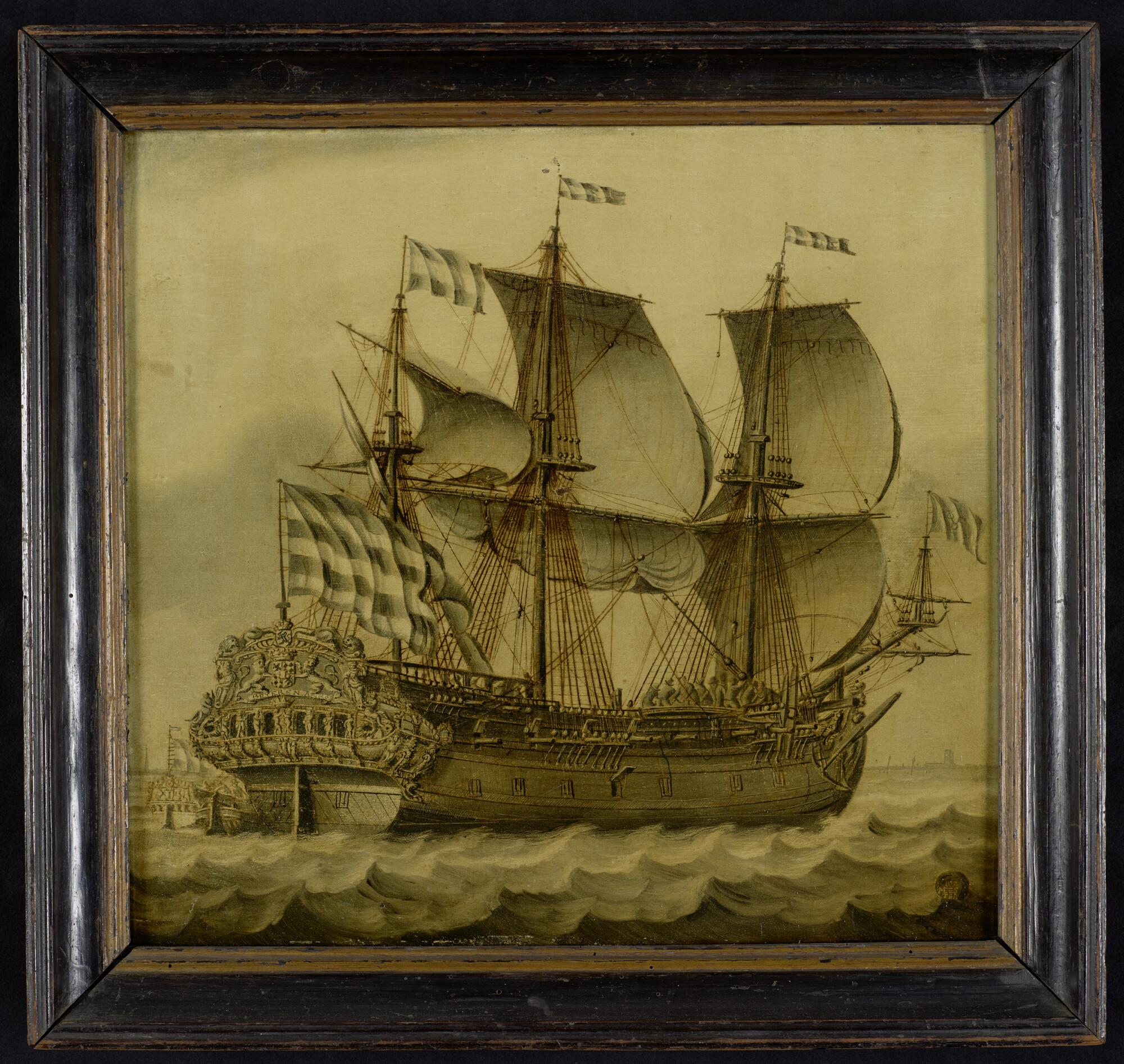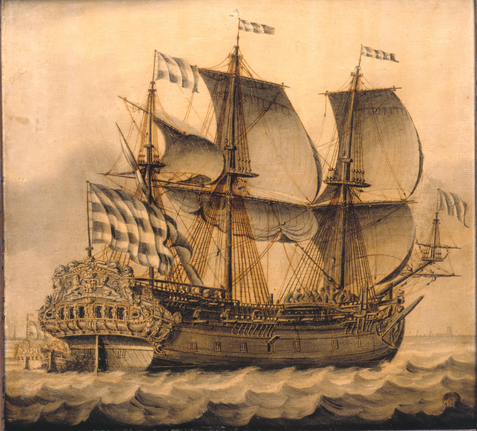 De Oostindiëvaarder Beyeren van de VOC-kamer Delft, met daarachter een jacht met op de spiegel het wapen van Delft.