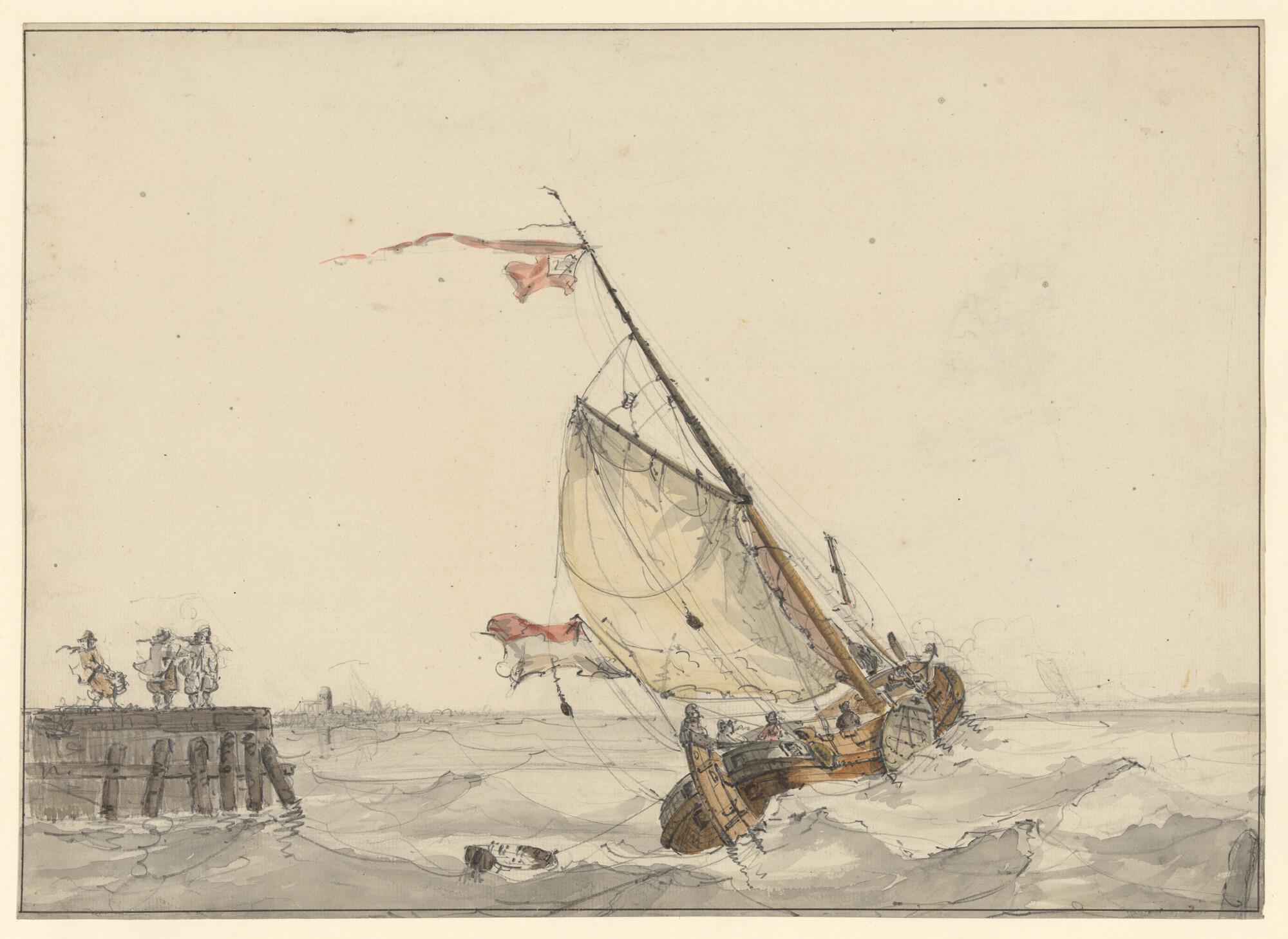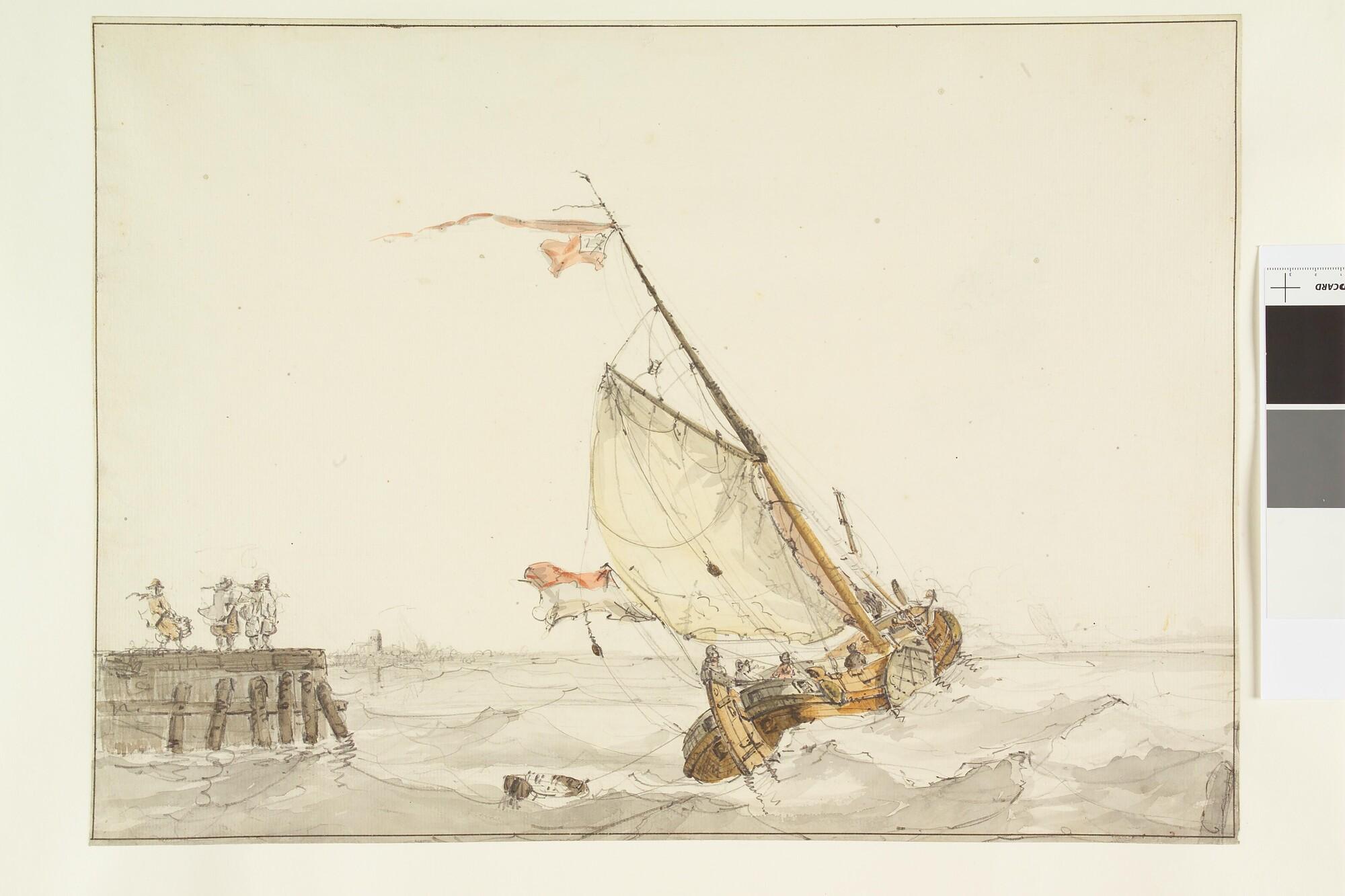 Een tjalk de haven uitzeilend; links drie figuren op een havenhoofd. Verso: potloodschets van een vissersscheepje met spriettuig, twee figuren.