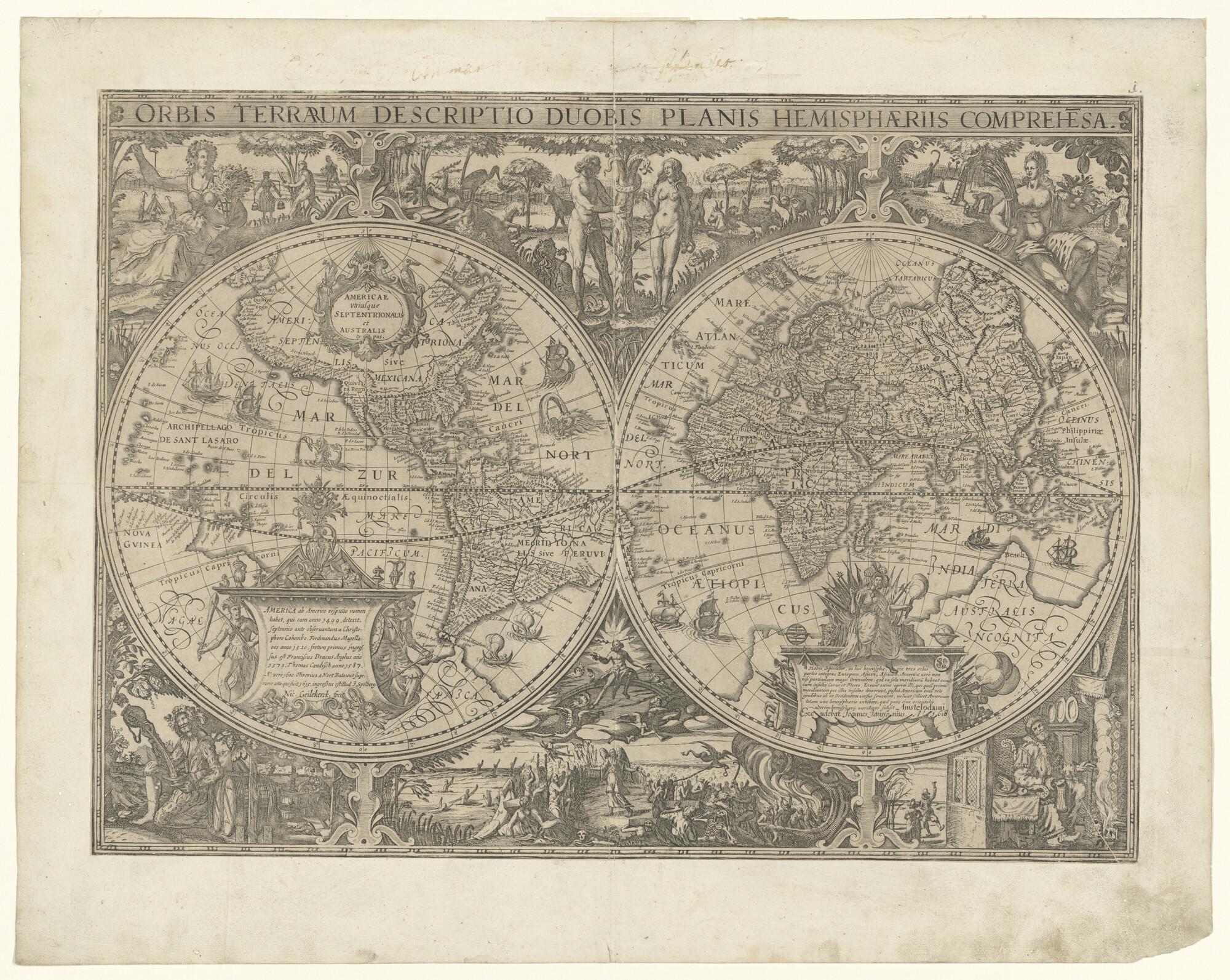 Wereldkaart in twee halfronden van Nicolaas van Geelkerken, tweede staat, oorspronkelijke uitgave 1617