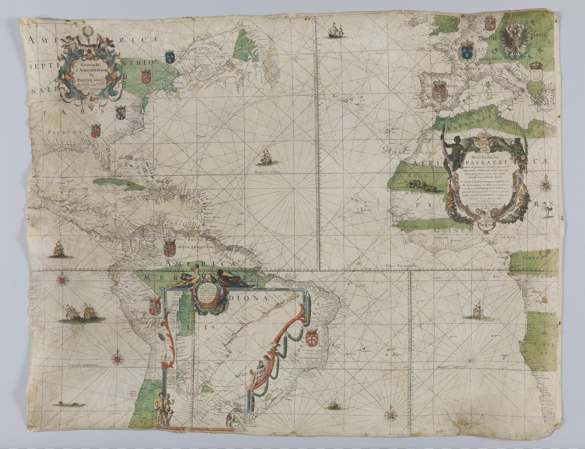 Met de hand gekleurde en gedrukte Westindische paskaart door Willem Jansz Blaeu, vierde staat uitgegeven door Johannes Loots en gedrukt bij Pieter Gioos, Amsterdam, circa 1700. Mercator projectie, lengte volgens de meridiaan van Teneriffe (schaal 1 op 14.000.000).