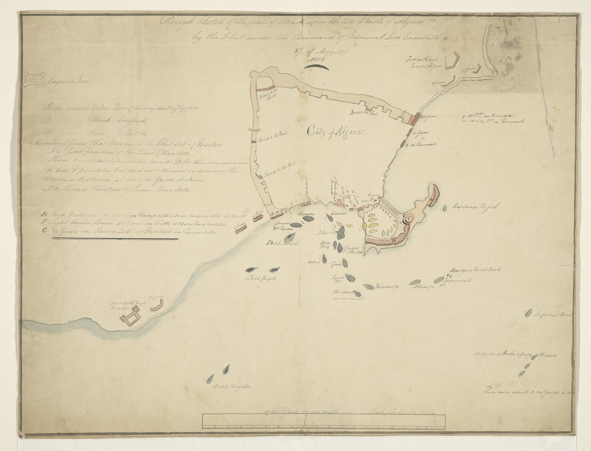 Ruwe schets van de positie van de schepen van de Engelsen bij hun aanval op Algiers
