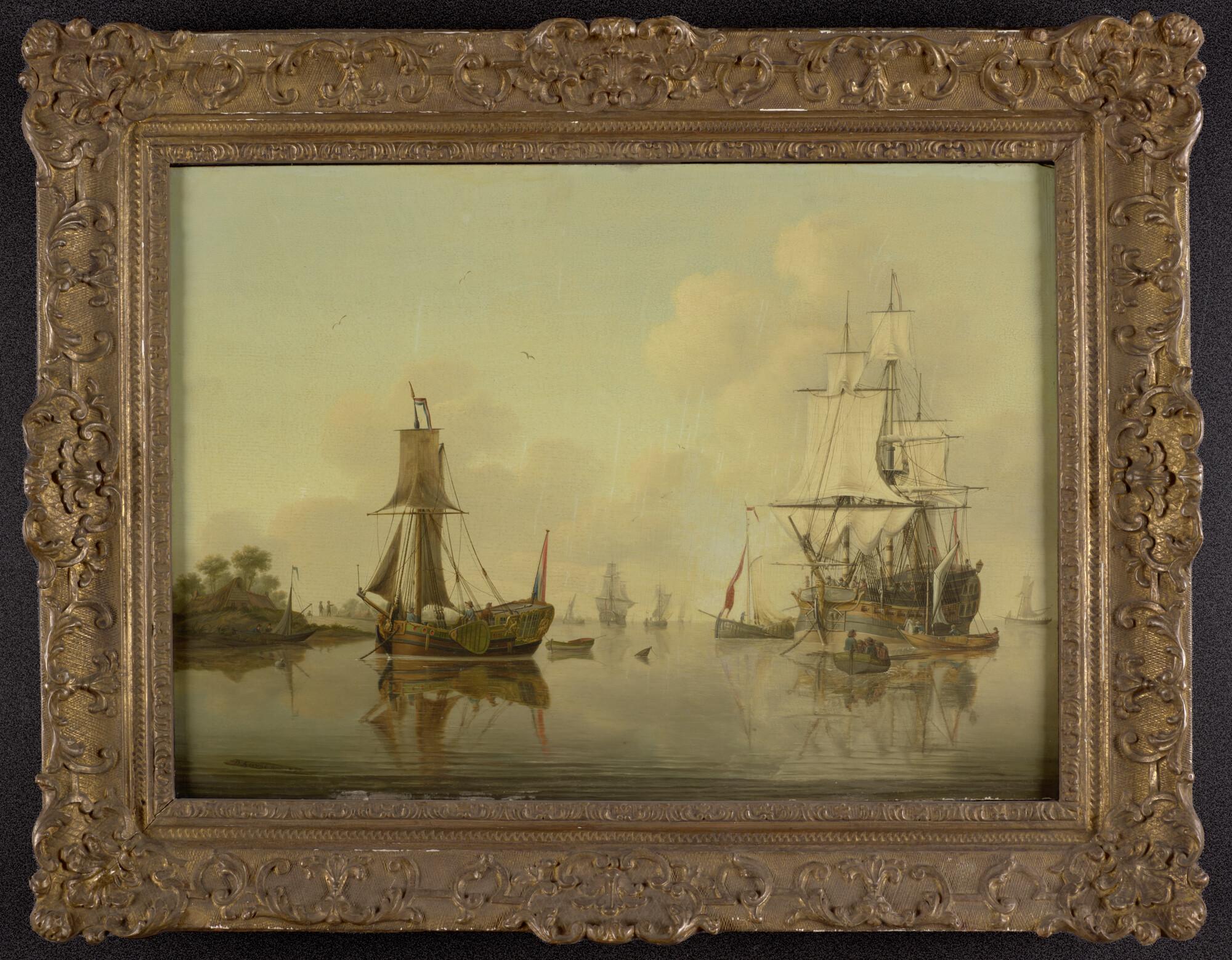 Het fregatschip Triton, een ten anker liggend spiegelpaviljoenjacht en andere schepen bij een oever.