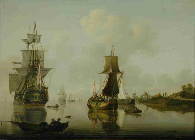 Het fregatschip Triton met een spiegelpaviljoenjacht dat geboegseerd wordt, en andere schepen bij een oever.