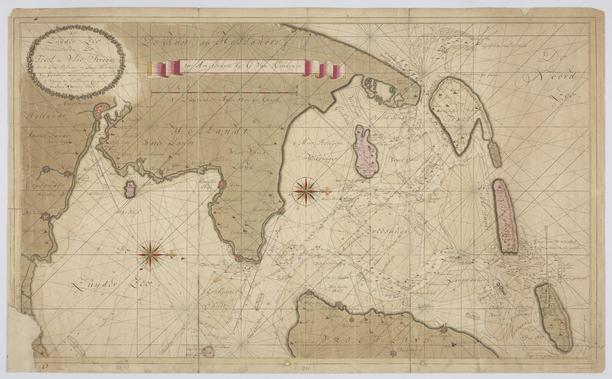 Gekleurde handschriftkaart van de Zuiderzee met Texel en de Vliestroom. Uitgave Gerard van Keulen, Amsterdam, 1720.