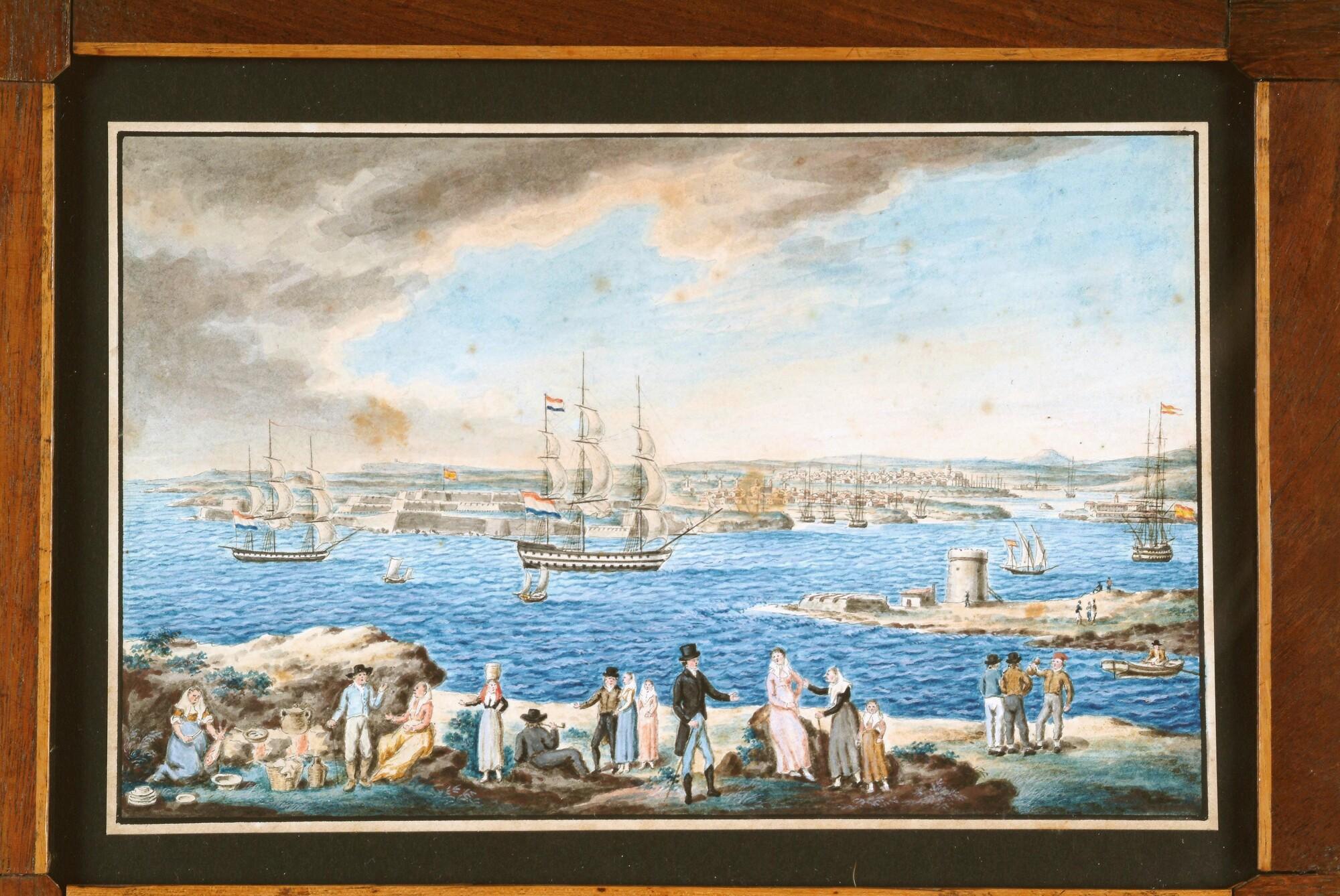 Een Nederlands fregat en een korvet in de baai van Port Mahon.