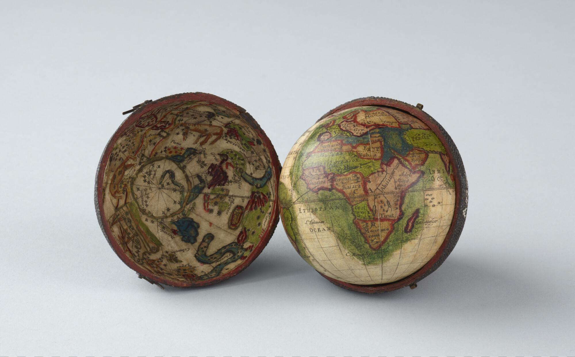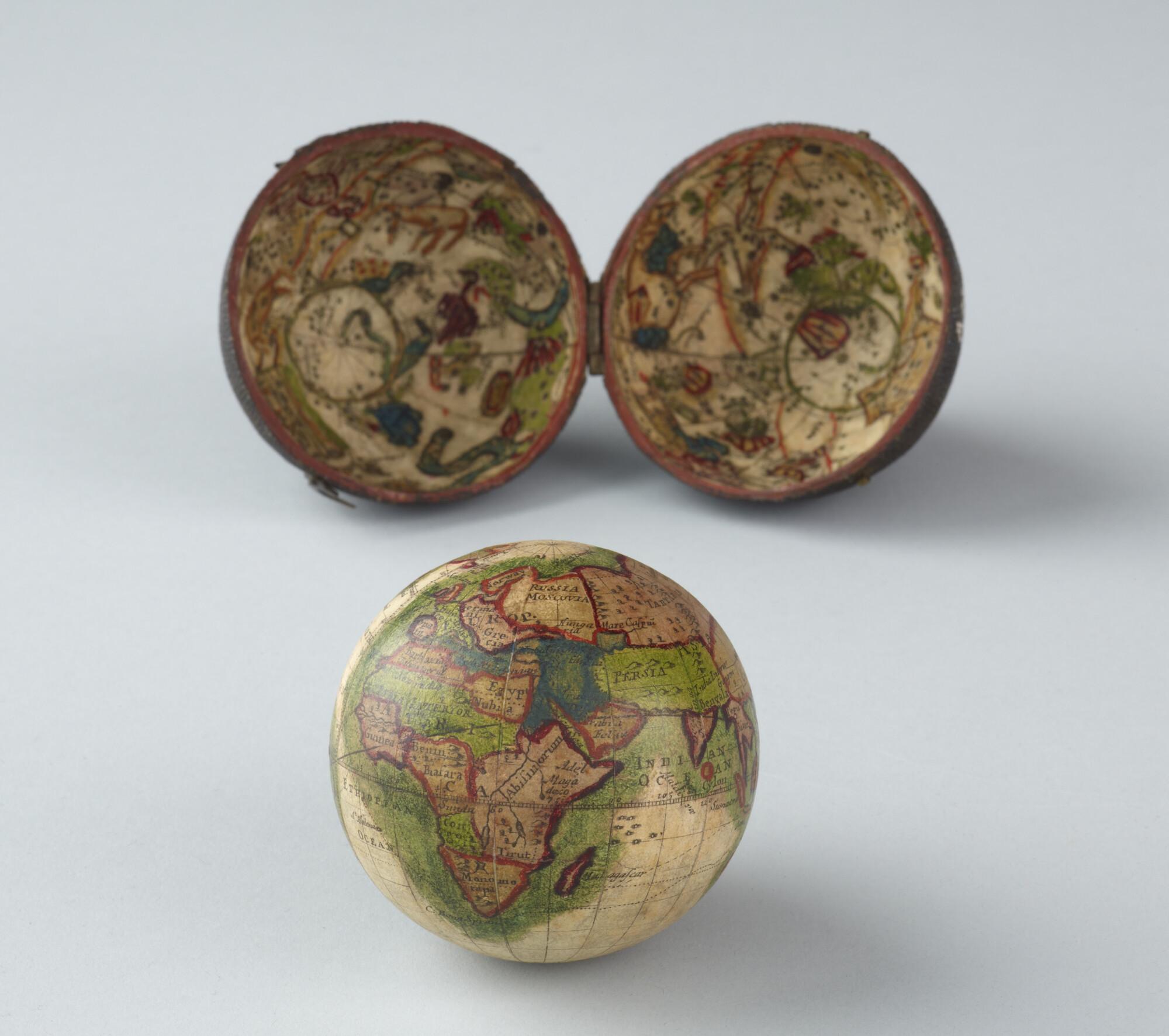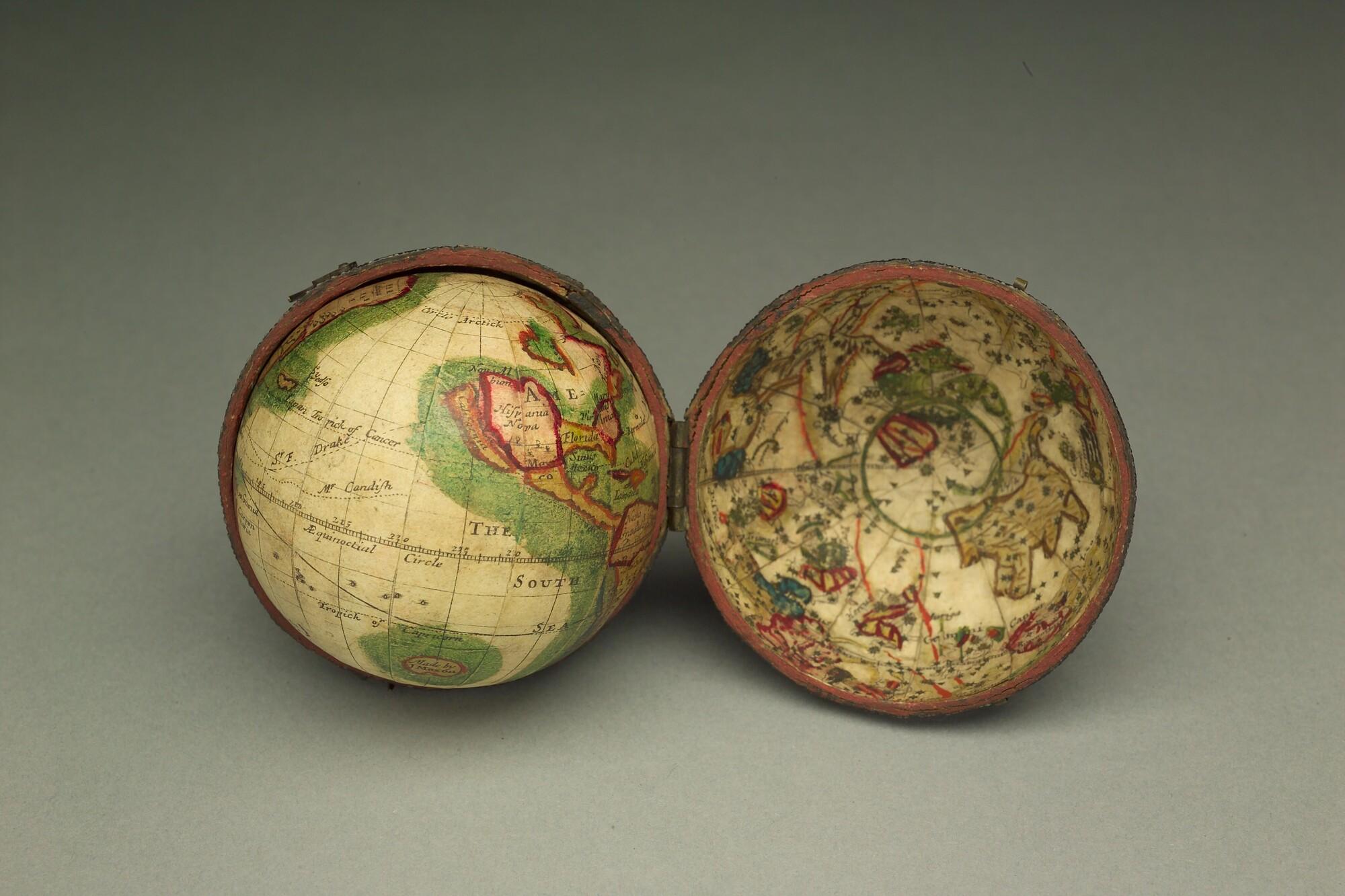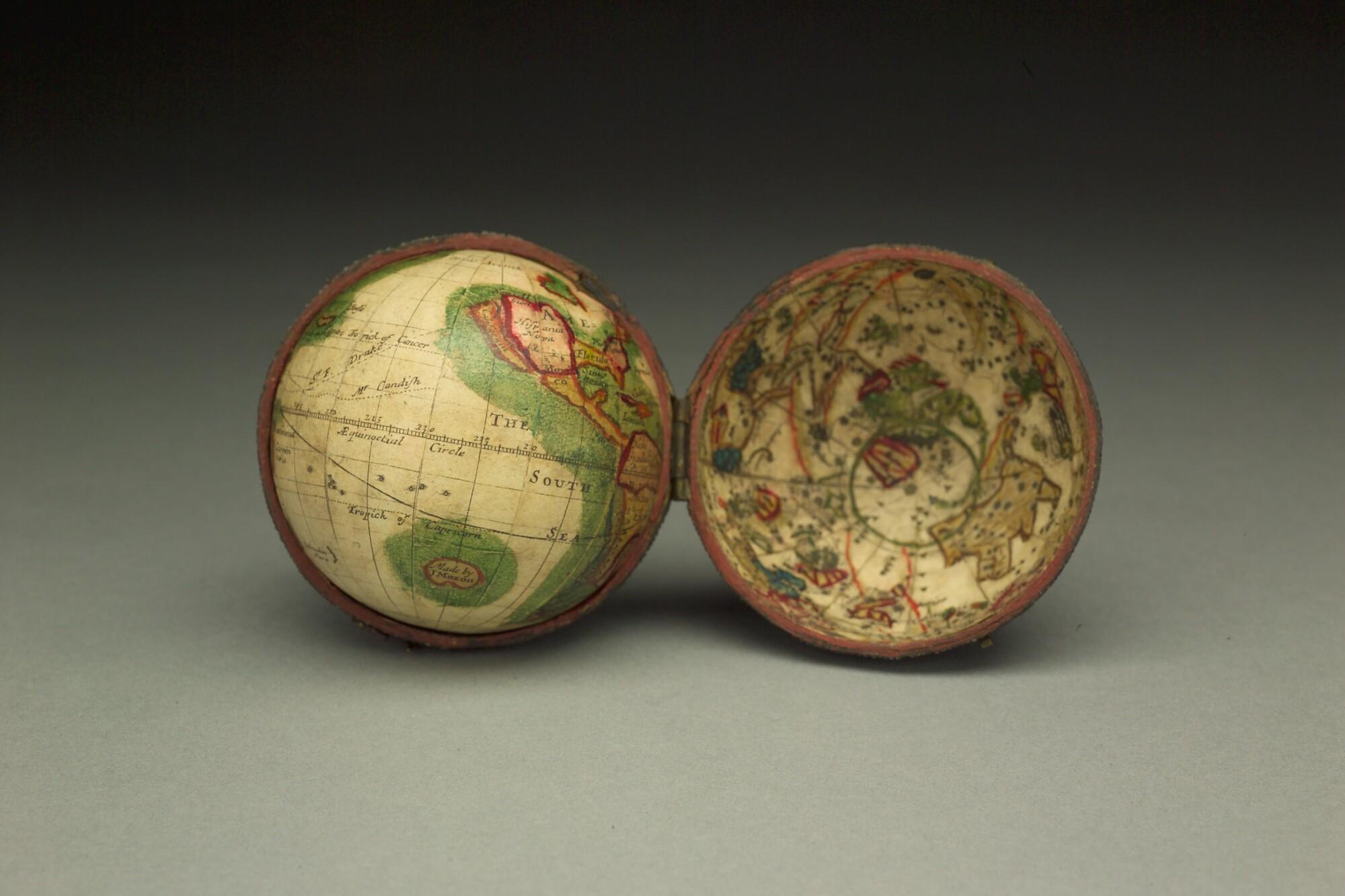 Zakglobe van 6,75 cm door Joseph Moxon, circa 1670. De hemelglobe bestaat uit twee halve bollen verbonden met een scharnier. Aan de binnenzijde is de sterrenhemel weergegeven. In deze twee halve bollen bevindt zich een aardglobe. De aardglobe is waarschijnlijk gemaakt van een massieve, lichthouten bol waarop de globesegementen met het kaartbeeld zijn gemonteerd. Schaal ...