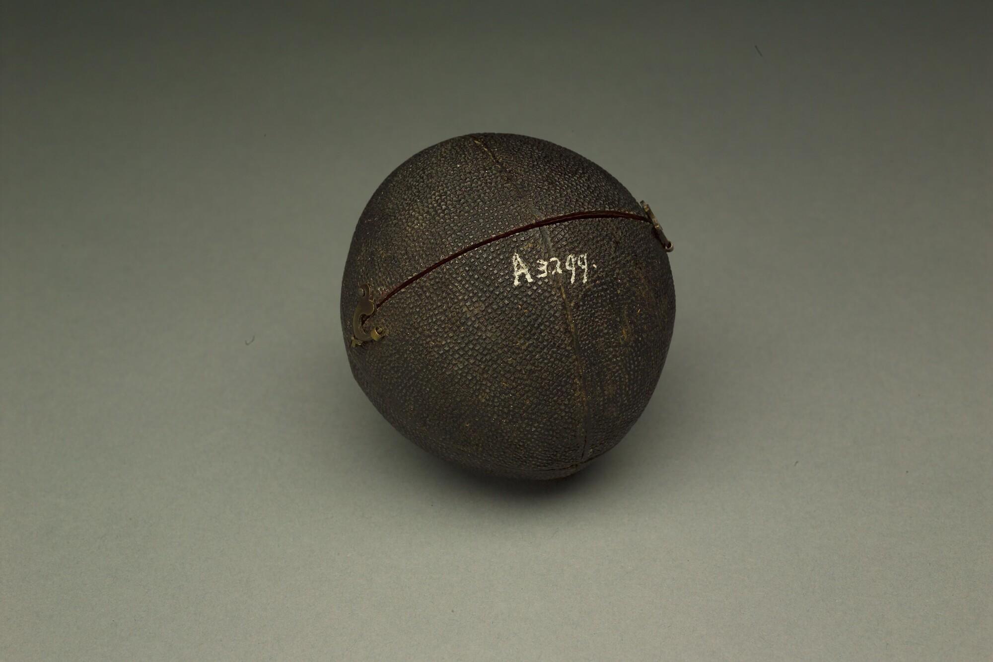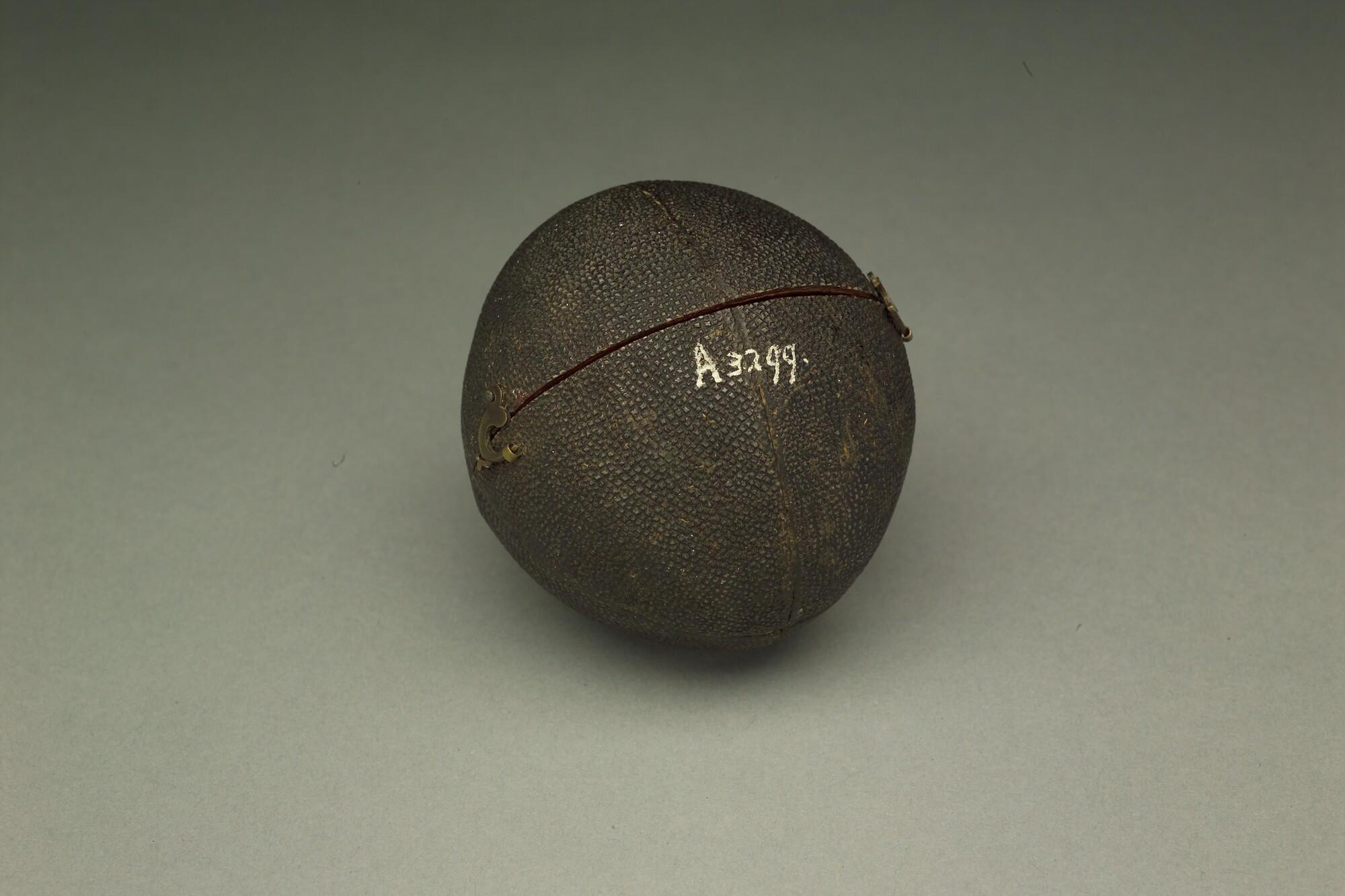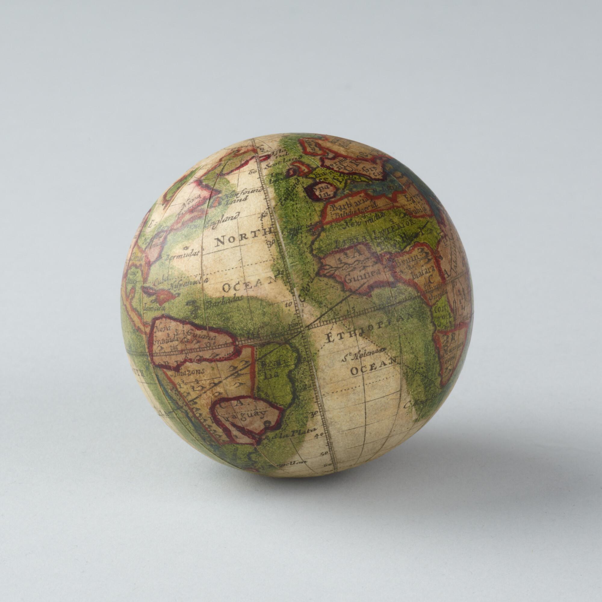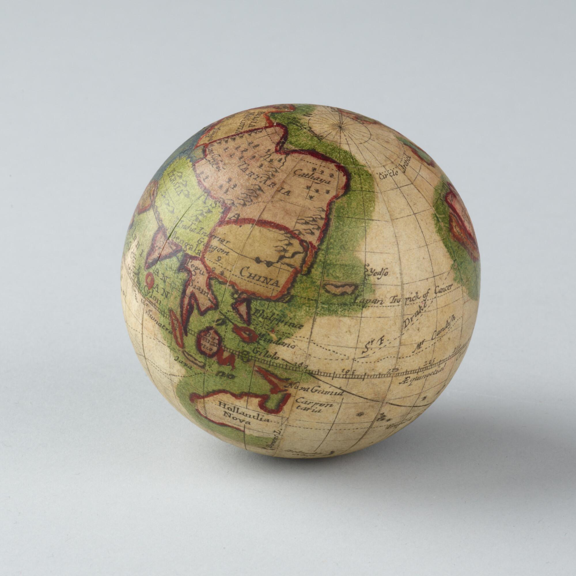 Zakglobe van 6,75 cm door Joseph Moxon, circa 1670. De hemelglobe bestaat uit twee halve bollen verbonden met een scharnier. Aan de binnenzijde is de sterrenhemel weergegeven. In deze twee halve bollen bevindt zich een aardglobe. De aardglobe is waarschijnlijk gemaakt van een massieve, lichthouten bol waarop de globesegementen met het kaartbeeld zijn gemonteerd. Schaal ...