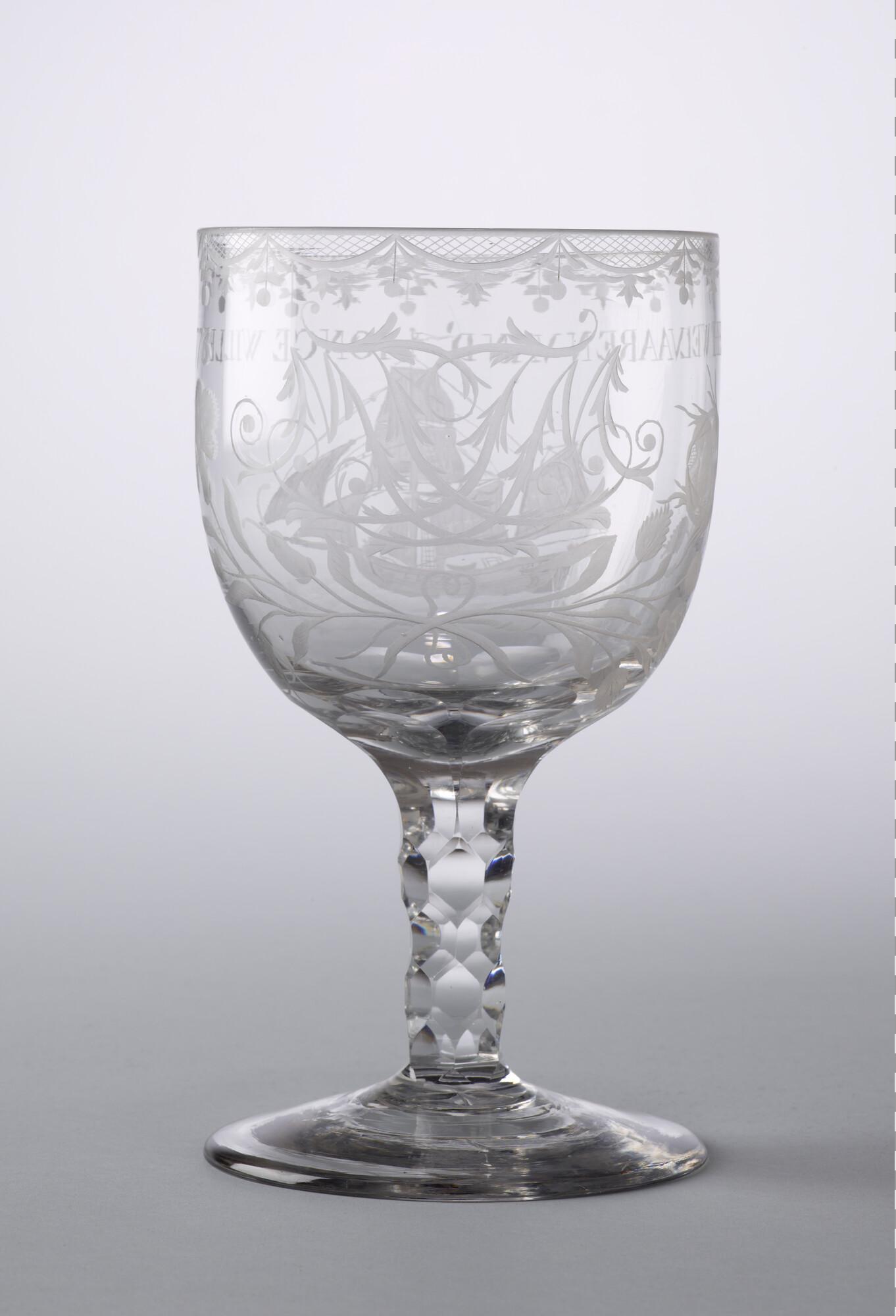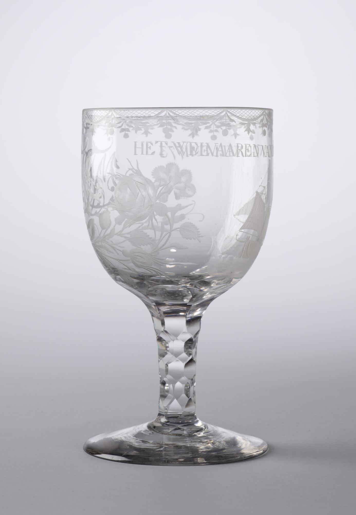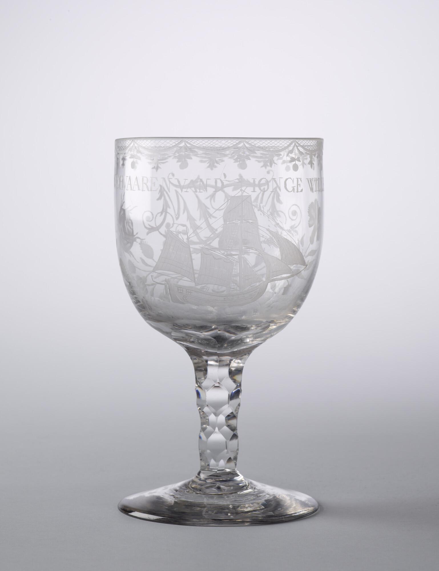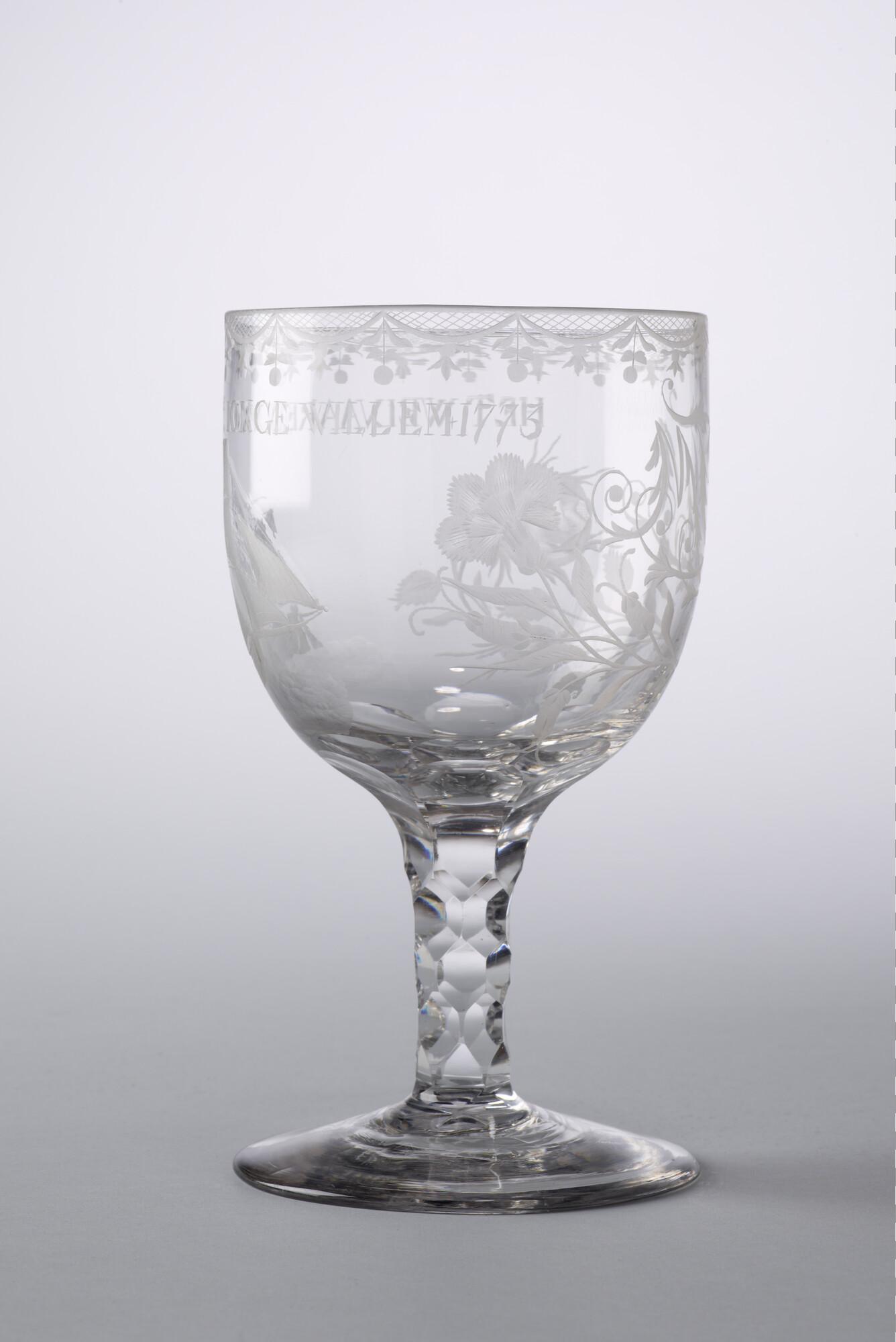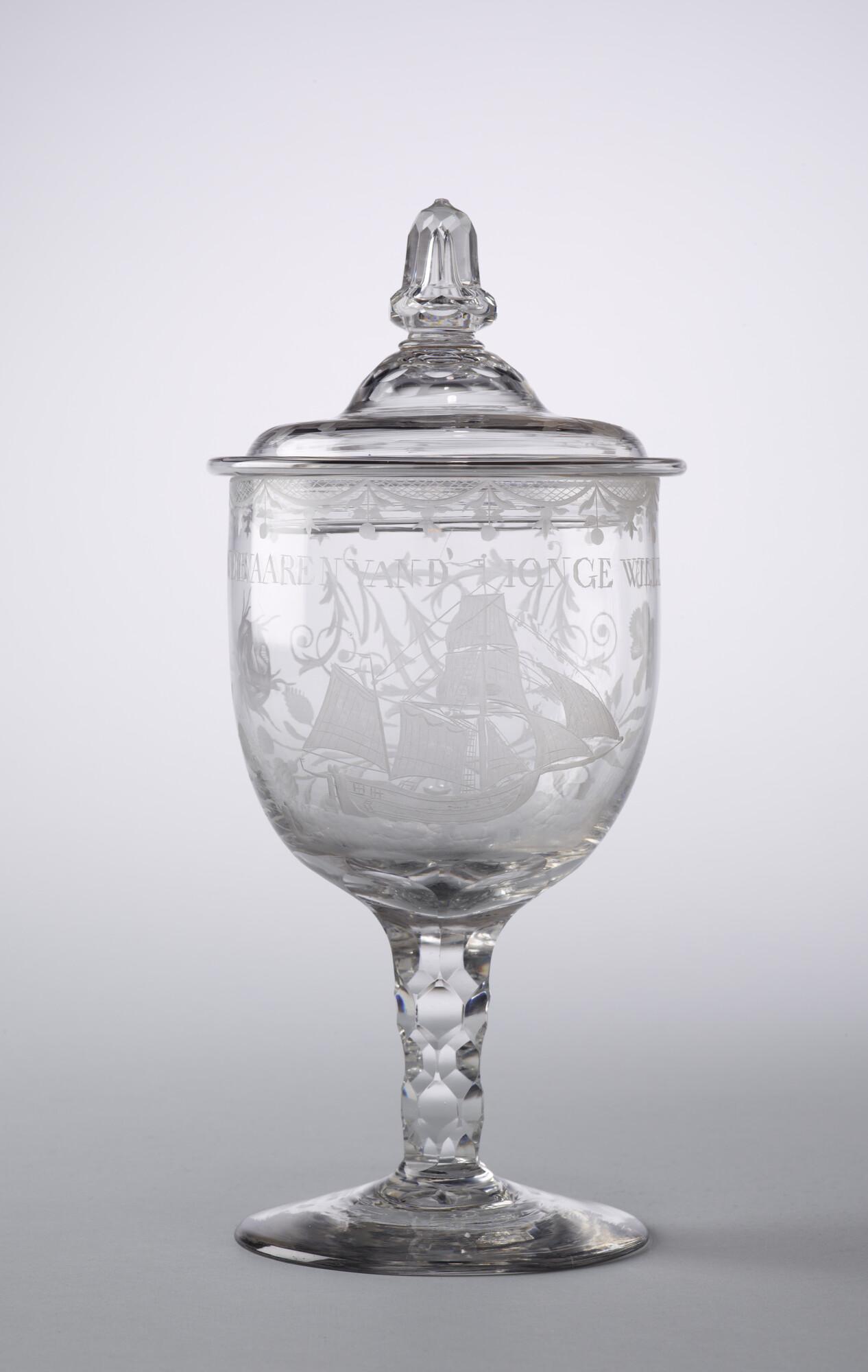 Dekselbokaal met een radgravure van een galjoot en het opschrift: "Het welvaaren van de 'Ionge Willem 1773'.