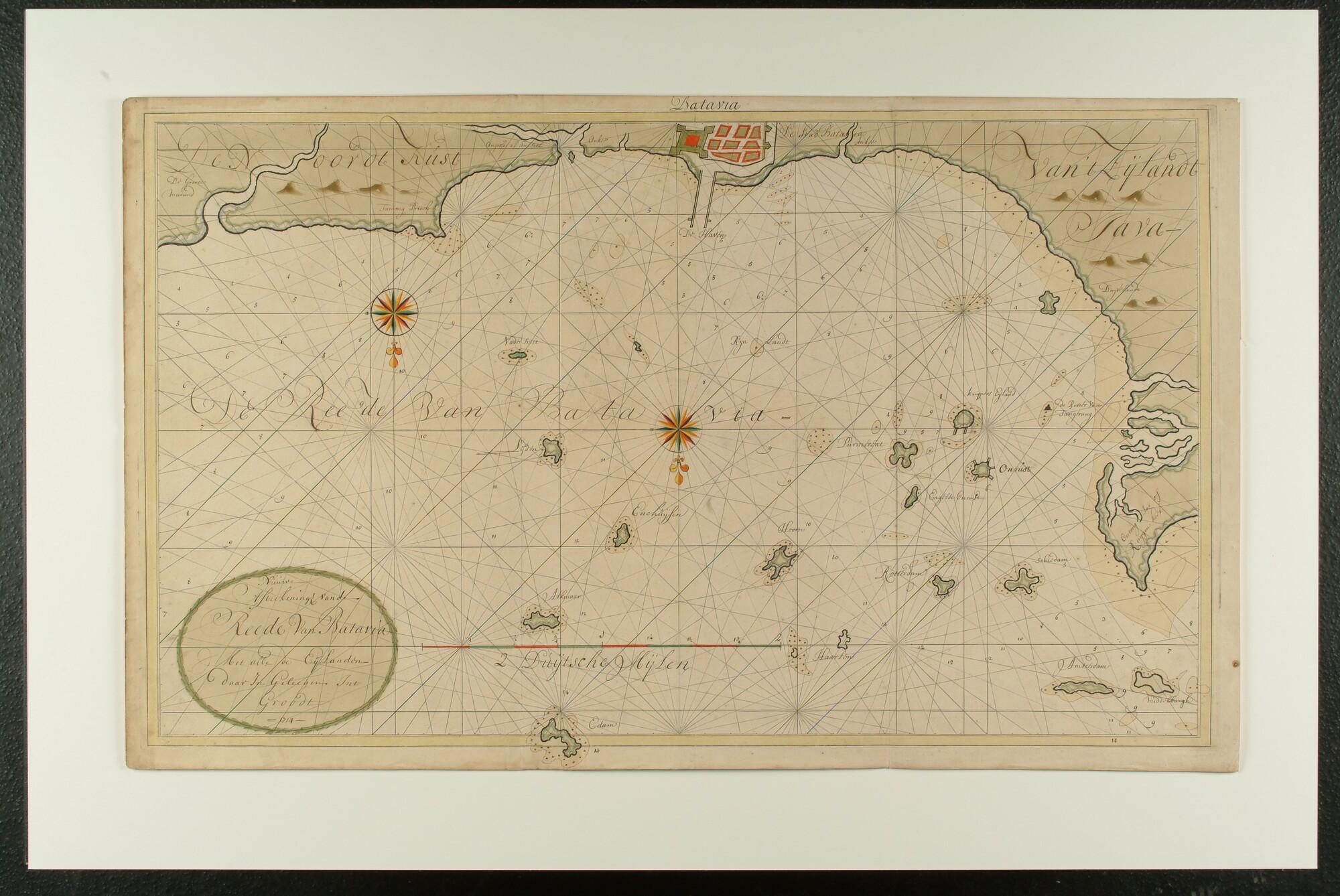 Gekleurde handschriftkaart van de rede van Batavia met omliggende eilanden, door Gerard van Keulen, Amsterdam, 1714.