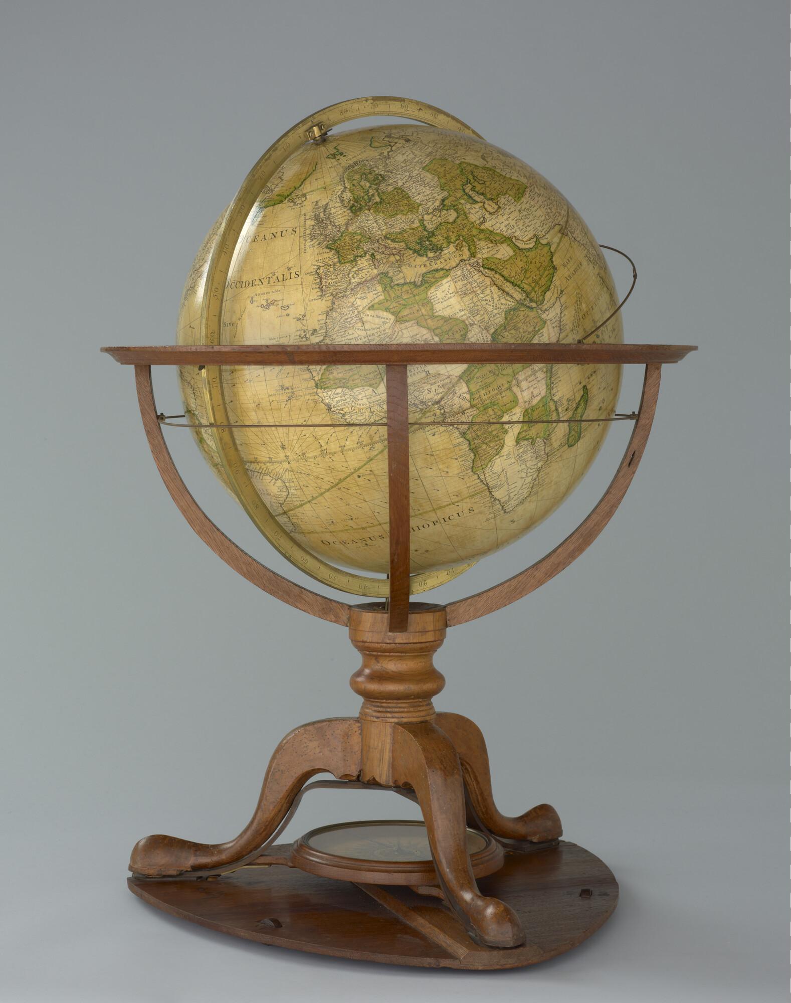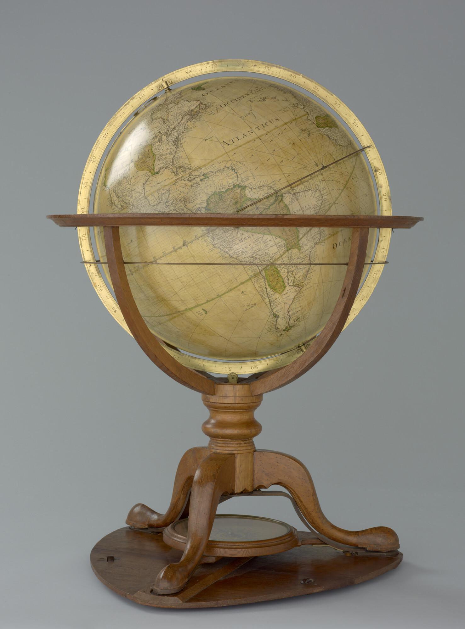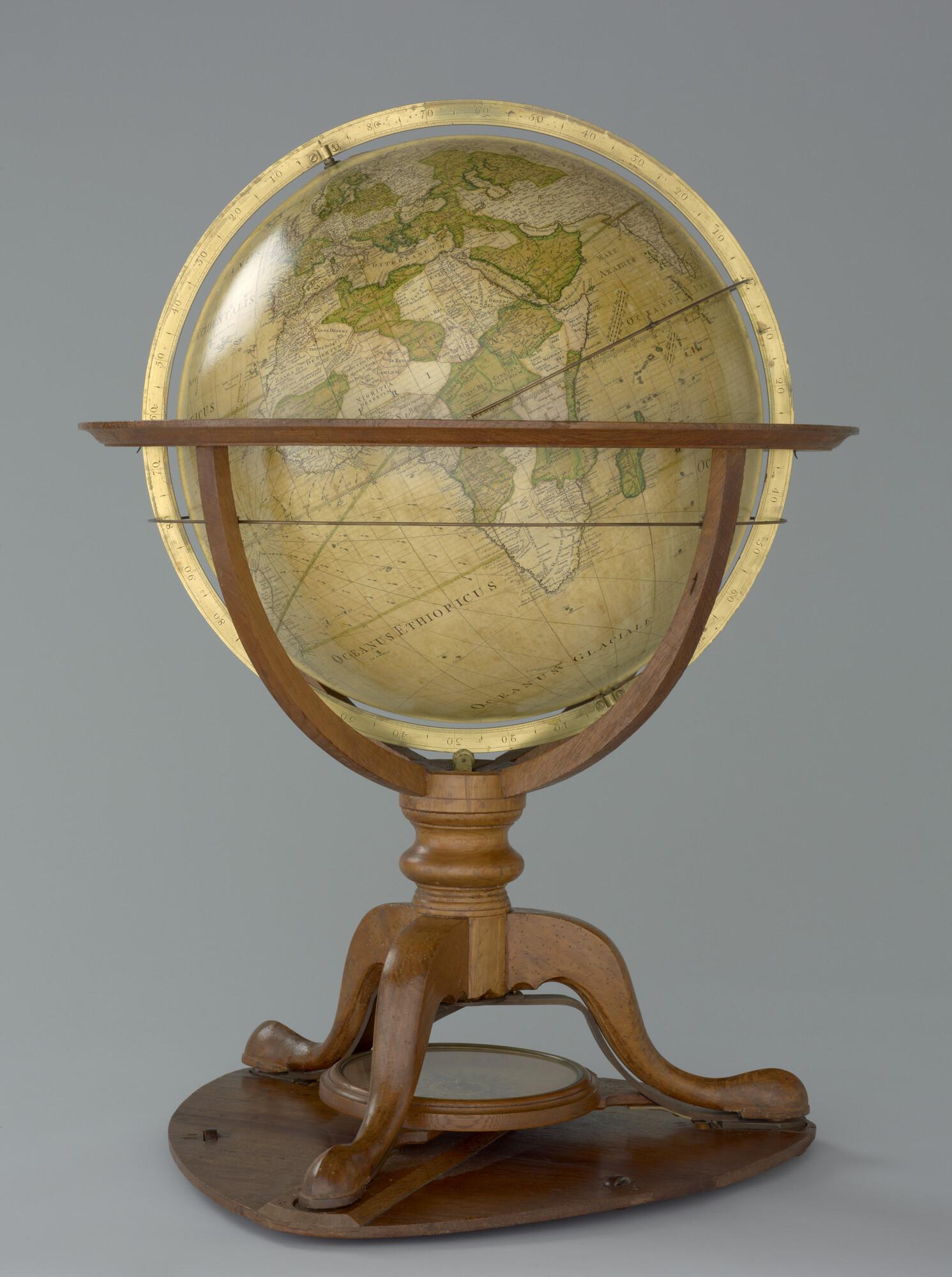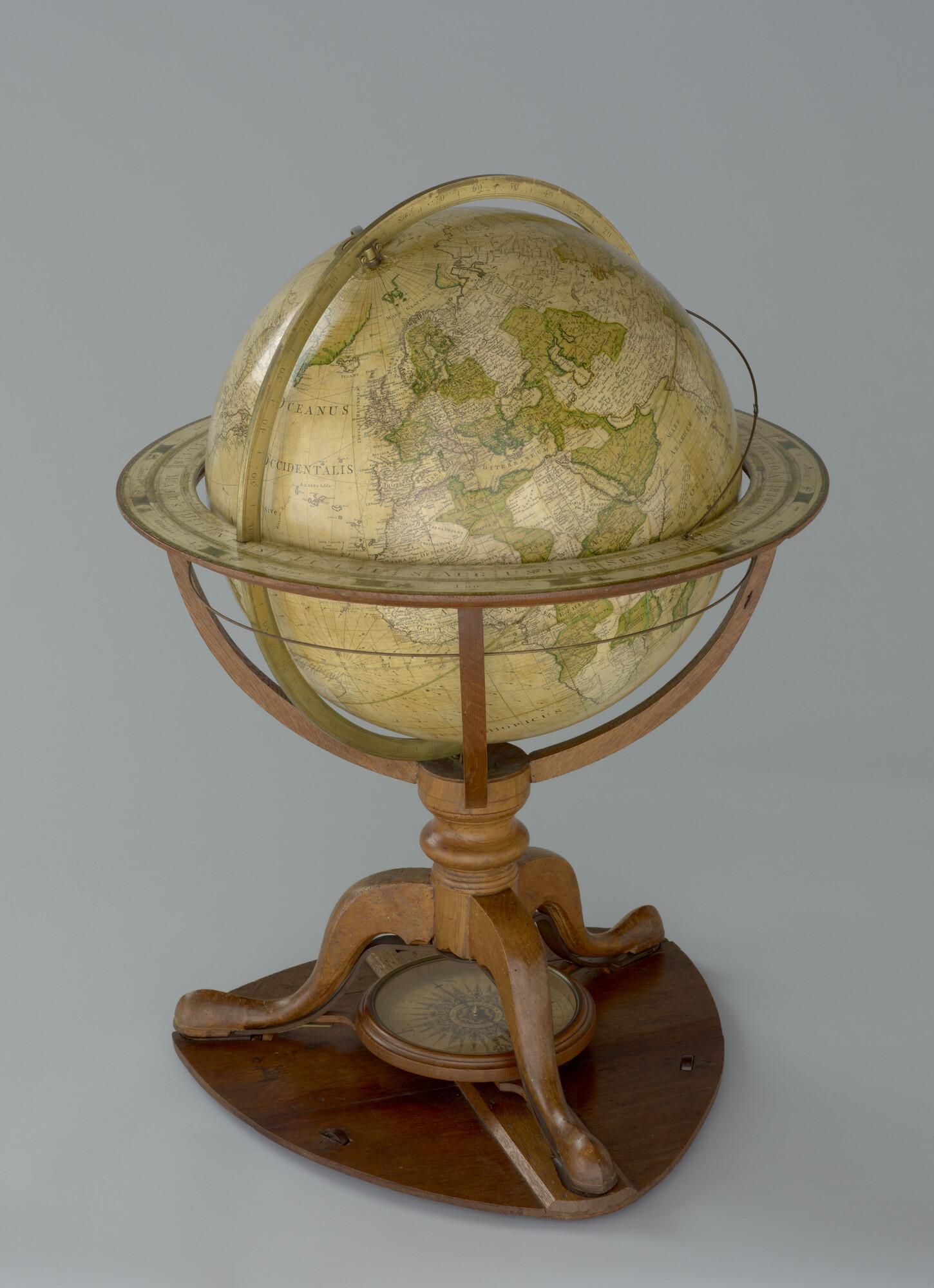Aardglobe van 46 cm. in doorsnede door George Adams, 1766, met opdracht aan Koning George III van Engeland. In originele achthoekige houten kist (schaal 1:27.000.000).