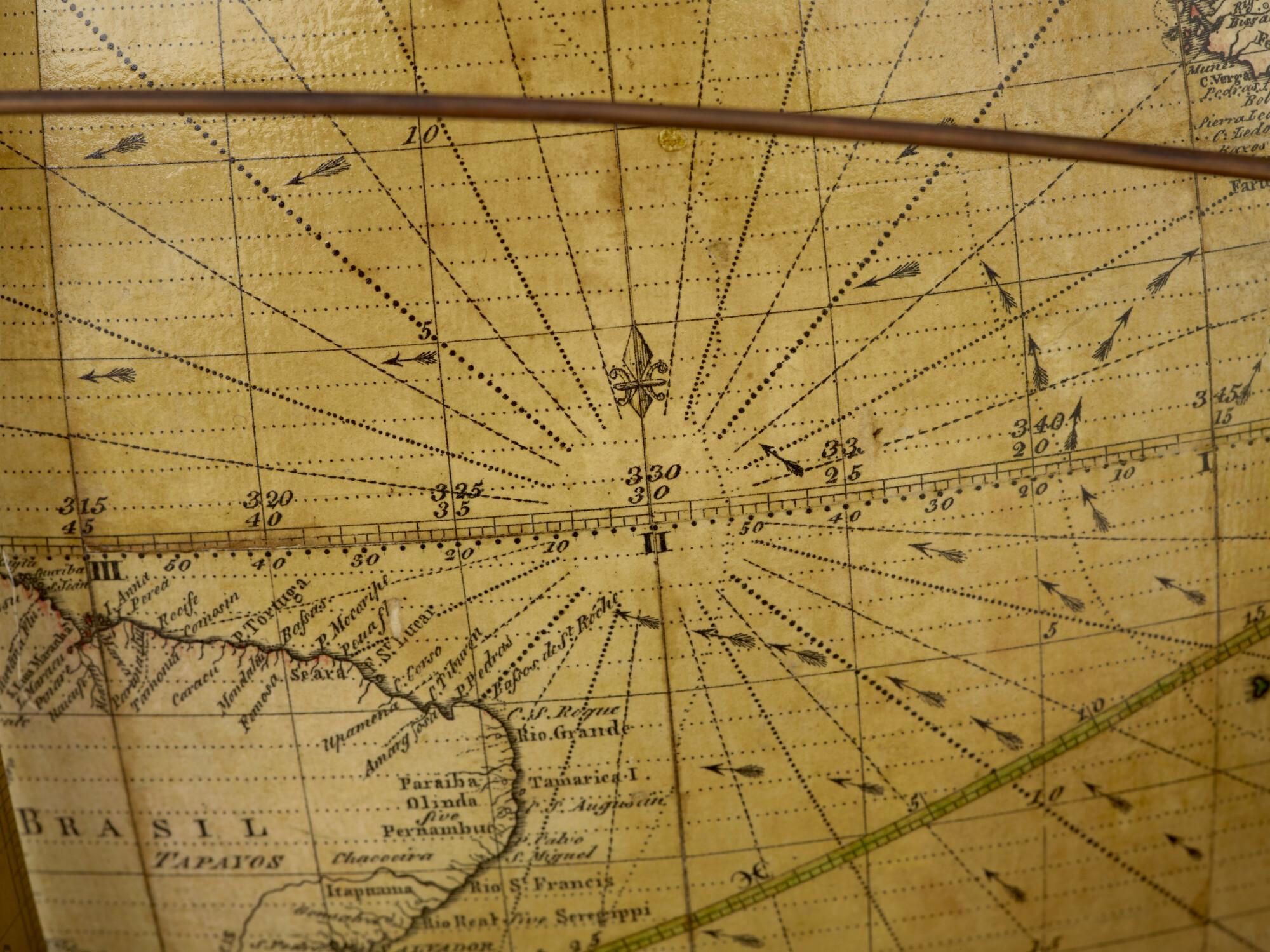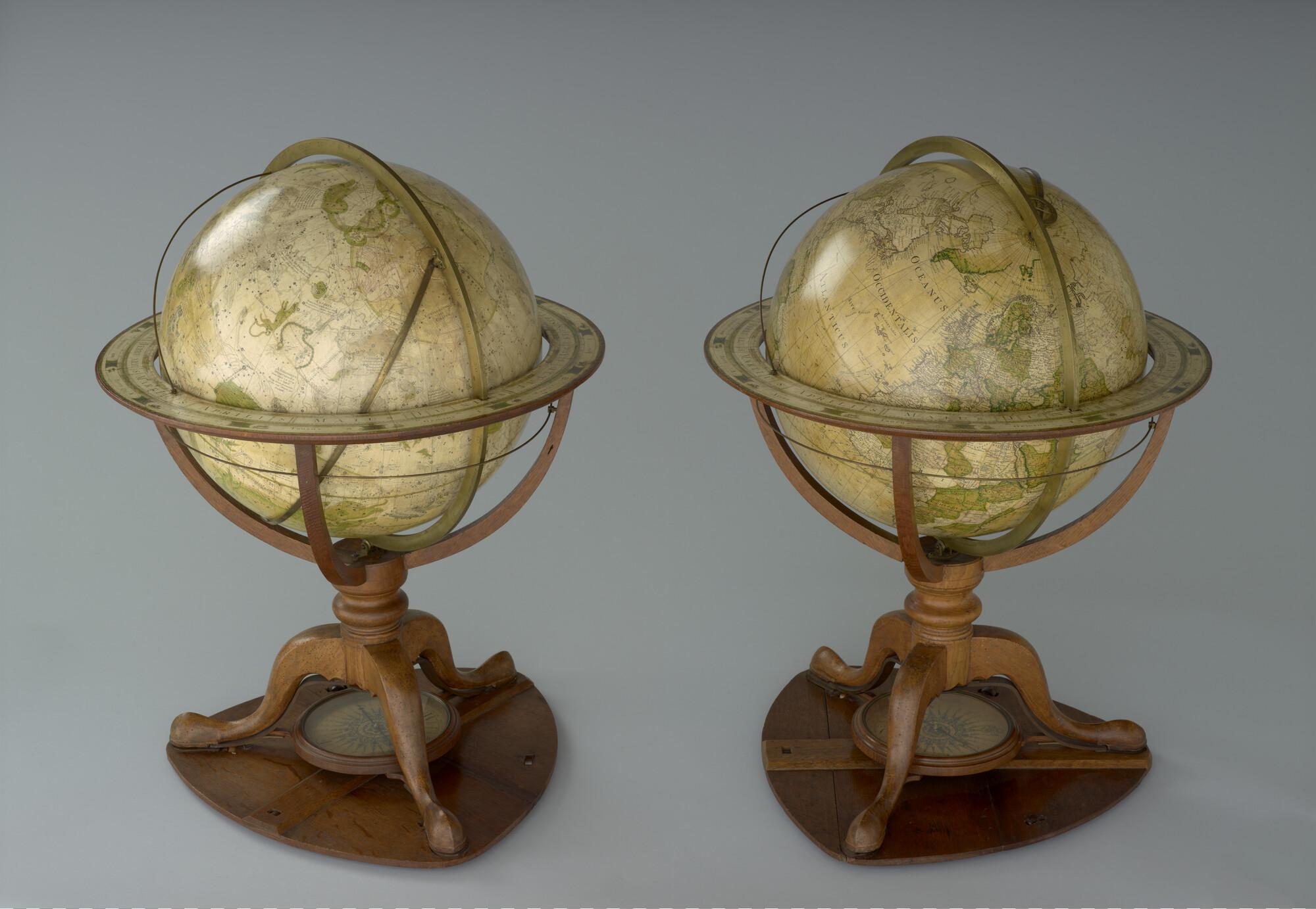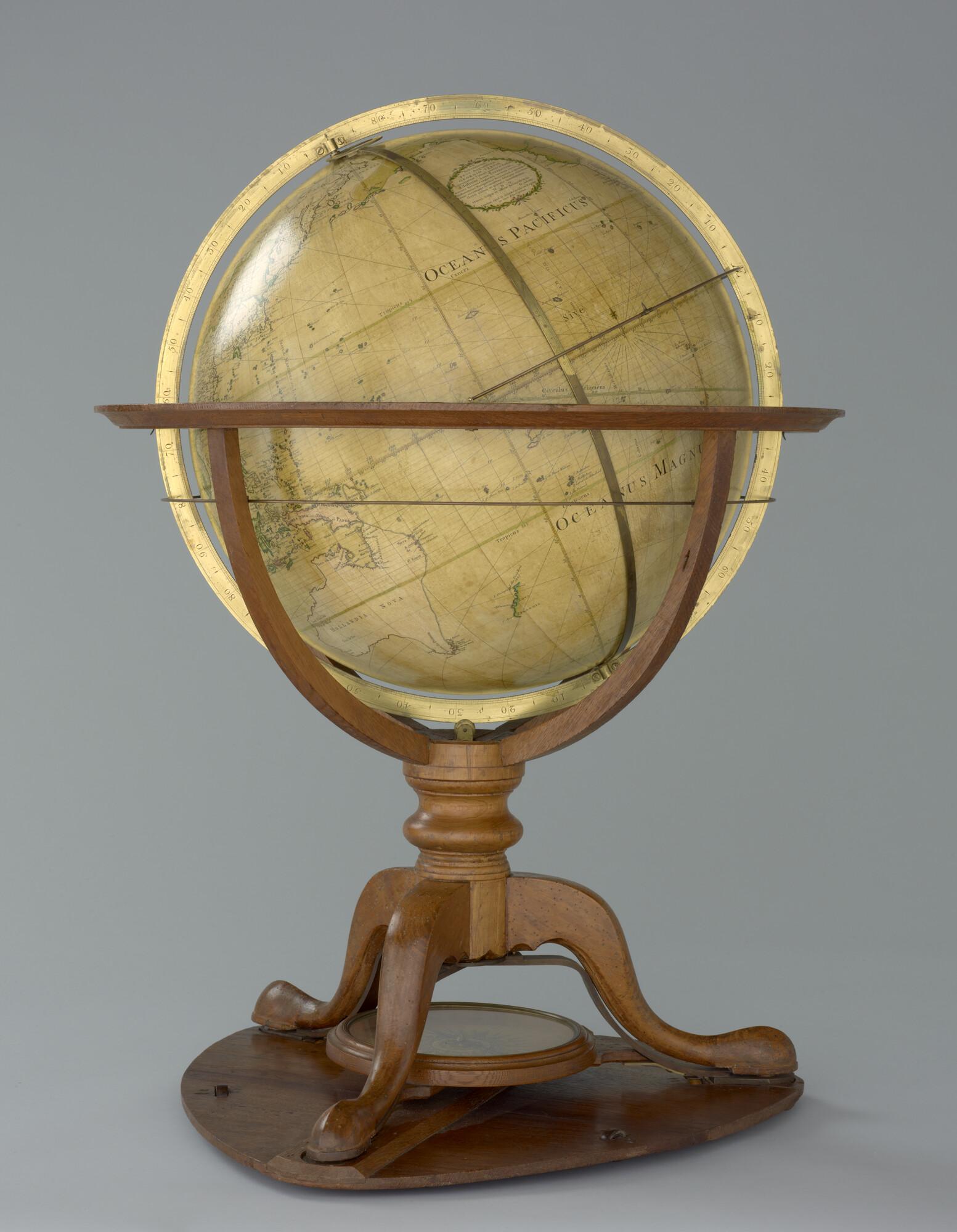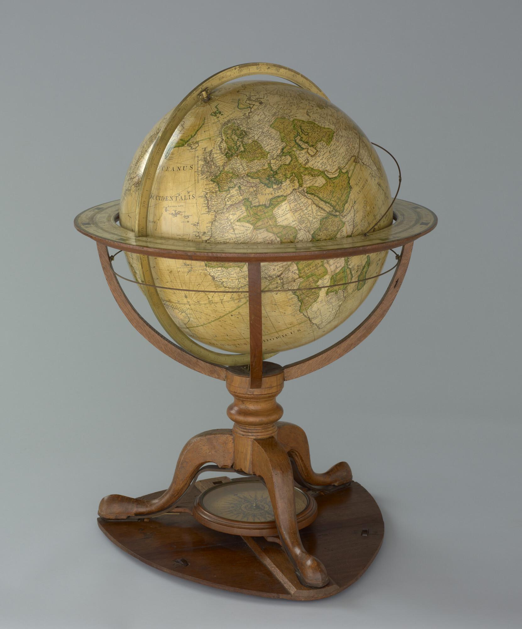 Aardglobe van 46 cm. in doorsnede door George Adams, 1766, met opdracht aan Koning George III van Engeland. In originele achthoekige houten kist (schaal 1:27.000.000).