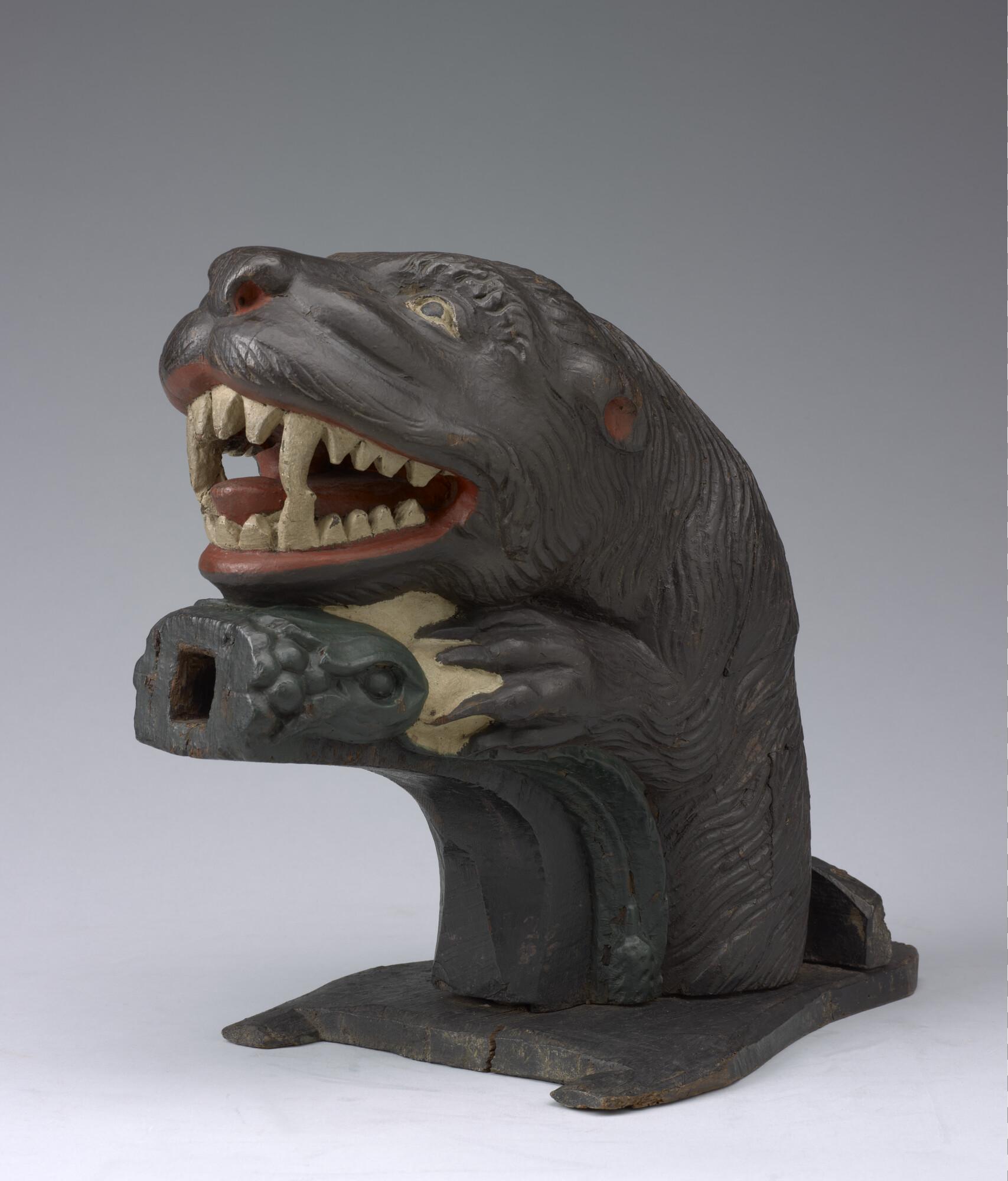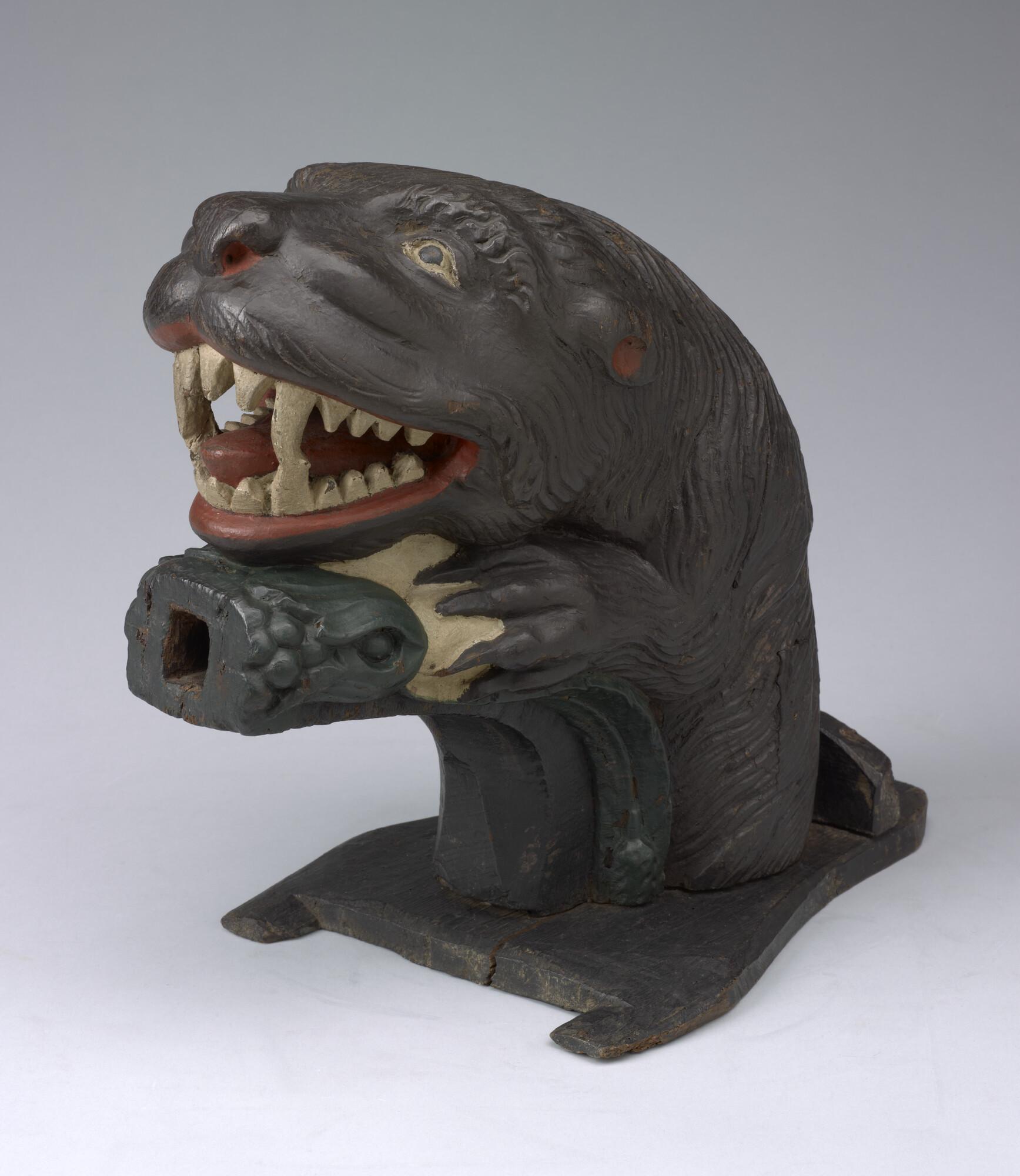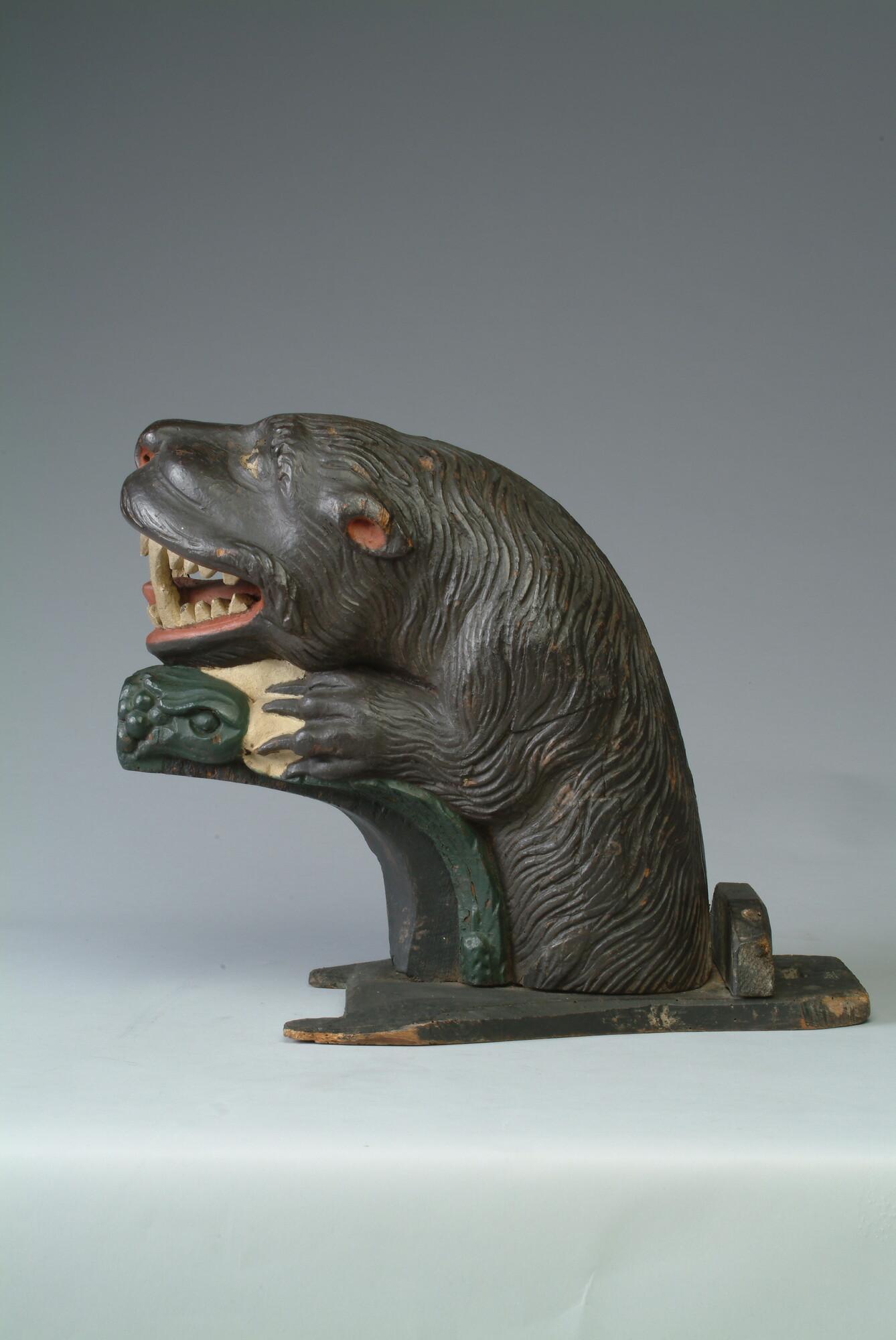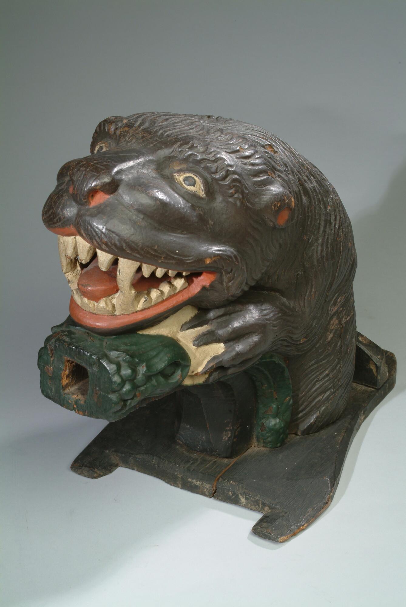 Roerkop in de vorm van een opklimmende bever of otter. Aan de voorzijde van de klik bevindt zich een rechthoekig gat. Het geheel steunt op een houten ondergrond.