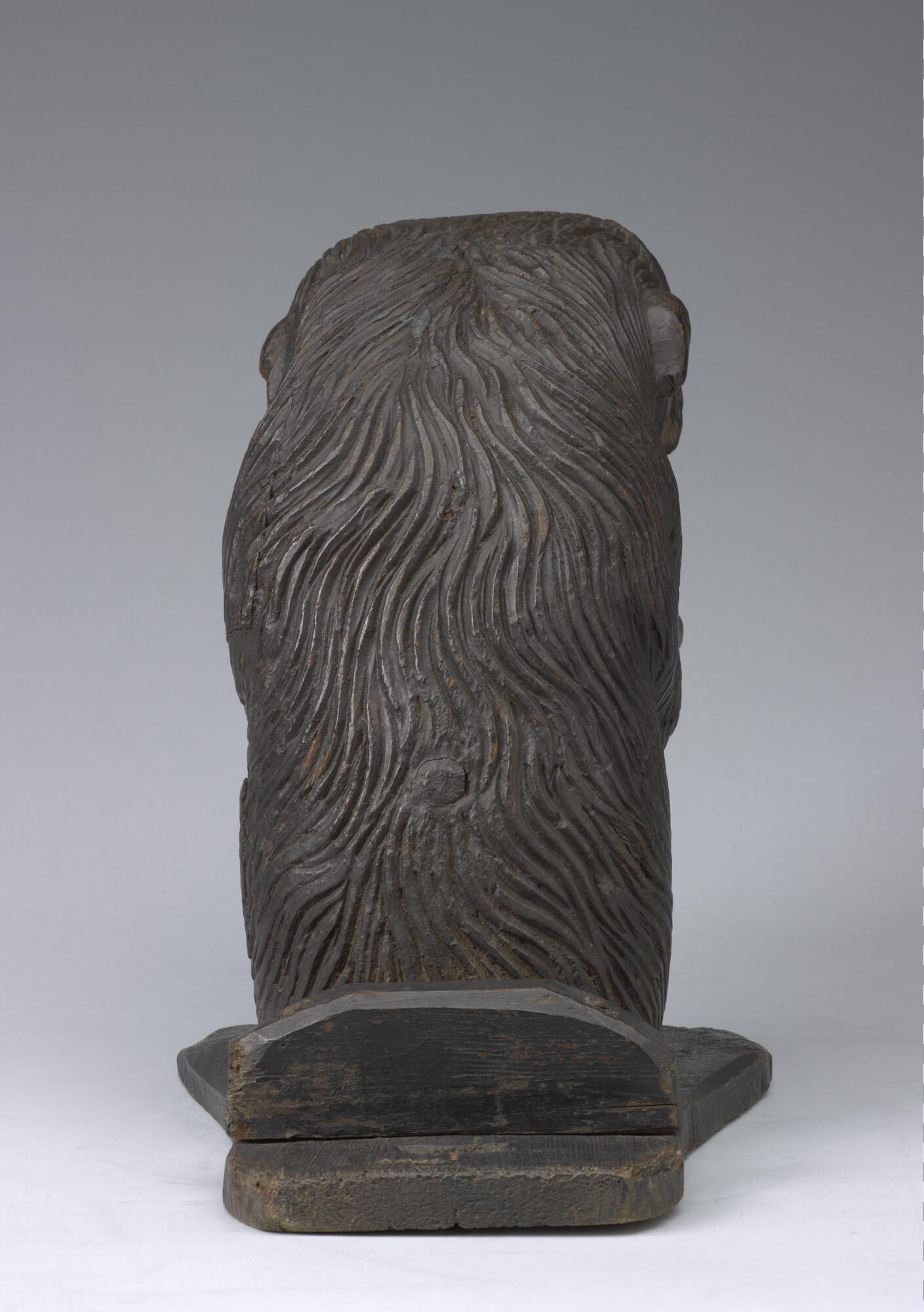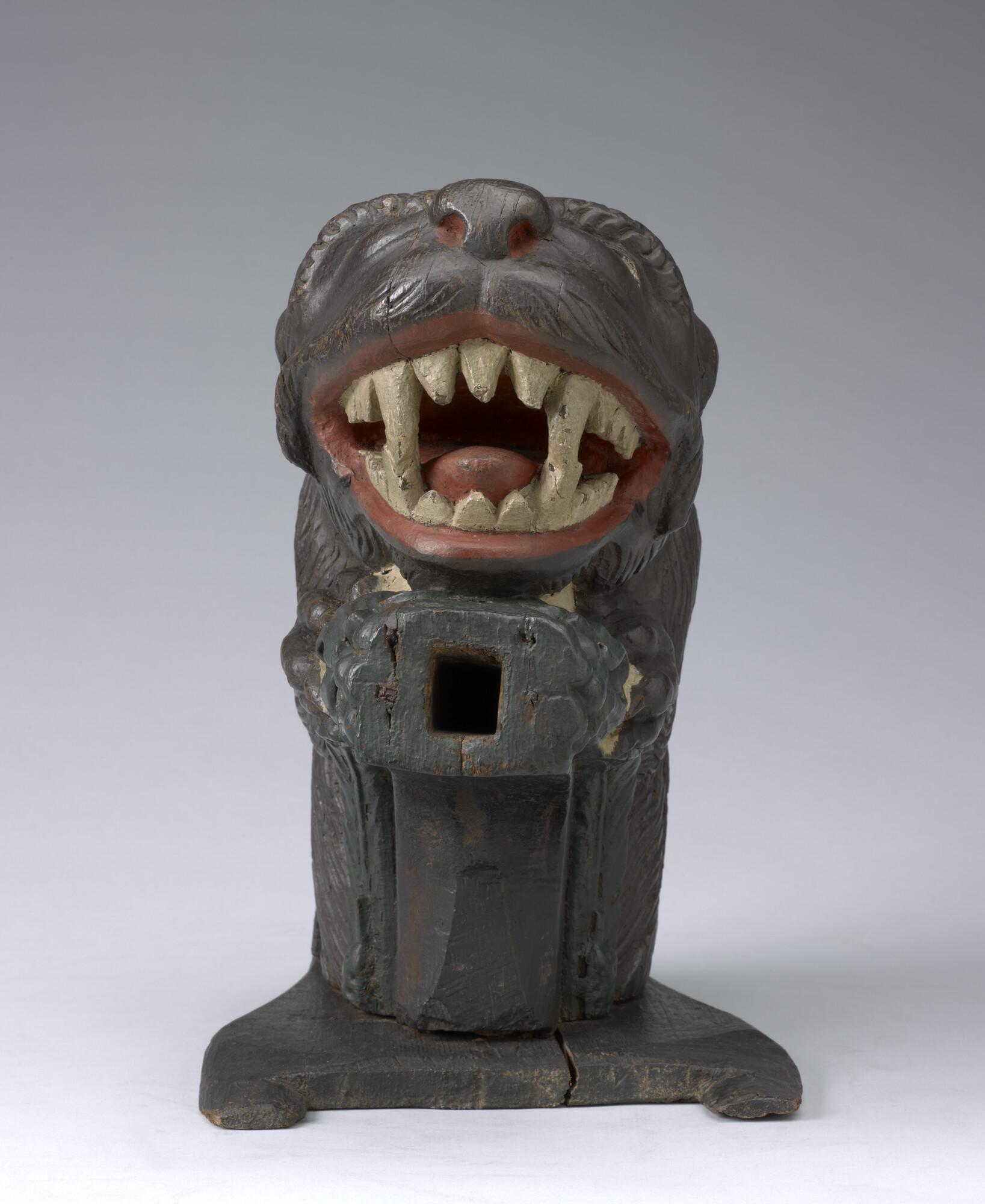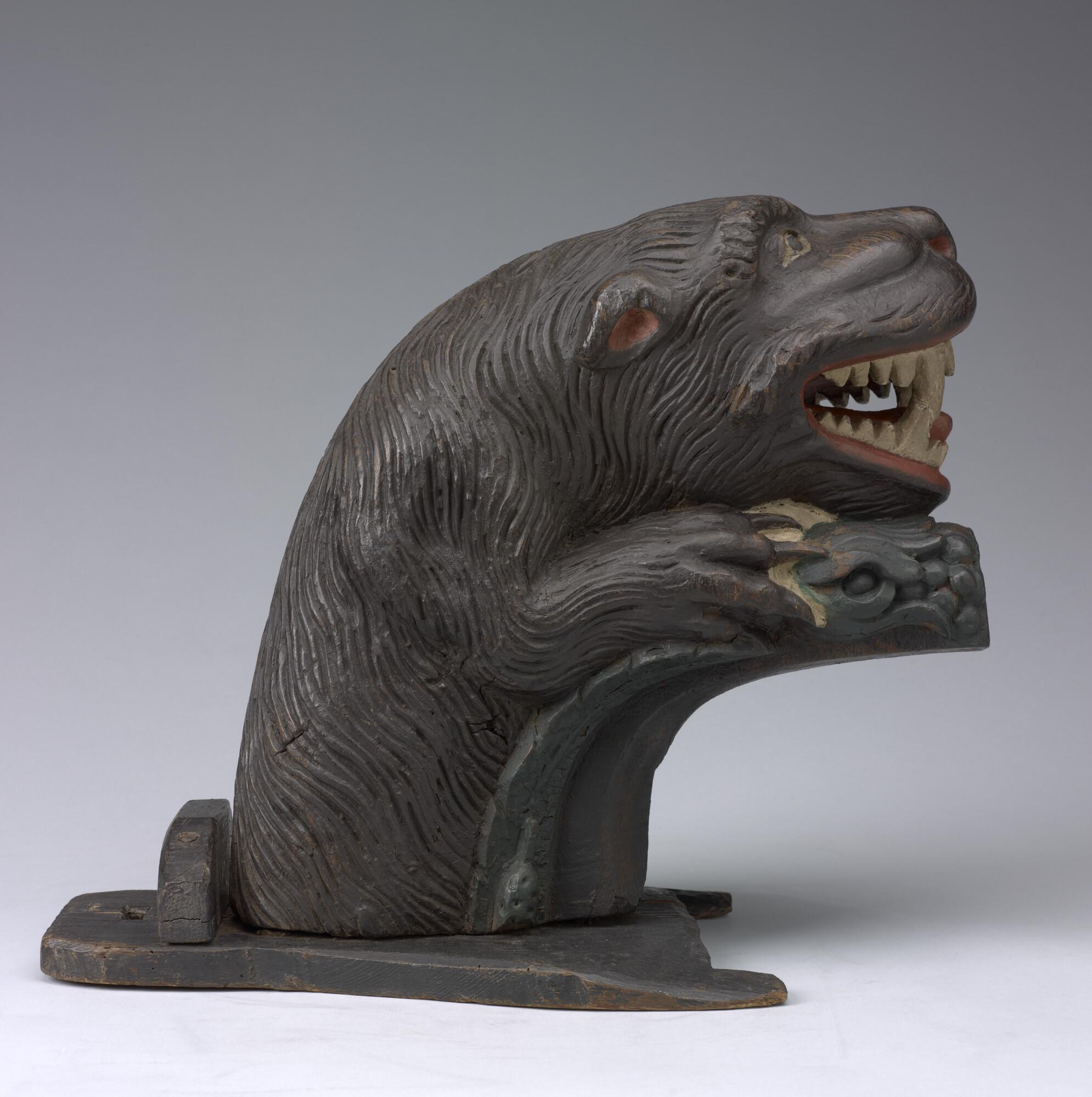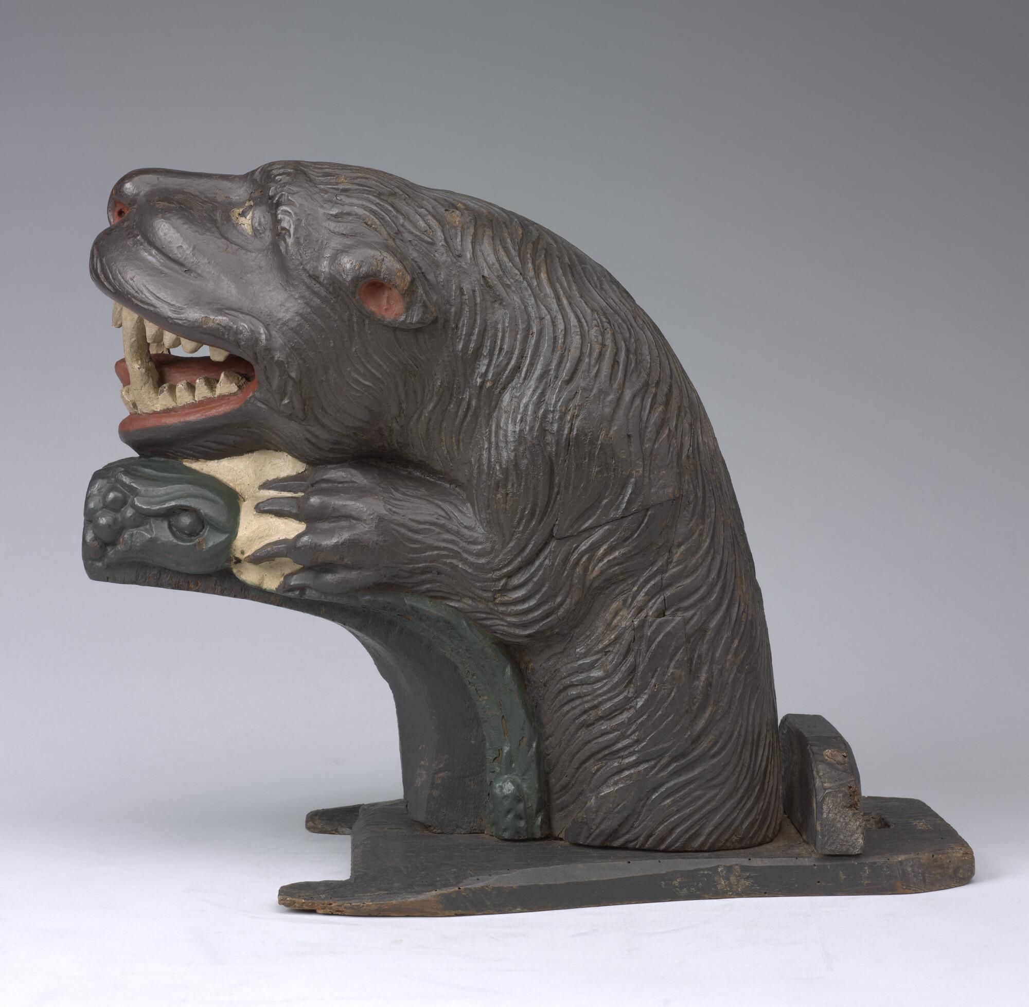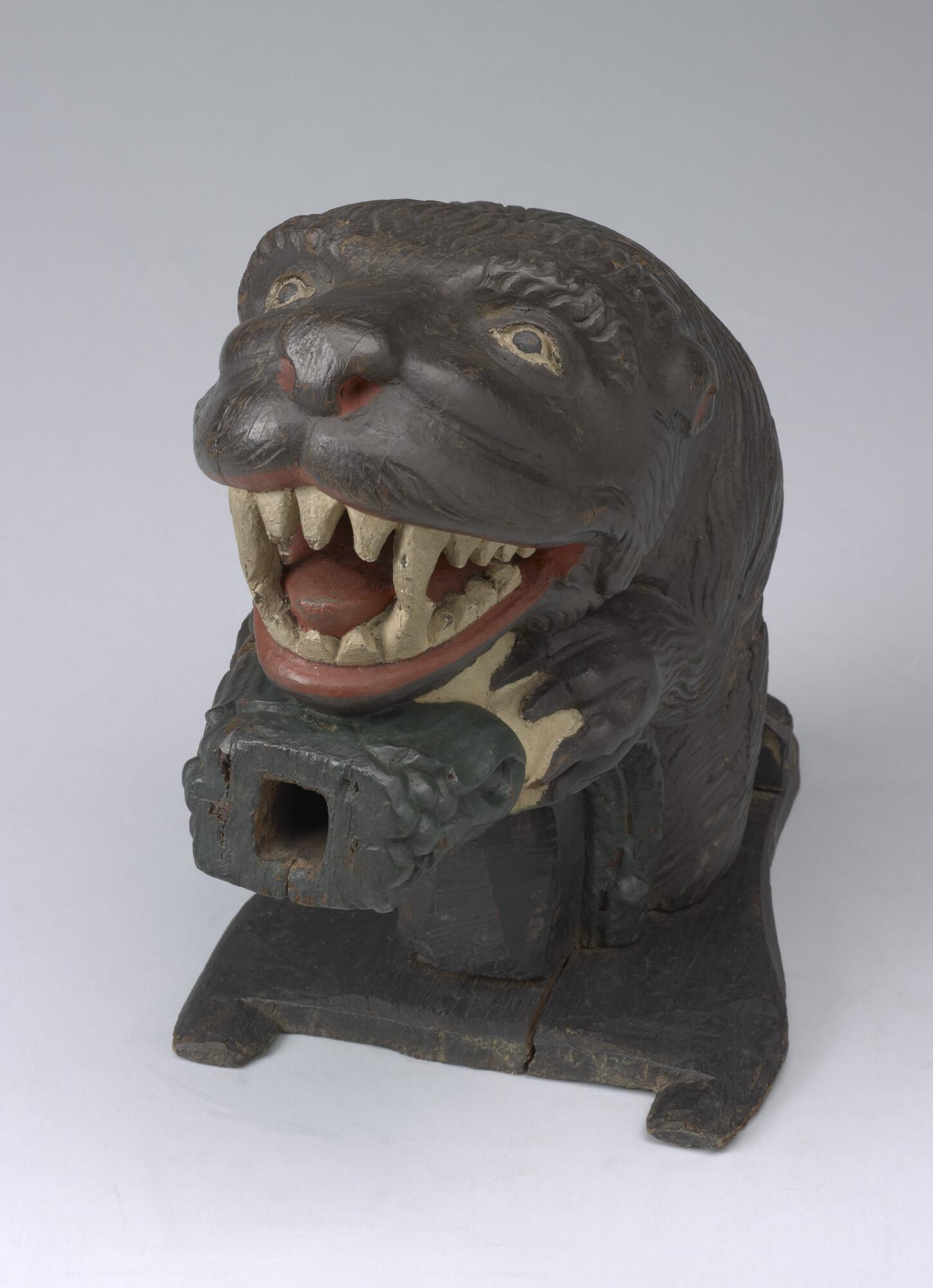 Roerkop in de vorm van een opklimmende bever of otter. Aan de voorzijde van de klik bevindt zich een rechthoekig gat. Het geheel steunt op een houten ondergrond.