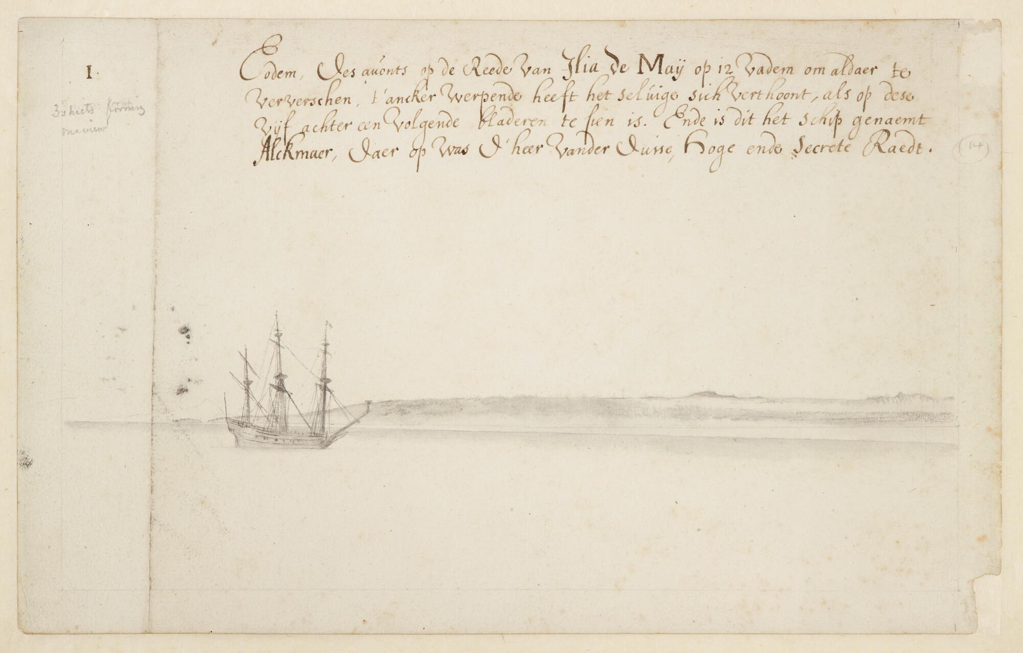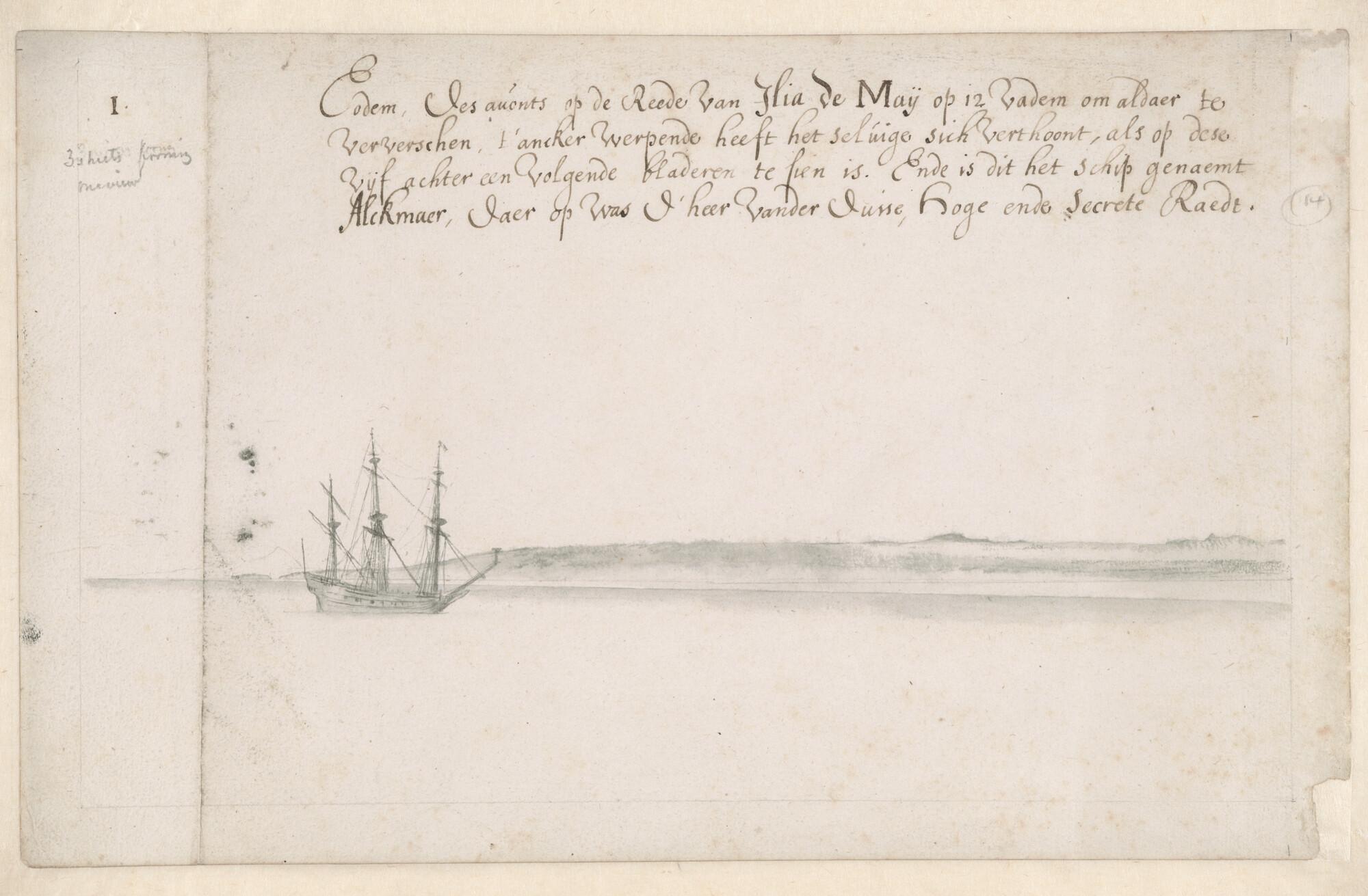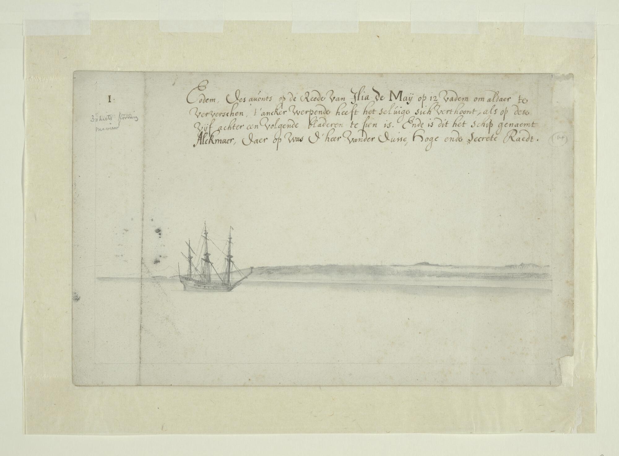 Deel van een landverkenning van het eiland Maio, één der Kaapverdische Eilanden, vervaardigd tijdens de reis van Johan Maurits van Nassau naar Brazilië. Blad 1 (van 5): het schip "Alkmaar" op de rede.
