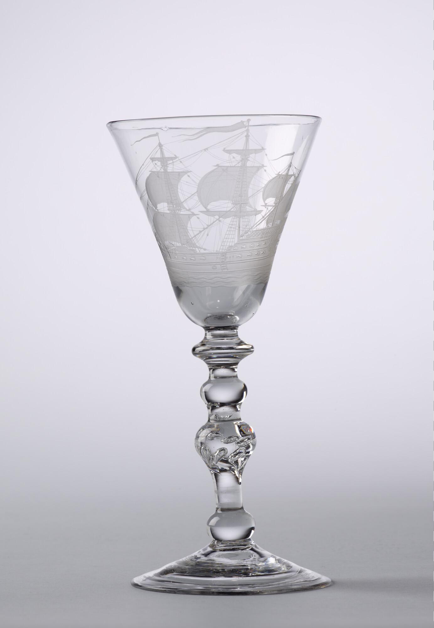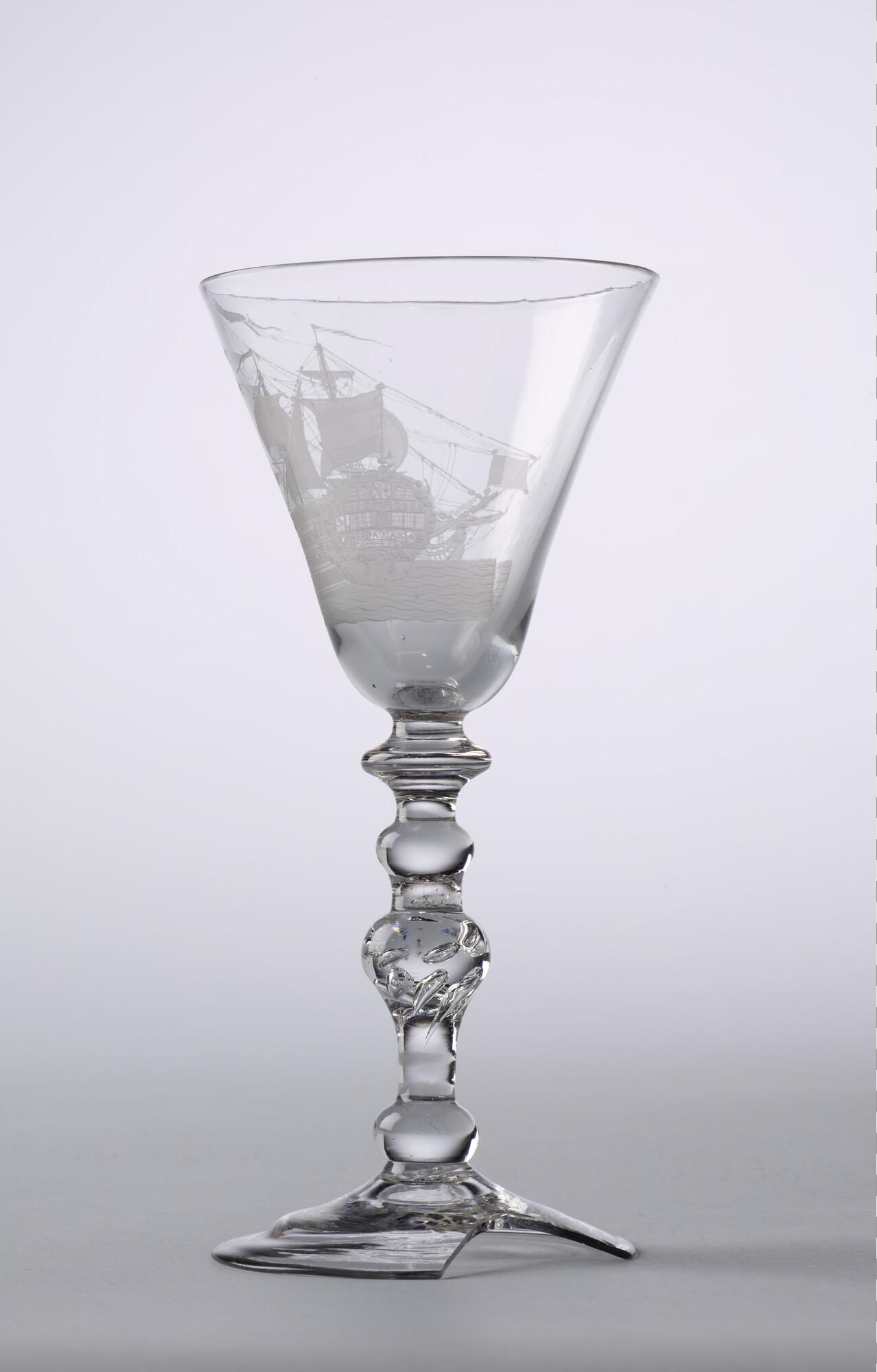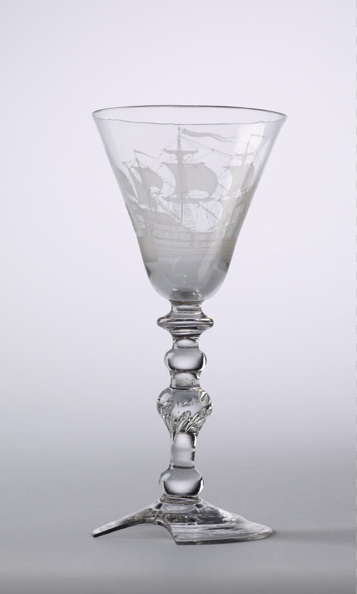 Kelkglas met een radgravure van een driemaster met op de spiegel de naam "D' Alida Maria 1743" en een wapen met een halve adelaar. Uit de voet ontbreekt een fragment.