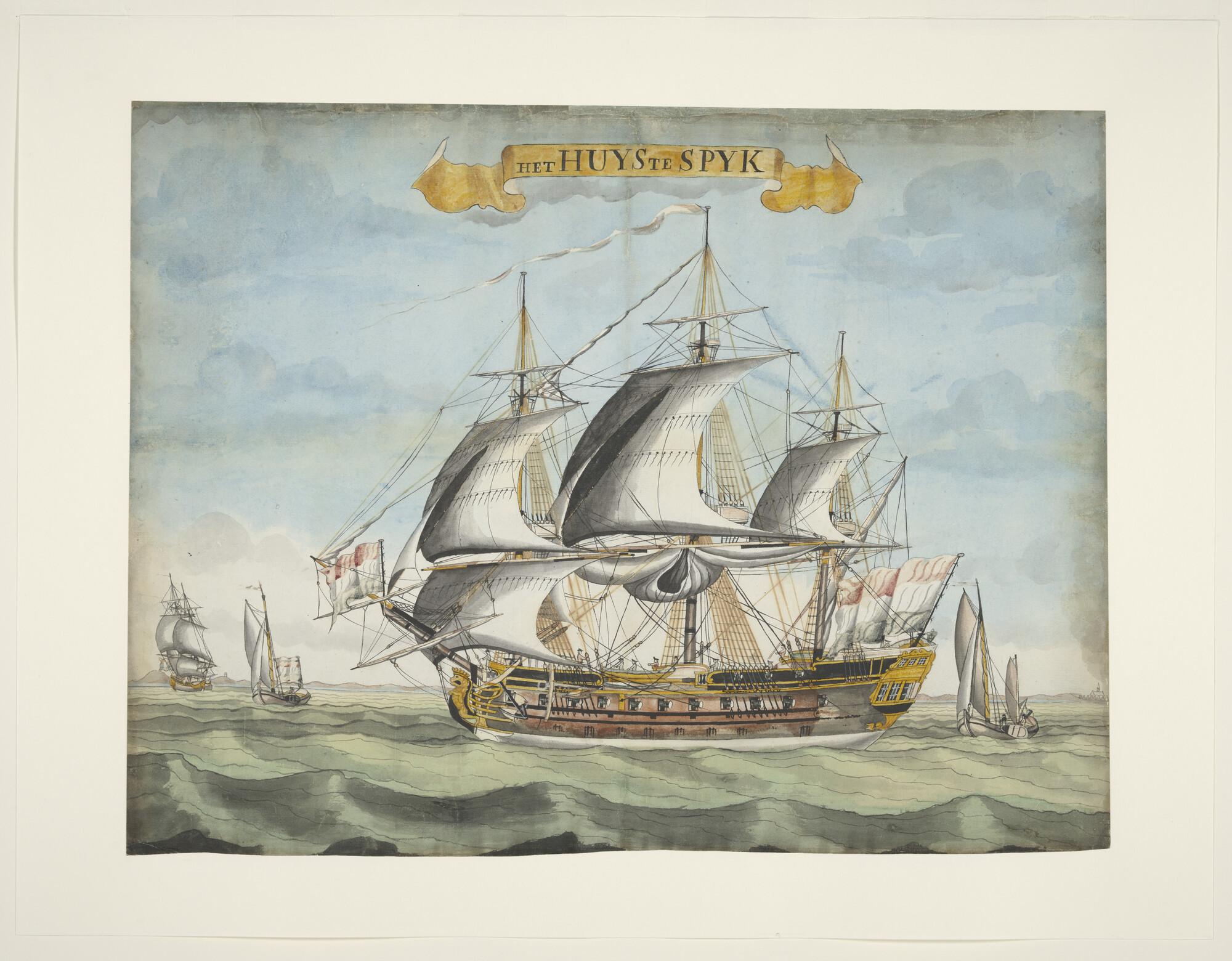 Het retourschip "Het Huis Te Spijk", voor de wind zeilend op de rede van Texel.