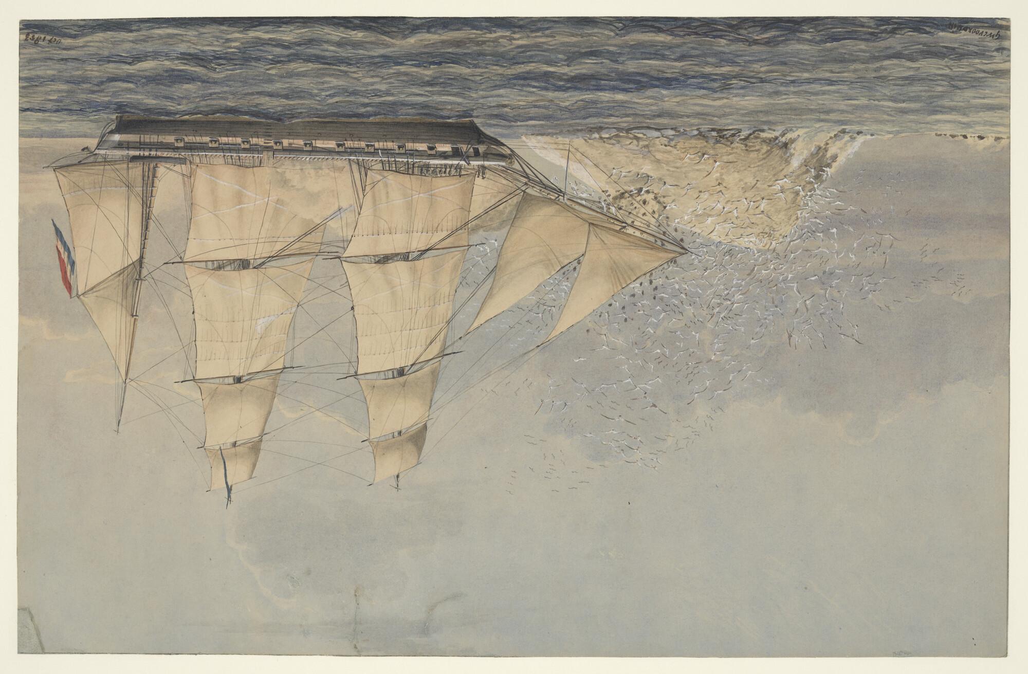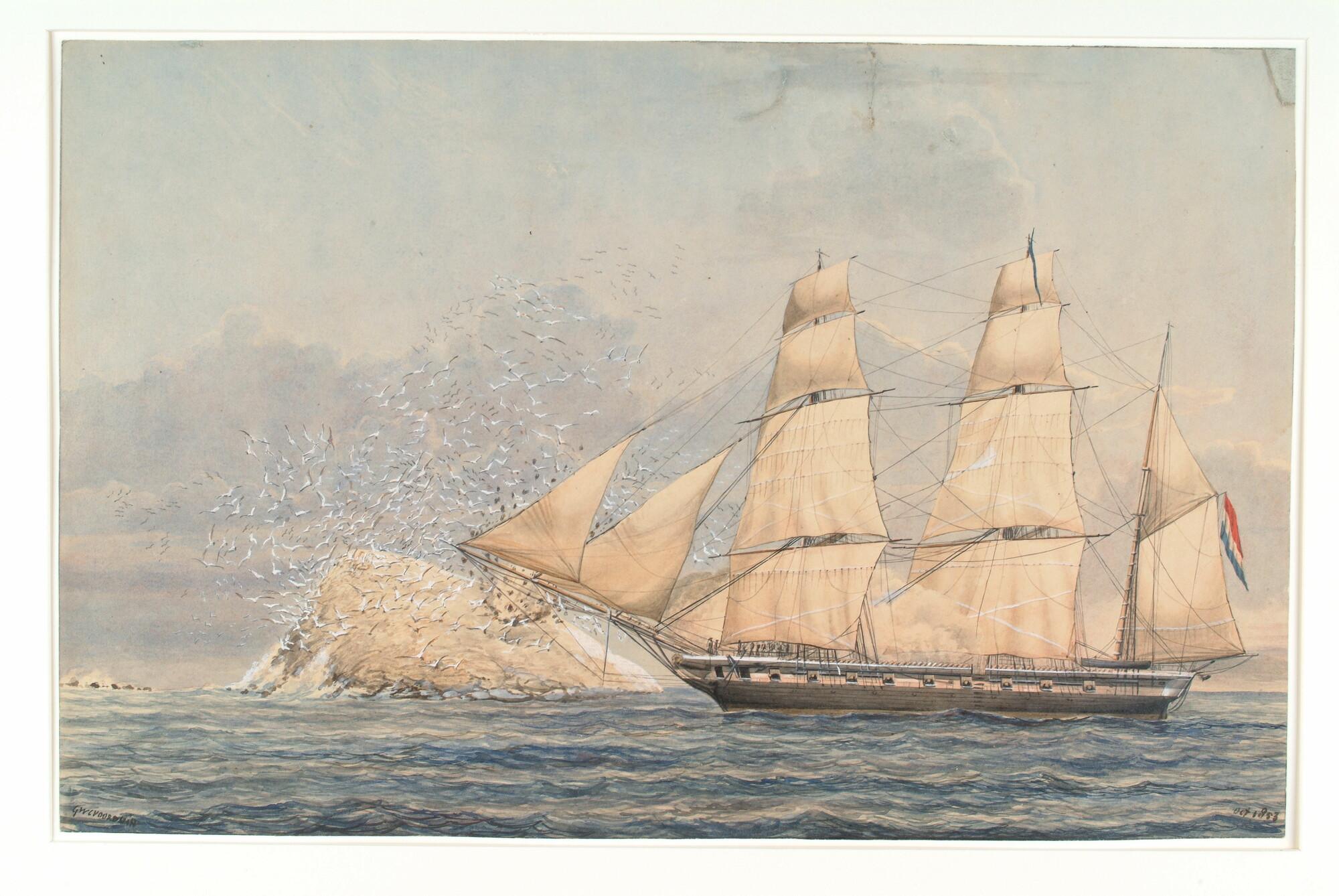 Een oorlogskorvet zeilend langs een rotsachtige kust